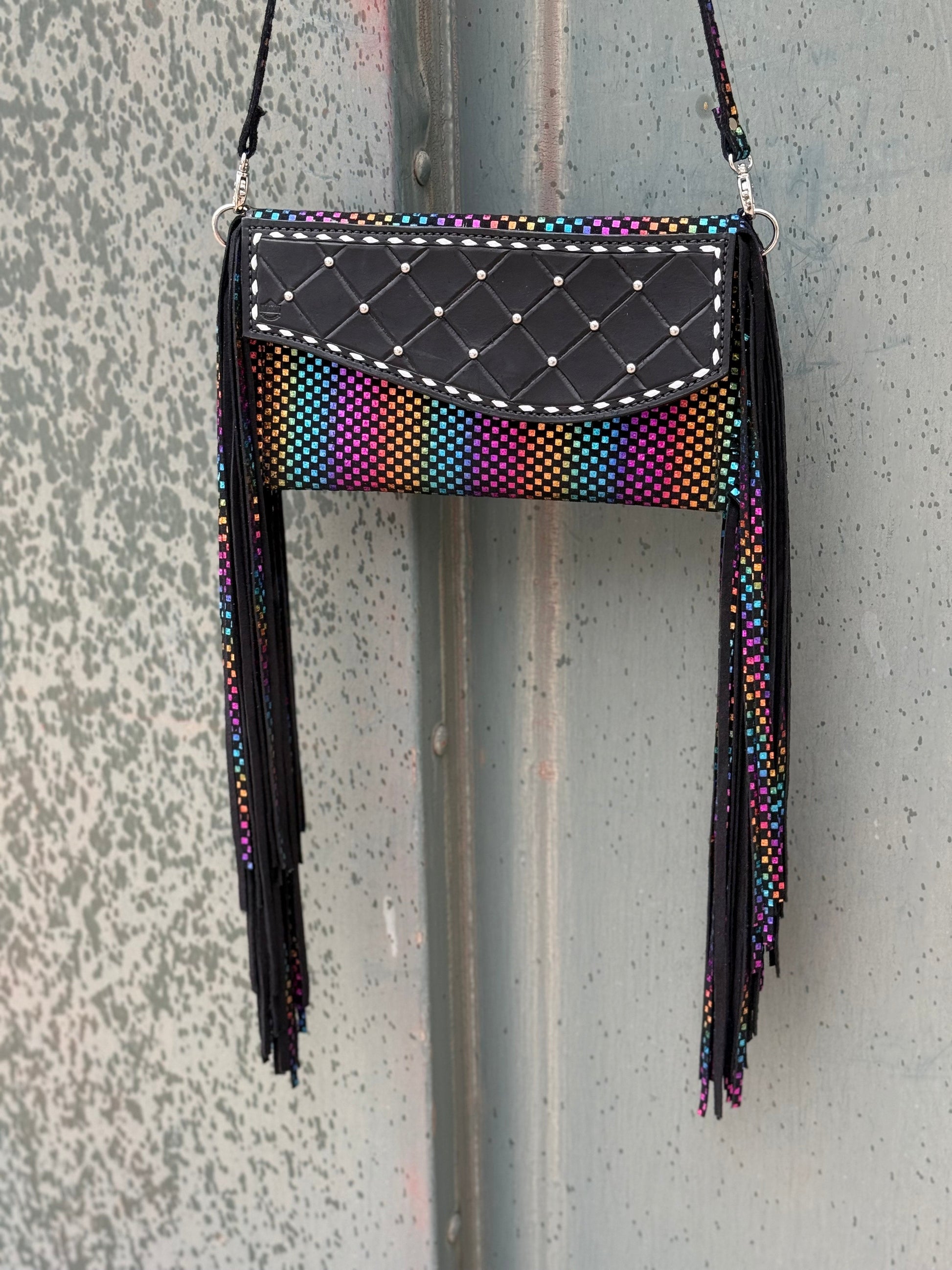 Saddle up for the spotlight with the Neon Rodeo Fringe Clutch. This electric beauty pairs a hand-tooled black leather flap with silver stud details and a dazzling multicolor holographic weave that catches light from every angle. The long black fringe is peppered with rainbow shimmer, making it the ultimate statement for nights that don’t end at sunset.