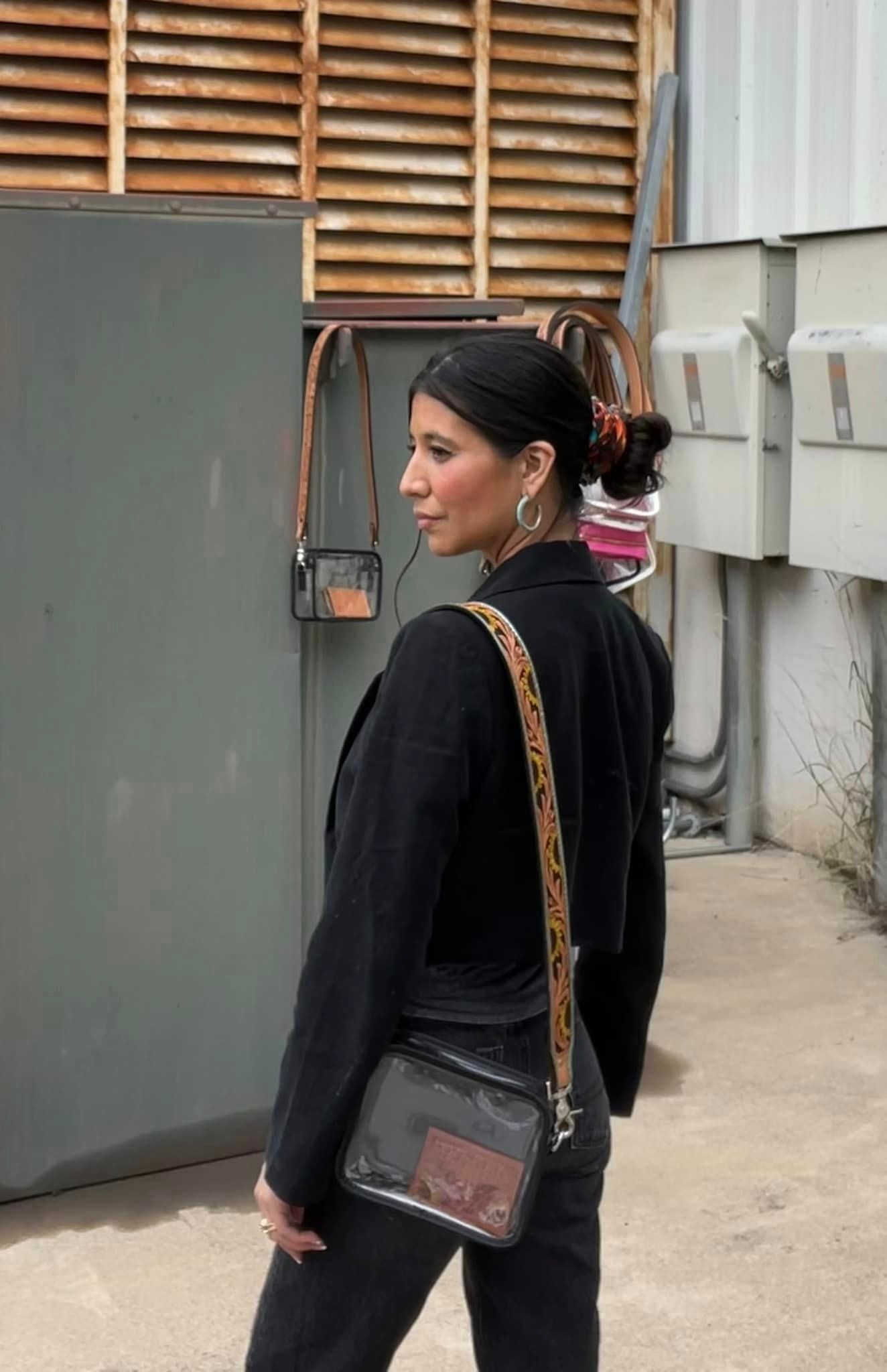 This is our Sunflower strap design, done in golden leather with our hand tool sunflower design with turquoise shimmer border.