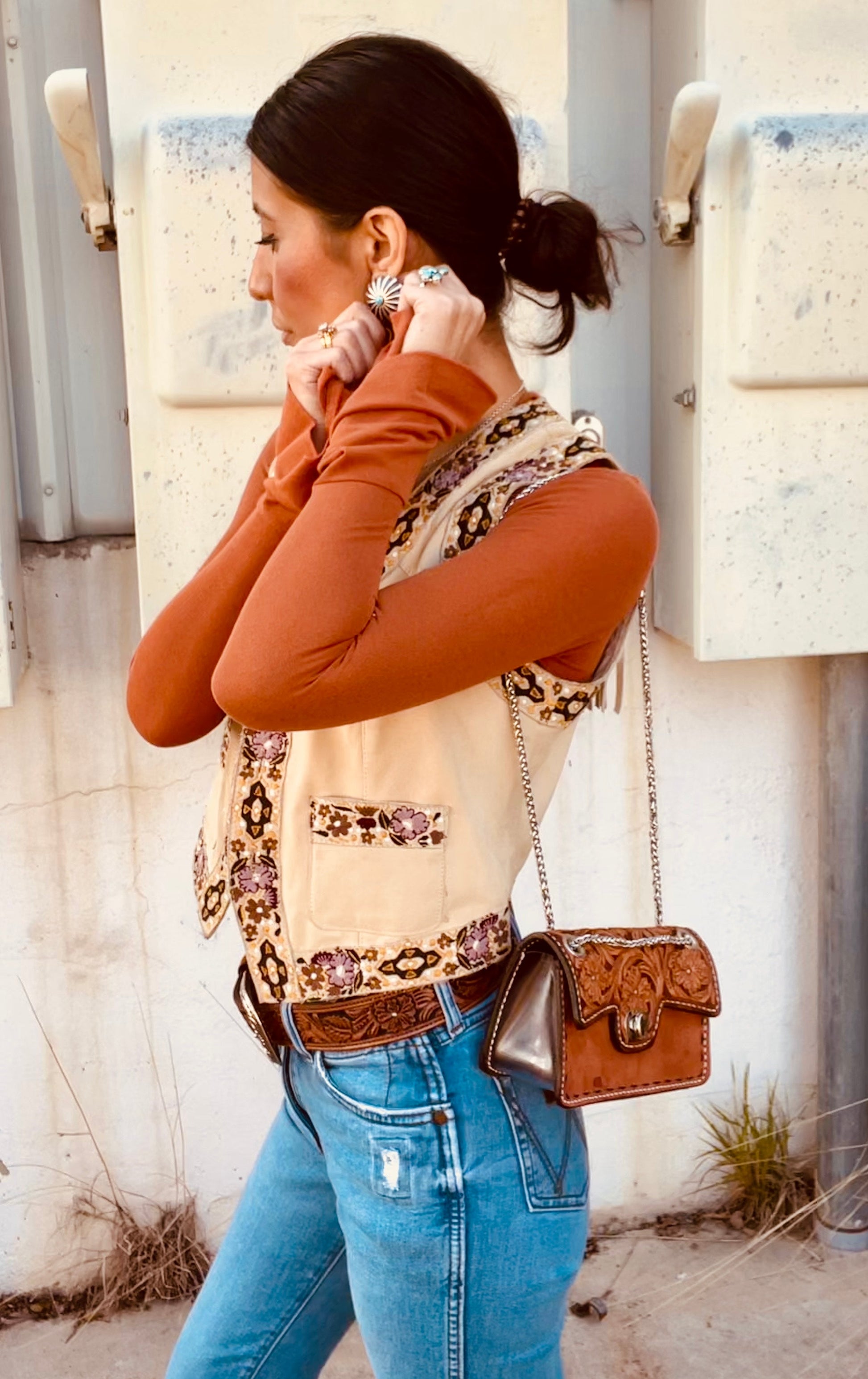 Handbag mixes of toast roughout and golden leather with hand floral tooling. It has an adjustable designer chain. You have the option to have a short chain or long chain when wearing this. These are NFR APPROVED! With its clear material on the sides and the bottom of this clutch!