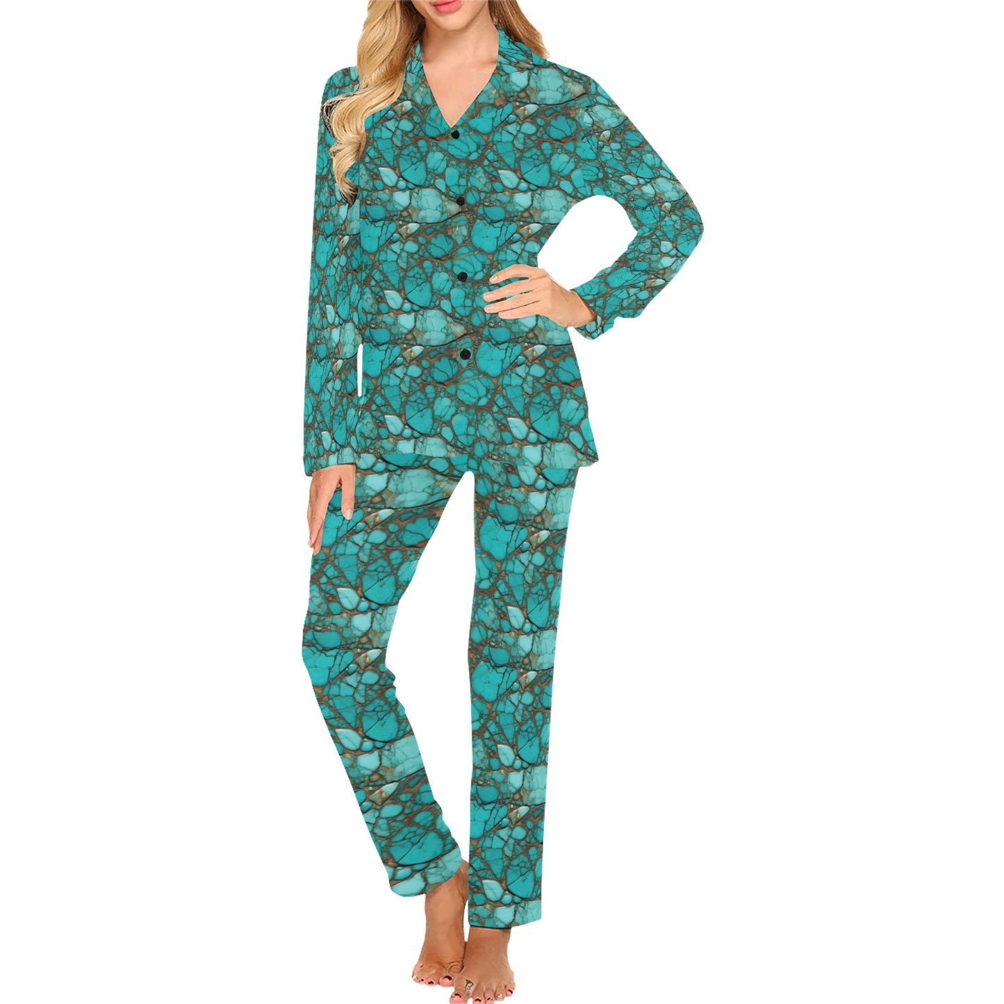 - Top features a notch collar, long sleeves, and front button closure. Trousers feature an elastic waist and two-sided pockets. Two piece set. Comfy and smooth fabric. The women's two-piece pajamas are breathable and skin-friendly.