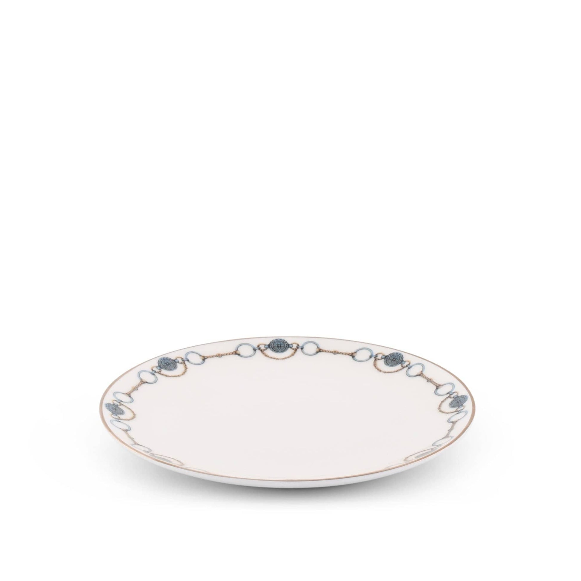 Designed by master artist, Leesa Greenlee, this iconic china pattern boldly pairs the classic Concho design found in precious metal jewelry and leatherwork across the American West with a traditional wire type snaffle bit. Our delicate but resilient bone china is hand glazed and painted with a finishing gold rim. (Some screens may make the silver appear blue.)