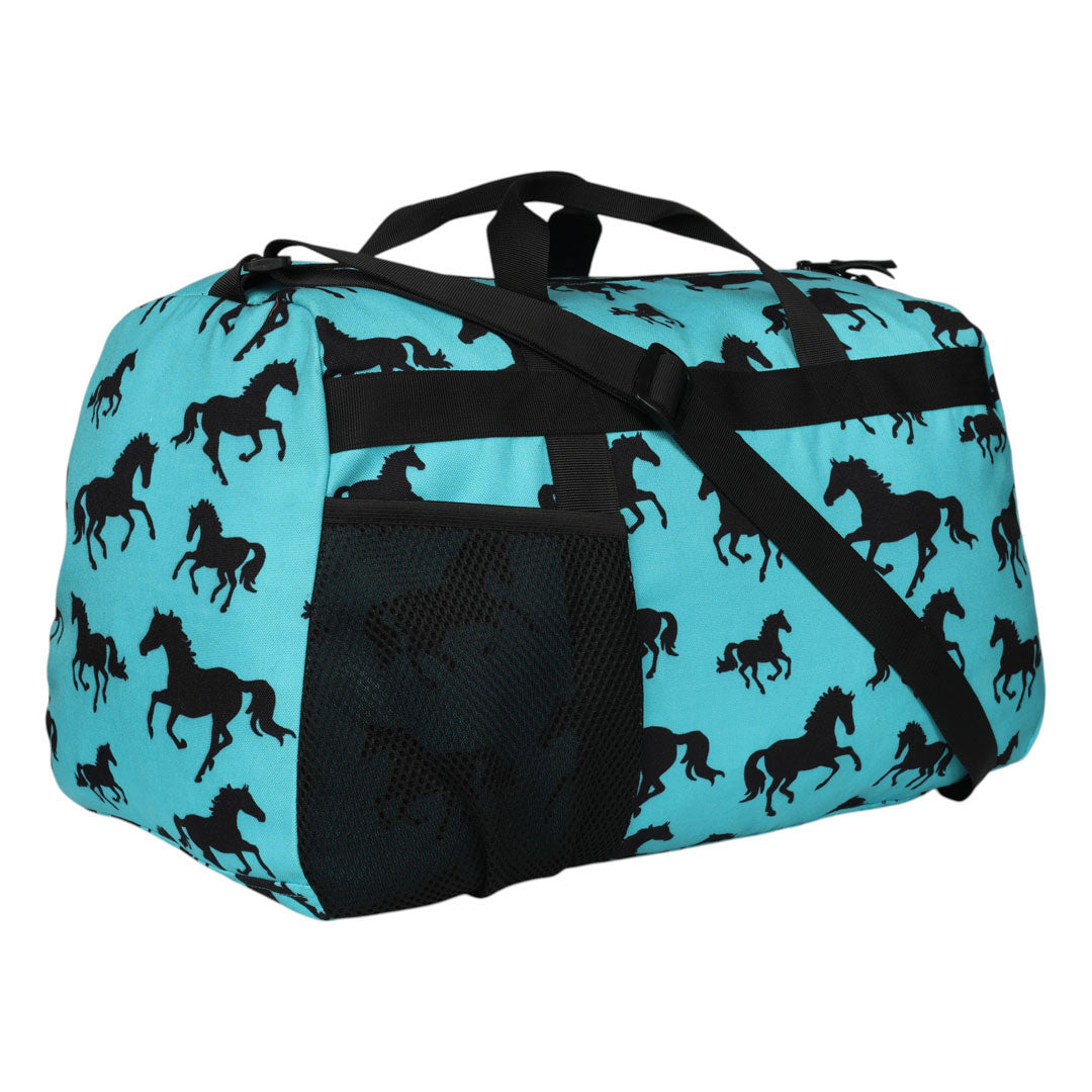 The AWST Int'l Lila Silhouette Horse Duffle is the perfect size for a helmet bag and barn sundries or an overnighter. An all purpose duffle made of 600D Polyester with a large zippered main compartment with heavy duty dual zipper. Designed with an inside divider pocket & front mesh pocket for easy organization. This stylish duffle is ready for traveling with the adjustable shoulder strap and grab handles. Measures 18"L X 11"H X 9"W