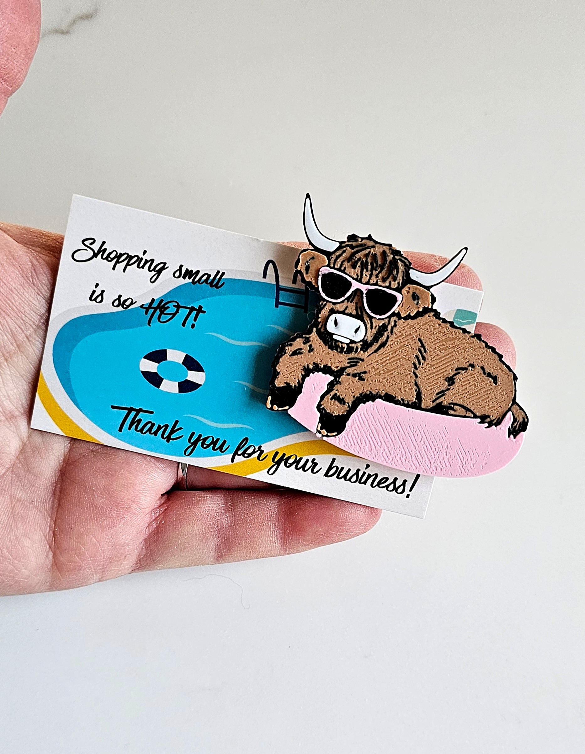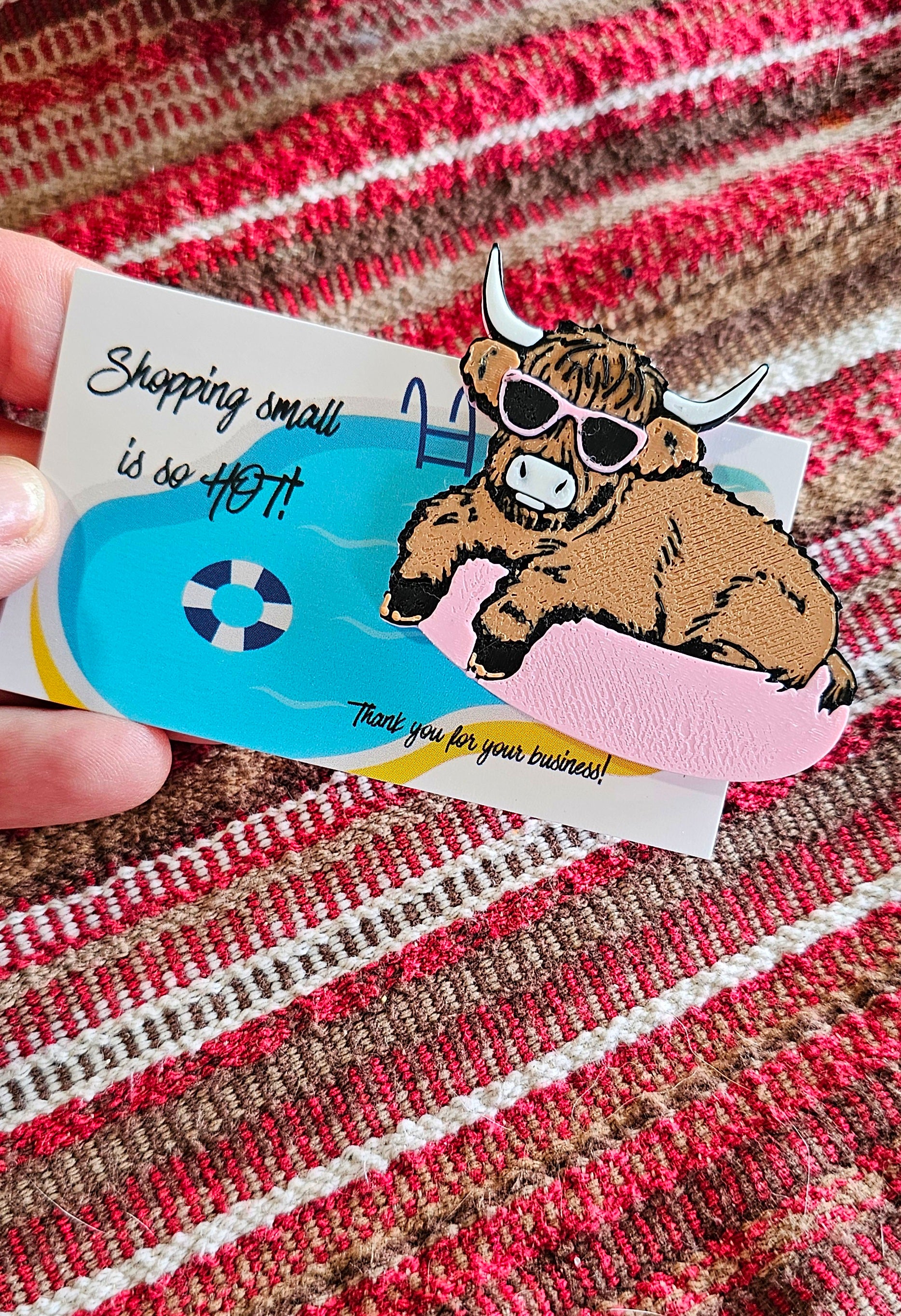 This one is a real cutie -she is one "hot" cow sitting on a pink pool floatie! The card is a swimming pool scene and says "Shopping small is so HOT!" and Thank you for your business. These would be great for the warmer months coming up! But who cares - Highlands are perfect any time! Isn't she cute??