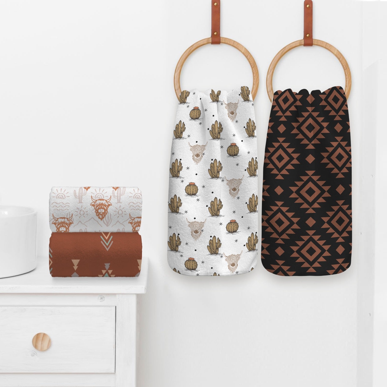 Bring rustic charm to your kitchen with our adorable Highland cow-themed dish towels. This charming set of four features the beloved Highland cattle that embody the spirit of the American West. Crafted right here in America, these soft, absorbent towels blend practicality with personality—perfect for drying dishes, wiping counters, or adding a touch of whimsy to your kitchen décor. Whether you're a ranching enthusiast or simply love the cozy appeal of Highland cows, these towels make everyday tasks more delightful while supporting American-made quality.