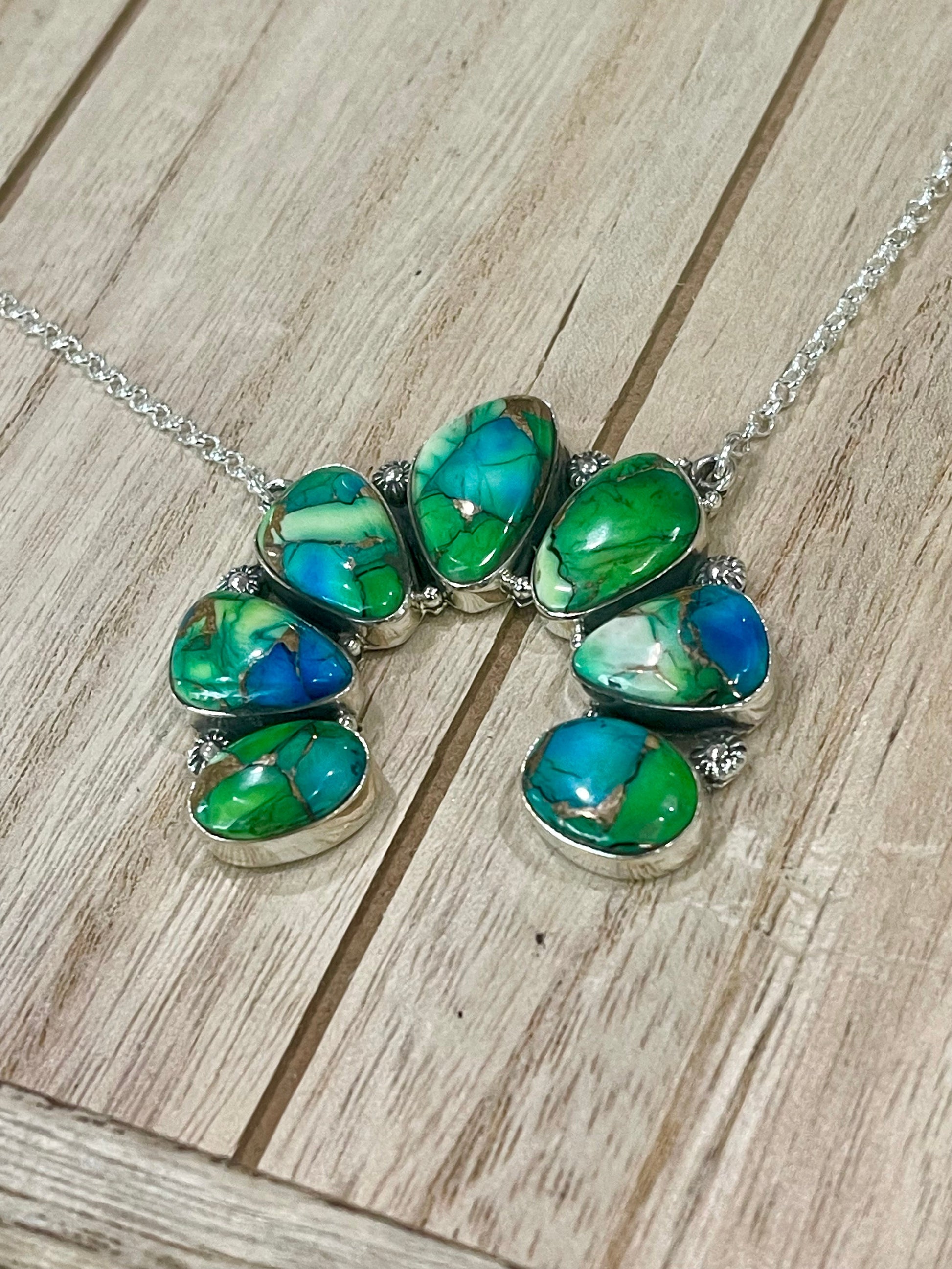 Beautiful stones. Beautiful details. Really great necklace! . Chain measures 18-20 inches. Add an additional 1 3/4 inches long & 2 inches wide for pendant.