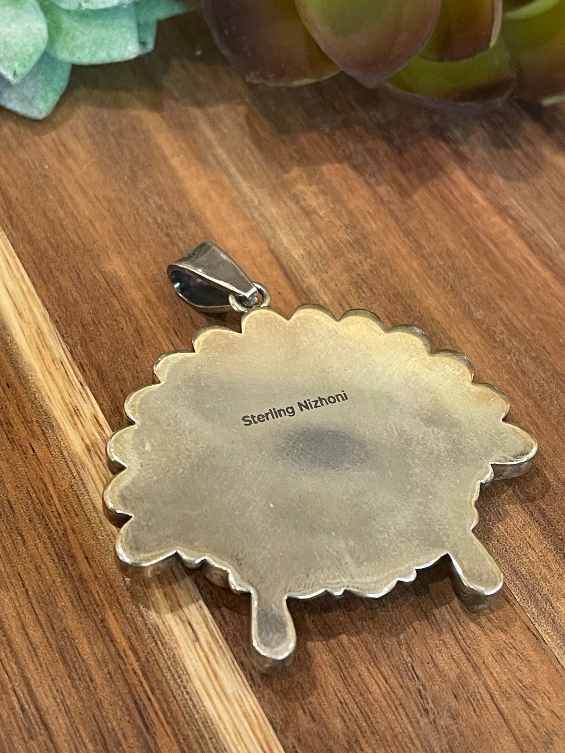 Such gorgeous craftsmanship! Pendant measures 2 1/4 inches long and 2 inches wide. Signed Nizhoni & Stamped Sterling.