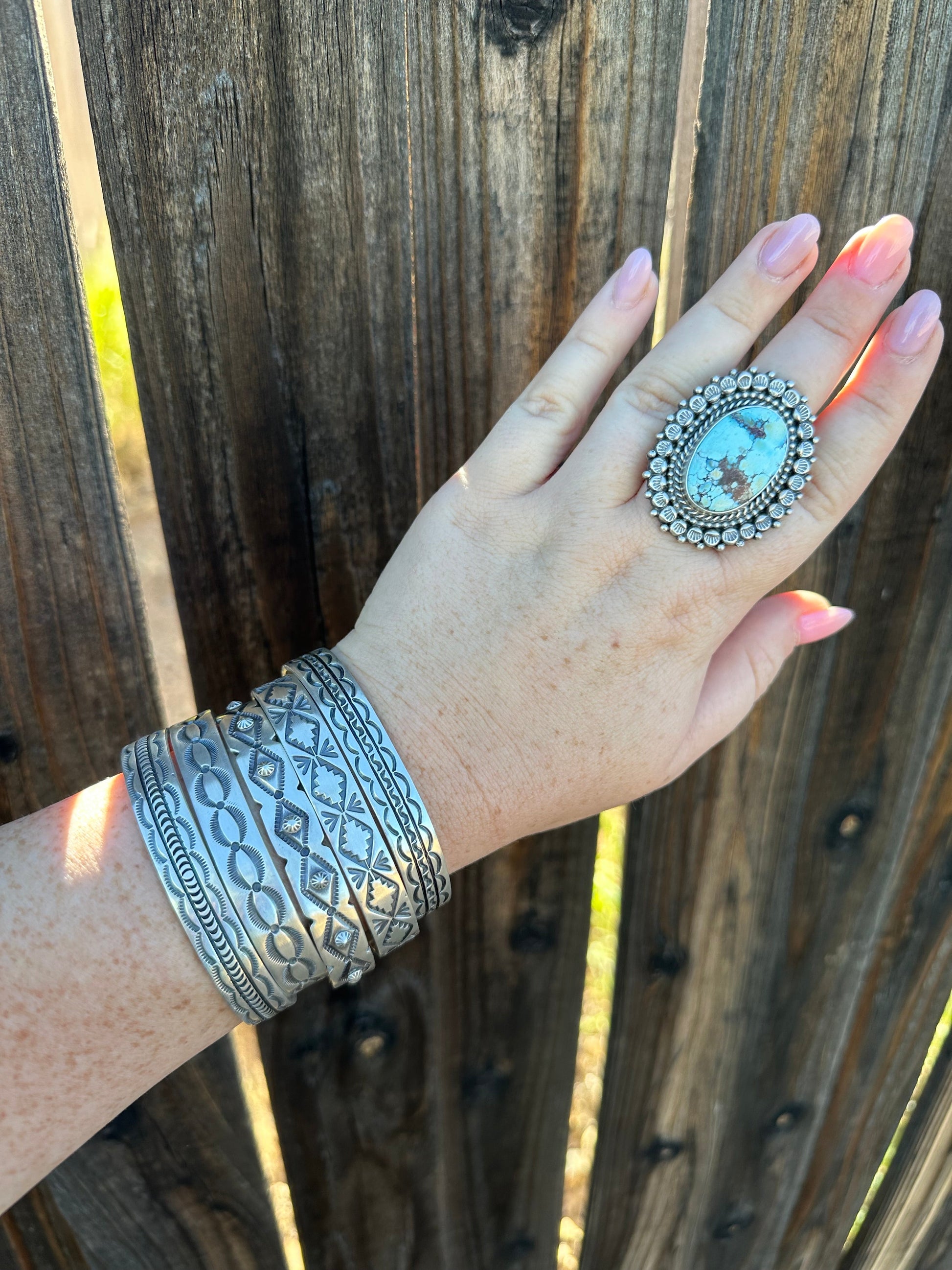 Beautiful Navajo Sterling Silver Hand Stamped Bracelet Cuff. Measuring 6 inches inside circumference with a 1 1/4 inch gap. Width is 1/2 of an inch. Signed by Artist Sheila Tso & Stamped Sterling. Stunning Cuff.