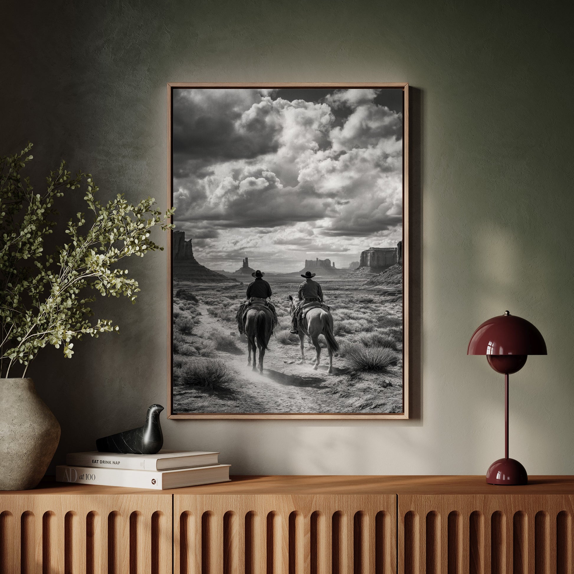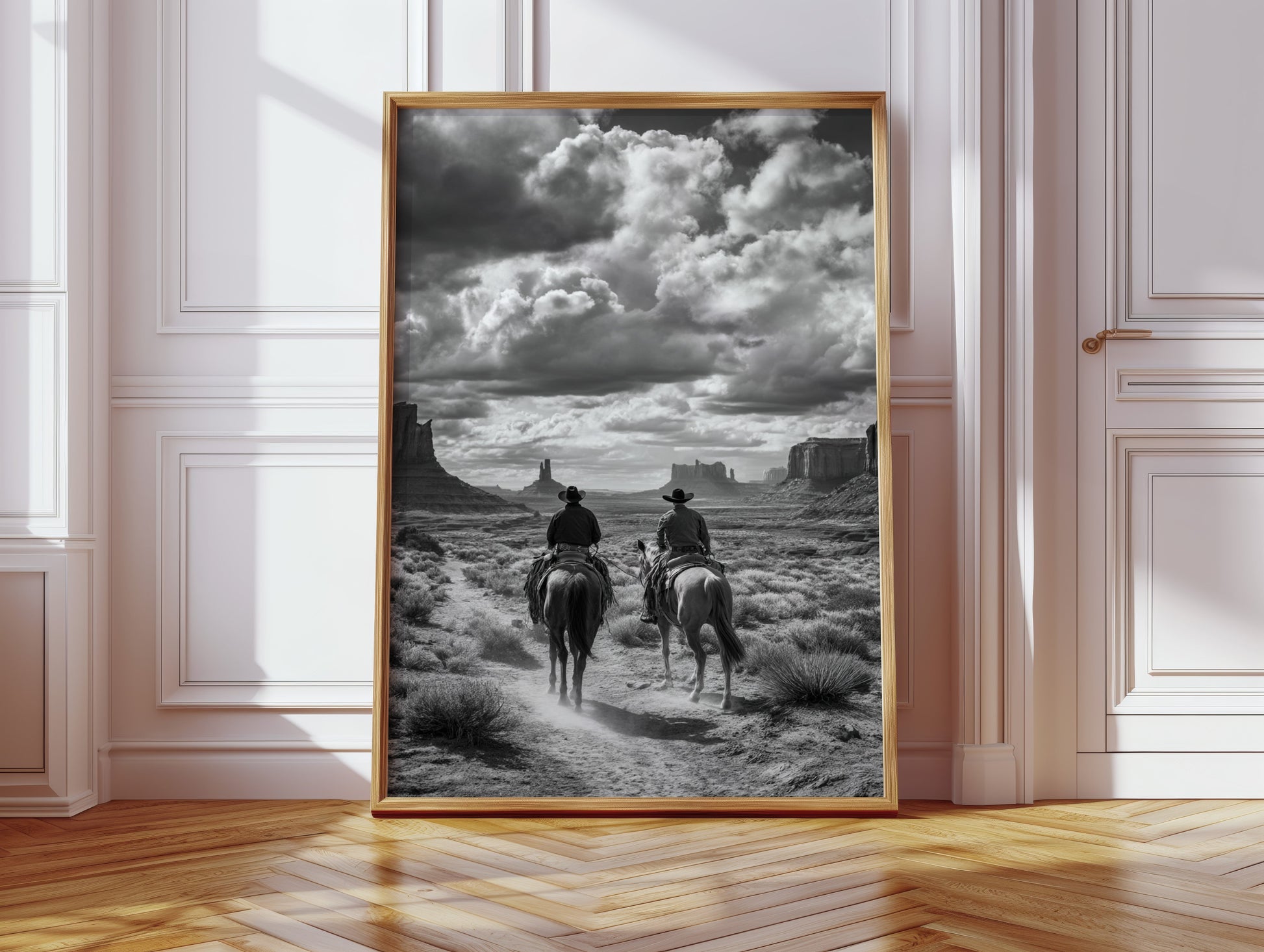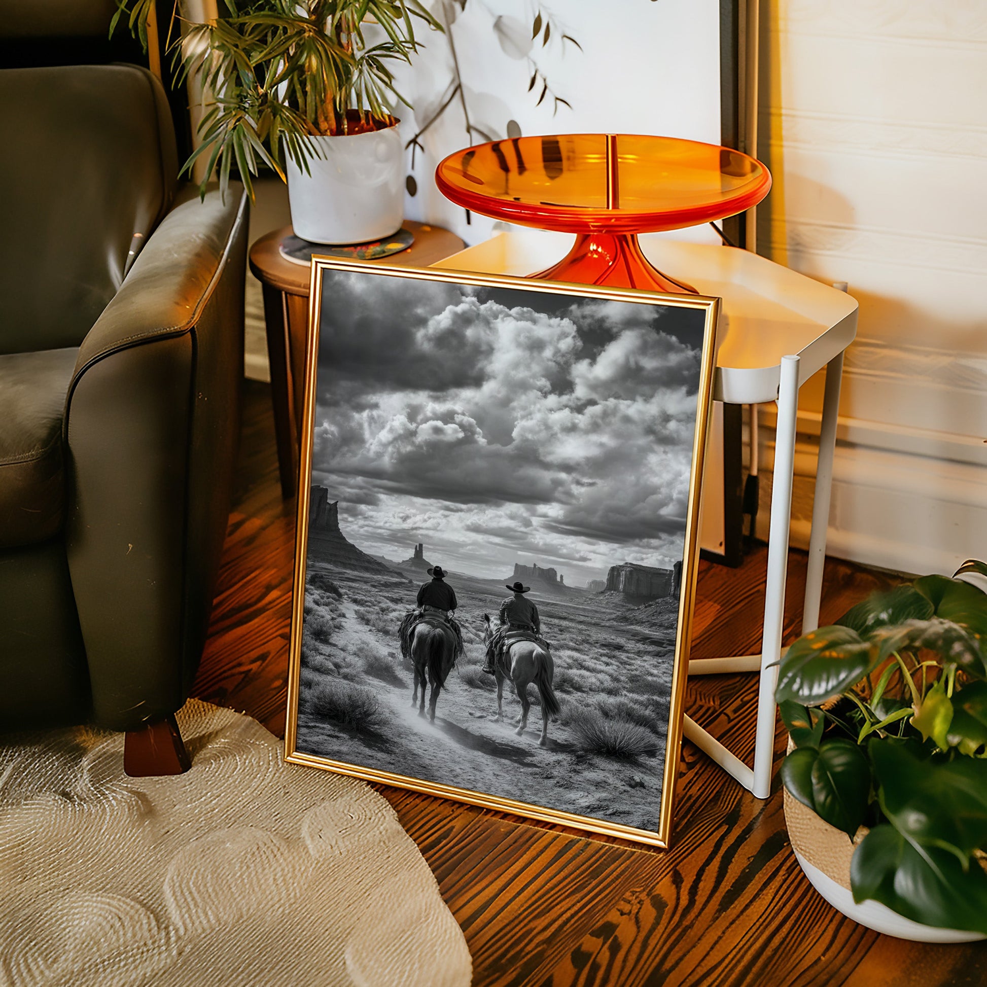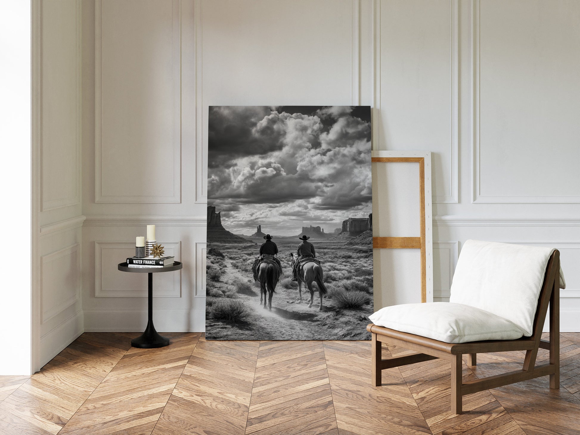 Part of our Epic Journeys collection, this stirring photograph captures the timeless spirit of western adventure and the profound bonds that define true partnership. The iconic landscape of Monument Valley provides a dramatic backdrop that speaks to the grandeur of the American frontier, while the silhouetted figures remind us that the greatest adventures are always better when shared. The cinematic quality transforms a simple moment into something mythical—a scene that could have been pulled from the golden age of western films.