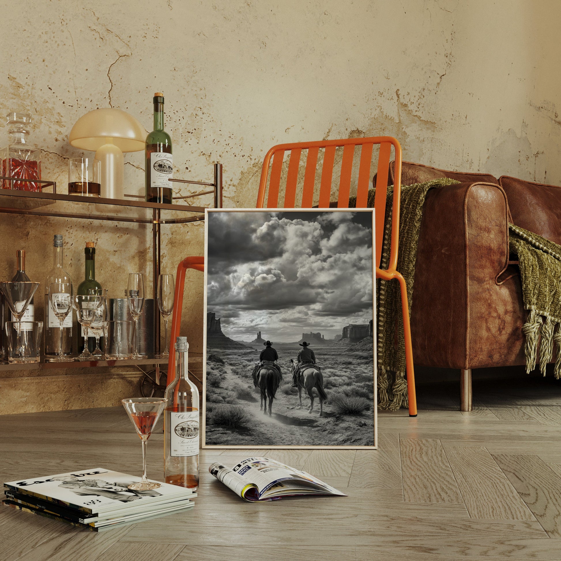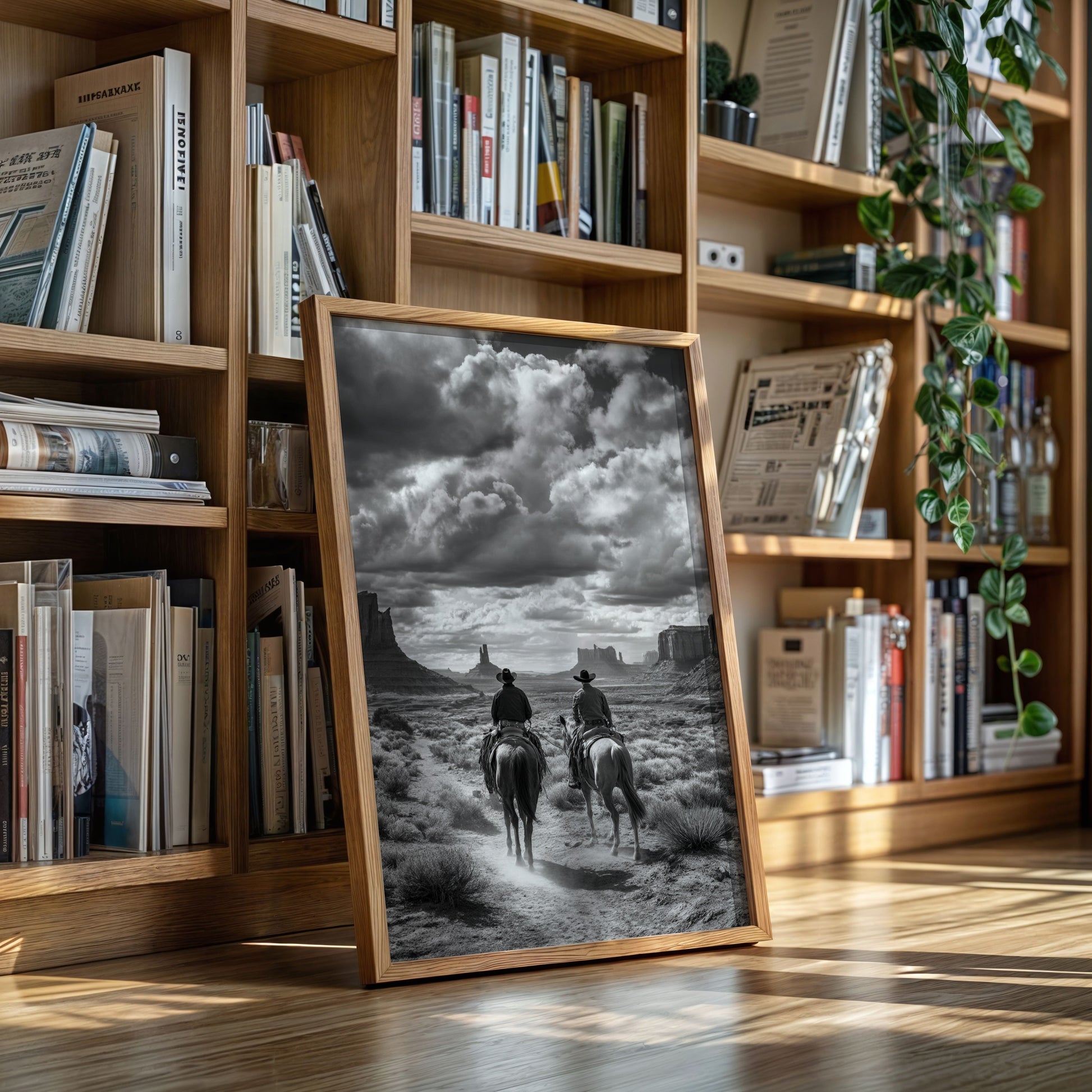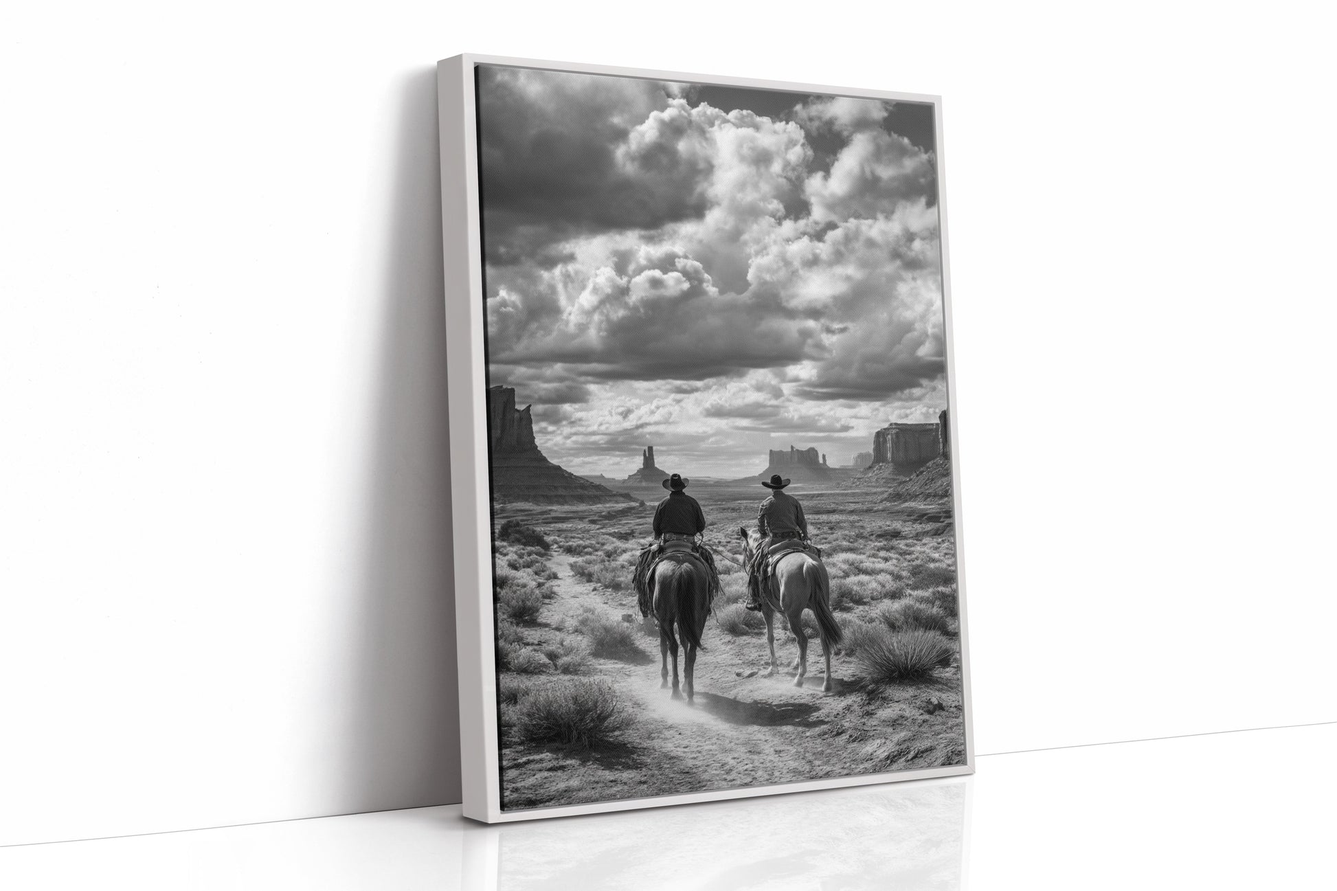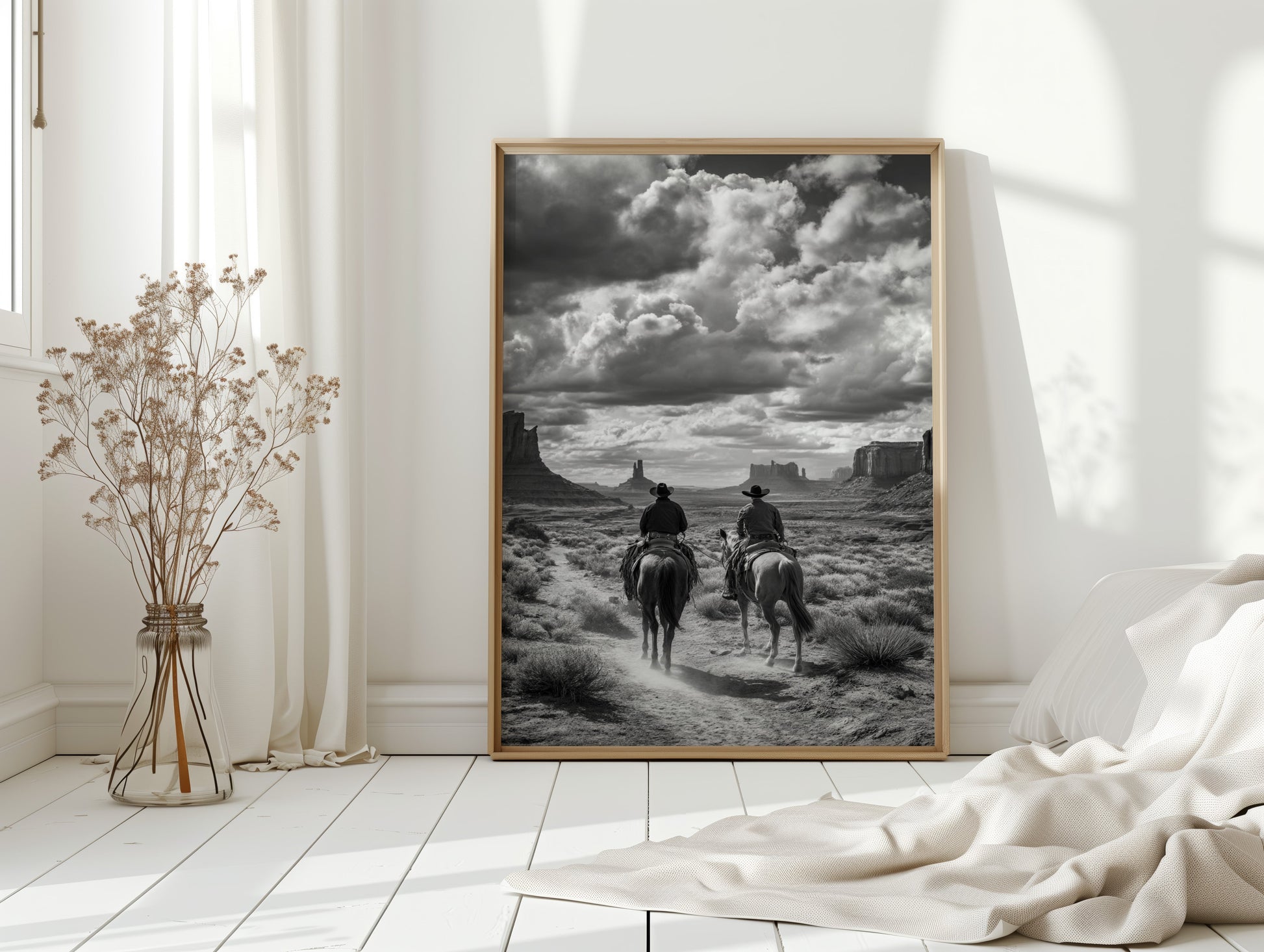 Part of our Epic Journeys collection, this stirring photograph captures the timeless spirit of western adventure and the profound bonds that define true partnership. The iconic landscape of Monument Valley provides a dramatic backdrop that speaks to the grandeur of the American frontier, while the silhouetted figures remind us that the greatest adventures are always better when shared. The cinematic quality transforms a simple moment into something mythical—a scene that could have been pulled from the golden age of western films.