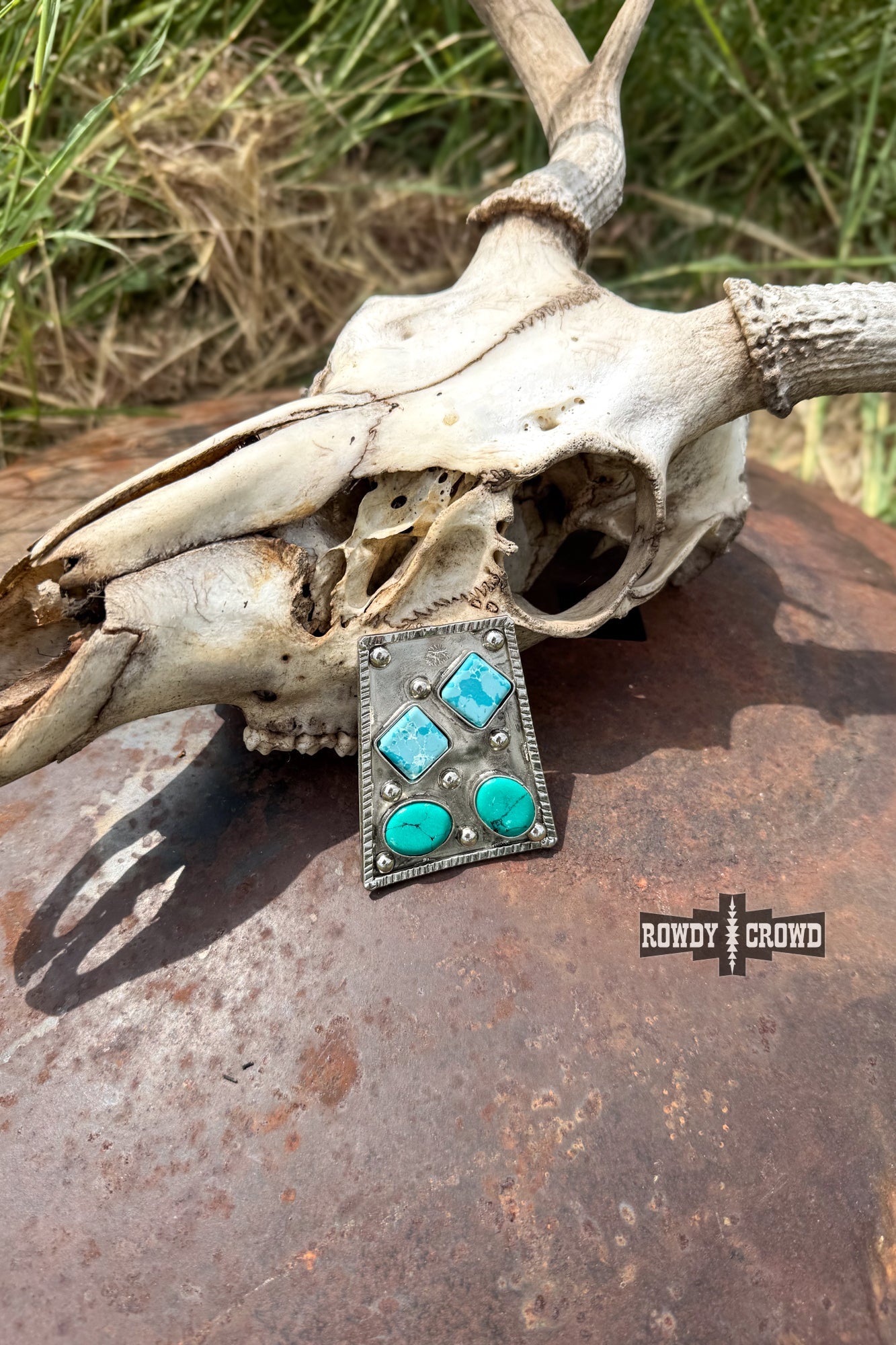 Bold and built to stand out—the Cattleman Scarf Slide features two sky-blue square and two rich teal oval turquoise beads. With stamped details and domed silver accents, it’s the perfect pop of Southwestern flair for any Western look.
