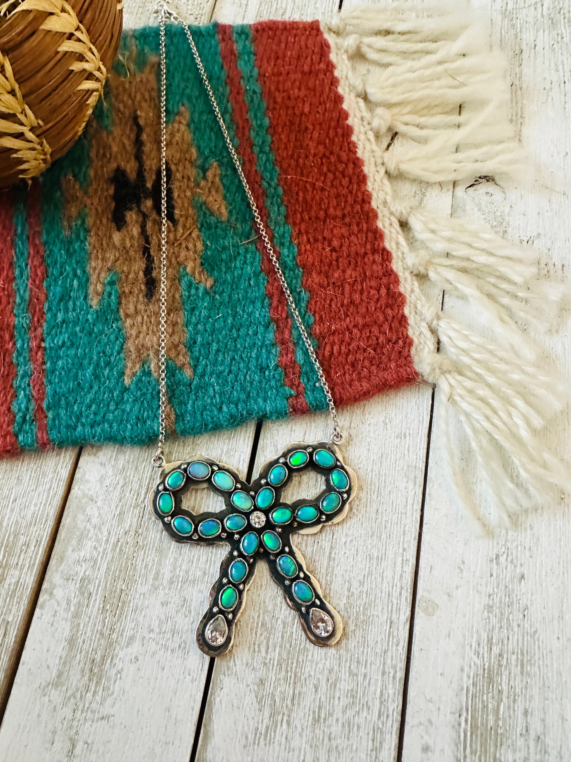 ** Christmas Collection ** Handmade Sterling Silver, Synthetic Opal & CZ Bow Necklace Signed Nizhoni