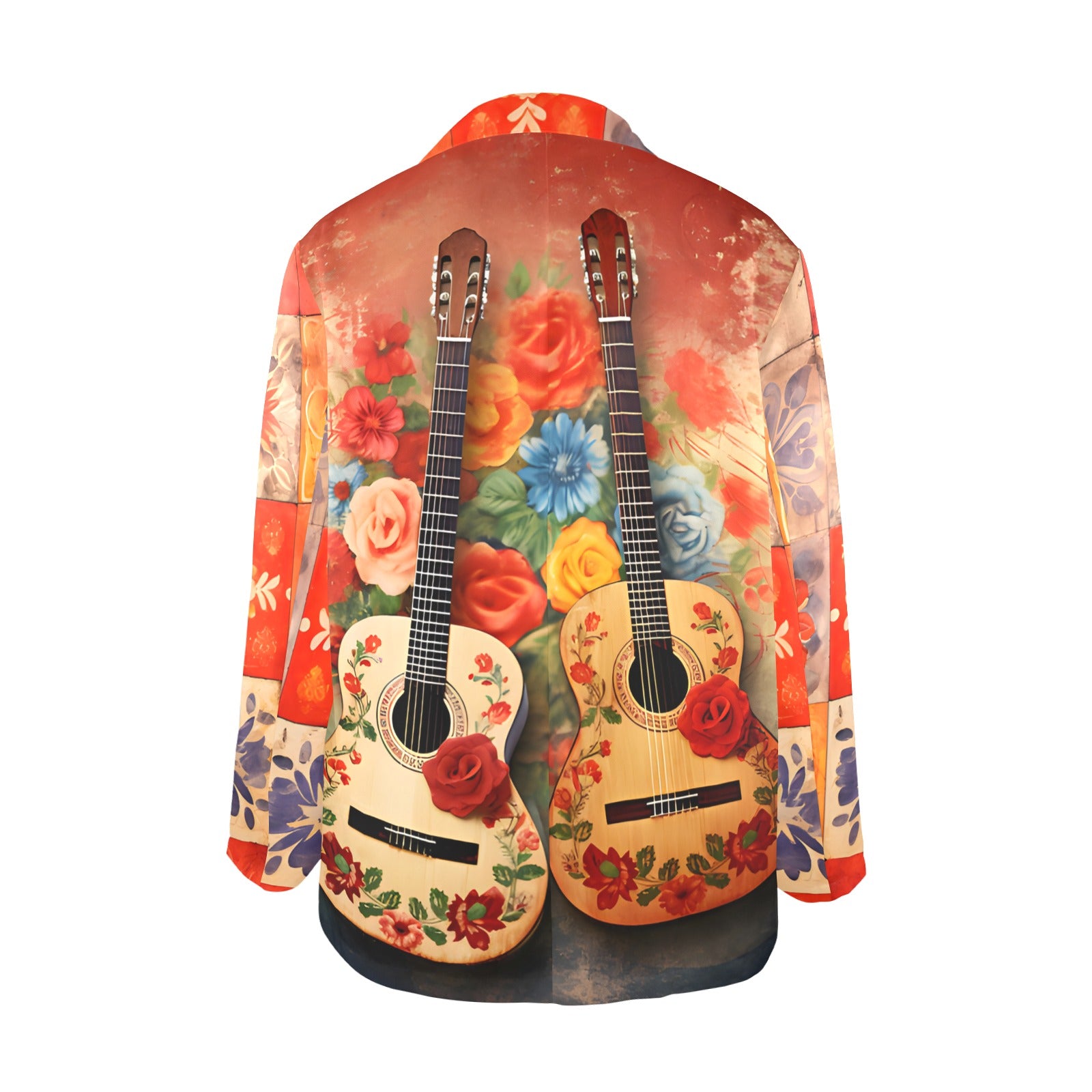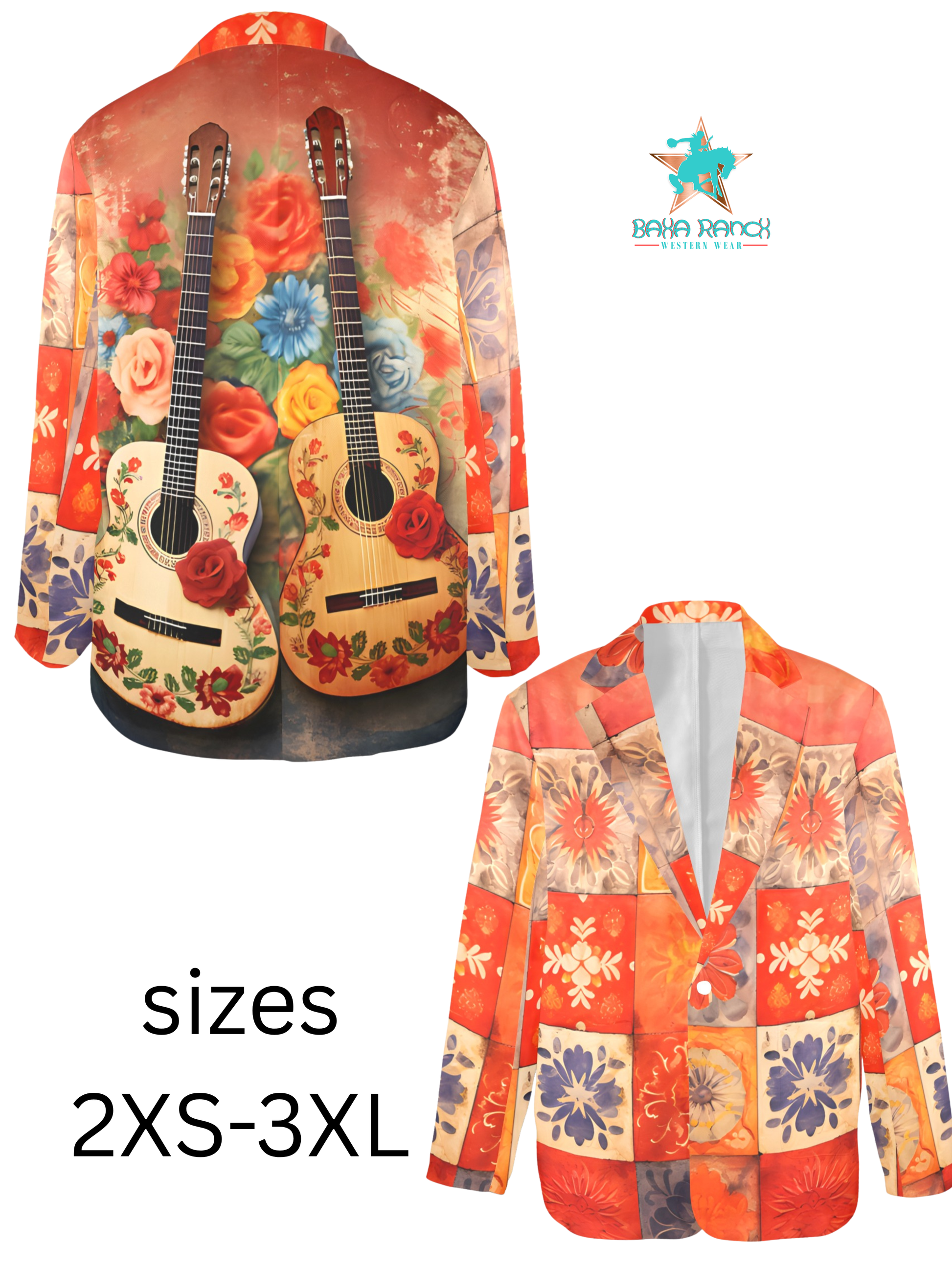 Colores de Mexico Musica Blazer Inspired by Mexico's rich musical heritage and vibrant cultural traditions, this blazer celebrates the artistry of guitars and the soul of Mexican music. Crafted with attention to detail, it features authentic color palettes drawn from traditional Mexican aesthetics—bold hues and warm tones that evoke the passion of mariachi and folk traditions.