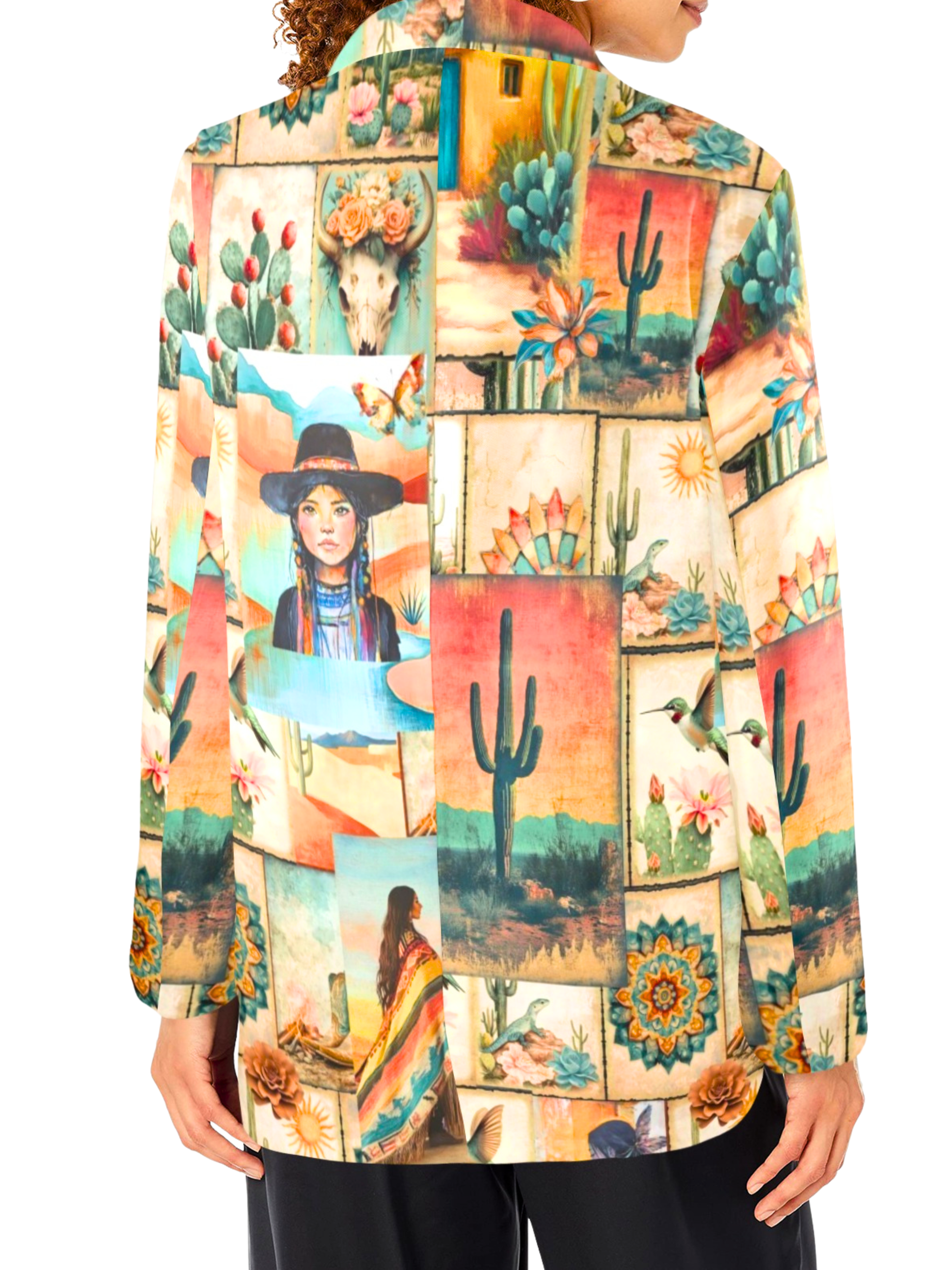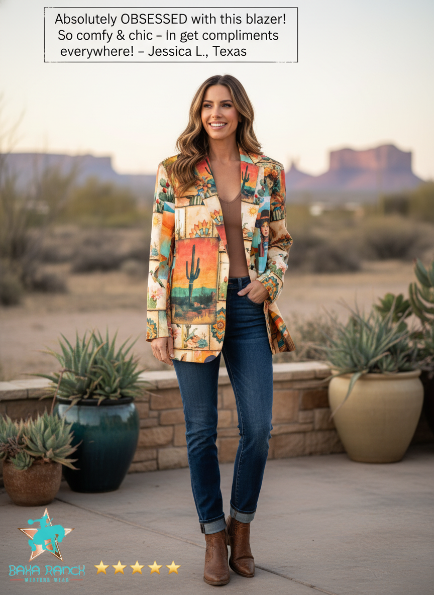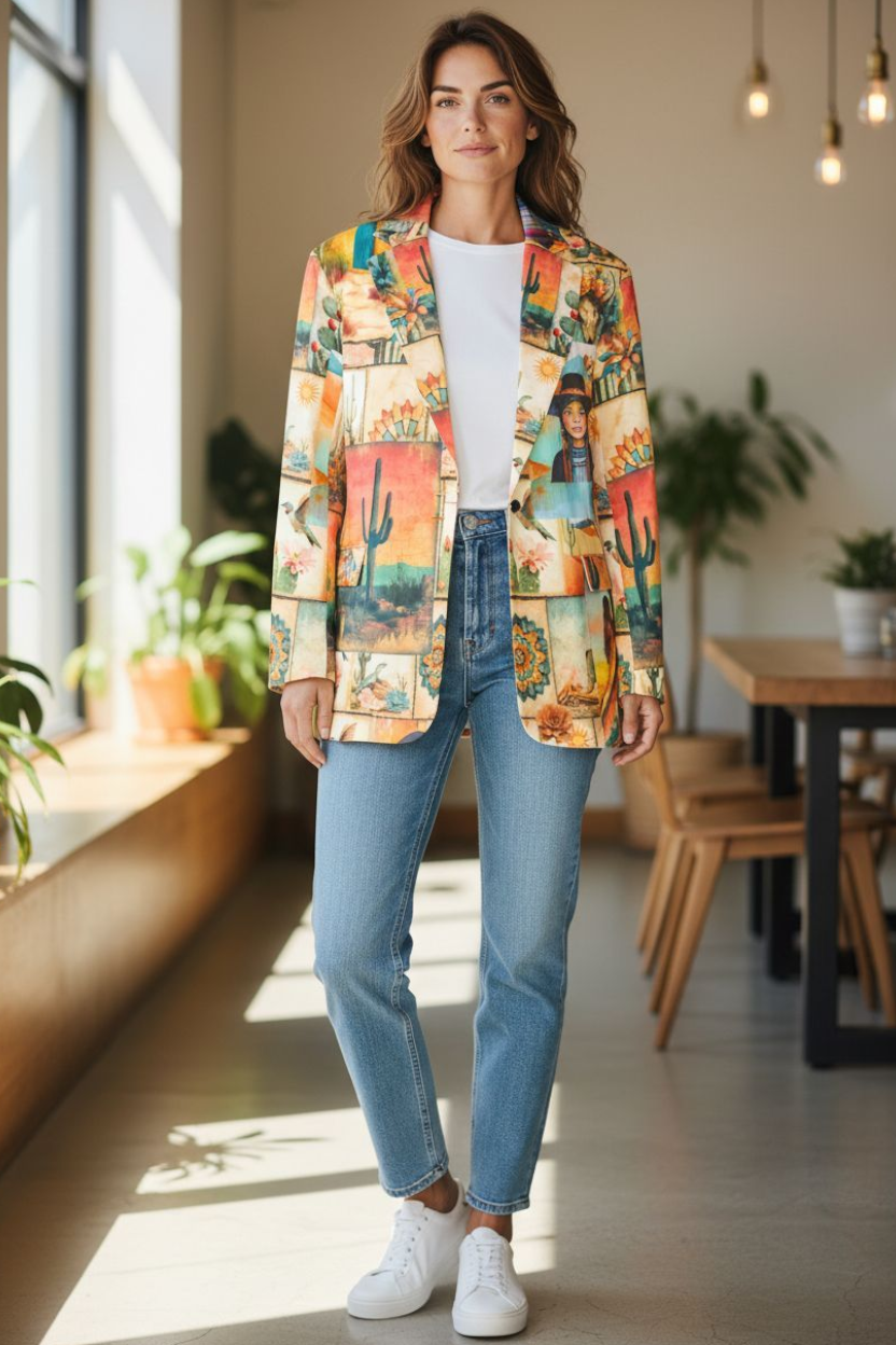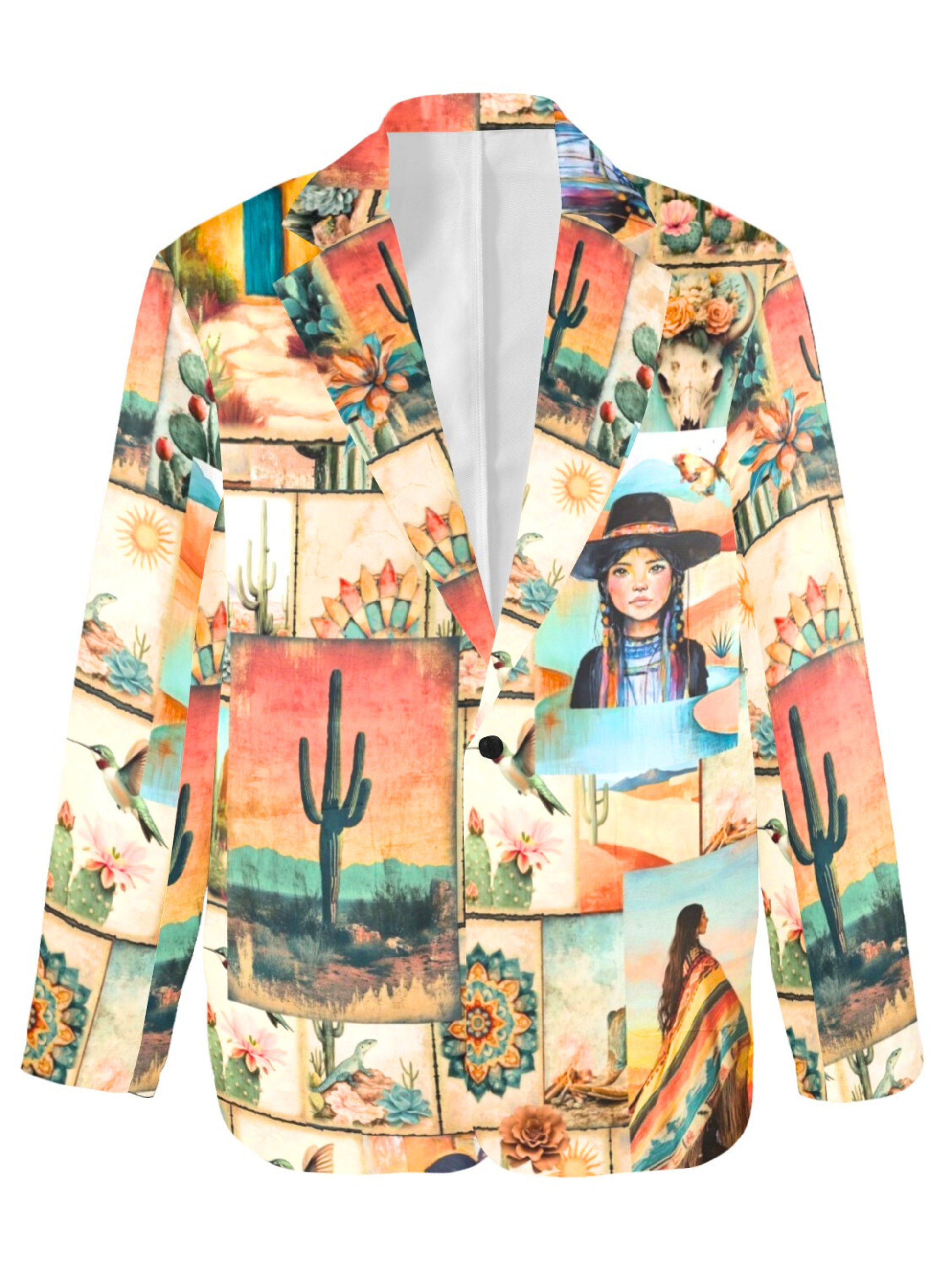 Embrace the spirit of the Southwest with this striking blazer, inspired by the vibrant landscapes and rich cultural heritage of Mexico. Featuring bold imagery of desert vistas, iconic cacti, and traditional Mexican artistry, this piece brings authentic Southwestern character to your wardrobe. The expertly crafted design merges rustic charm with refined tailoring, making it equally at home on the ranch or in town. Perfect for those who appreciate the beauty of desert culture and want to wear their passion for the Southwest with confidence and style.