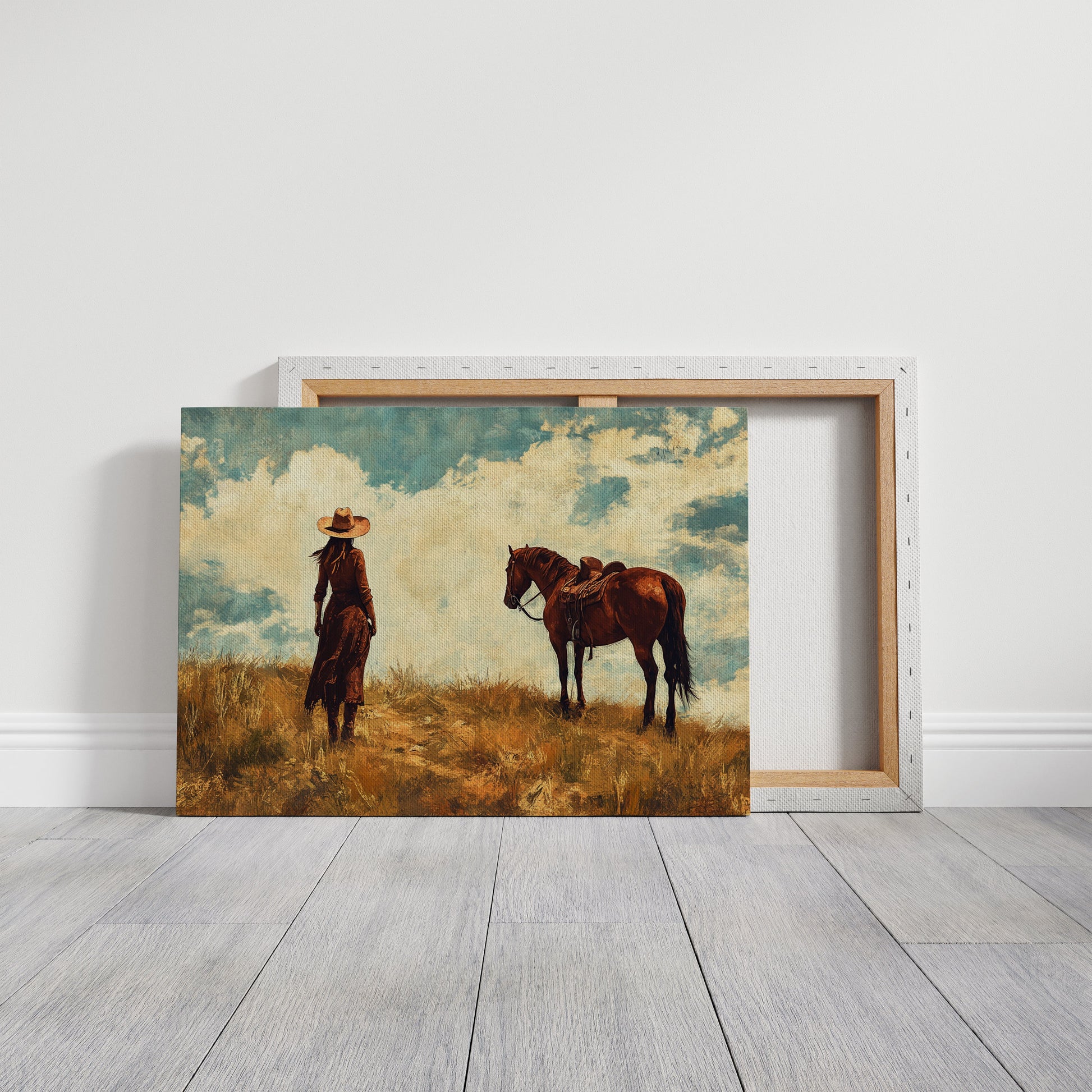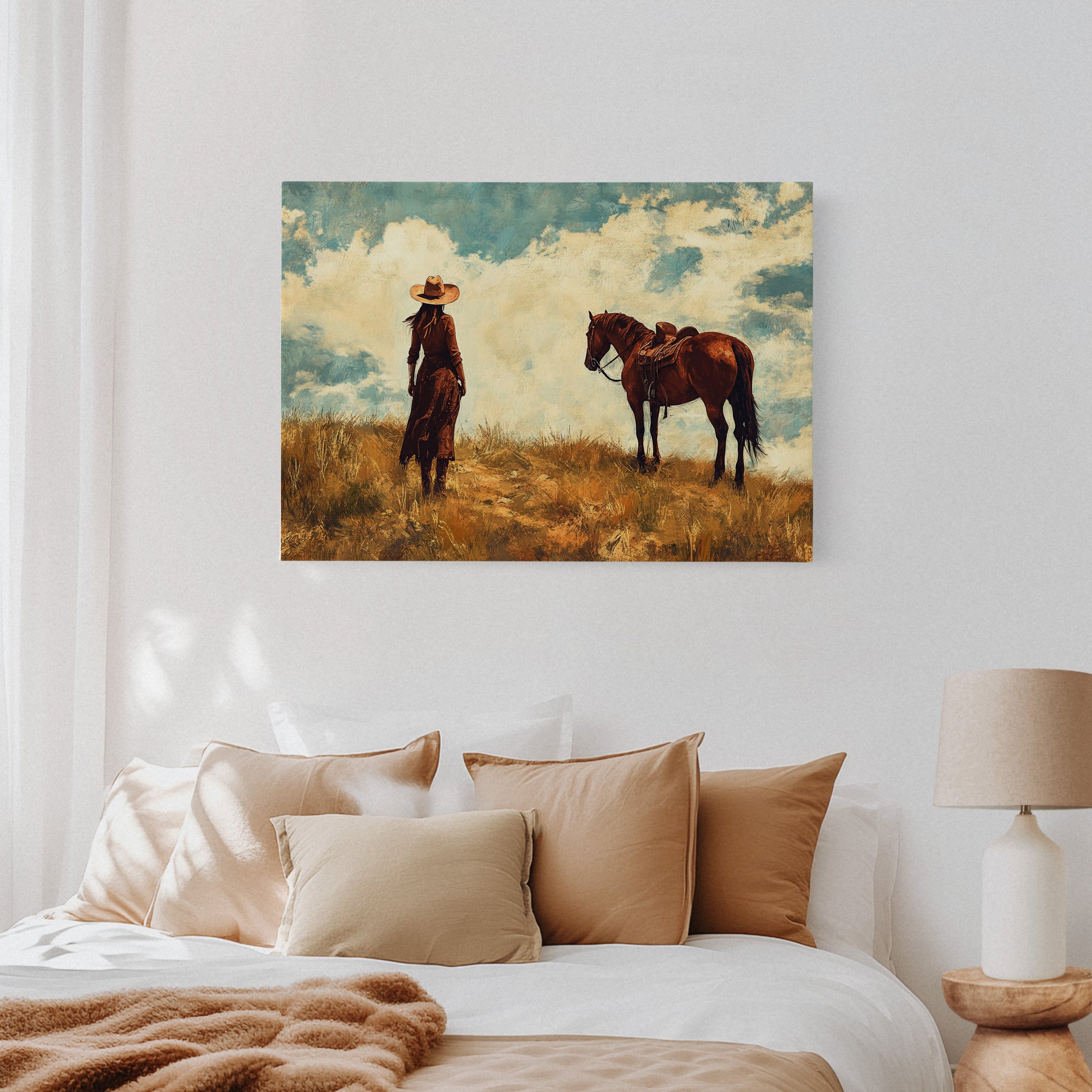 A windswept cowgirl and her loyal horse pause at the crest of a golden hill, framed by a sky full of wild light and quiet strength—painted in rustic, cinematic tones.
