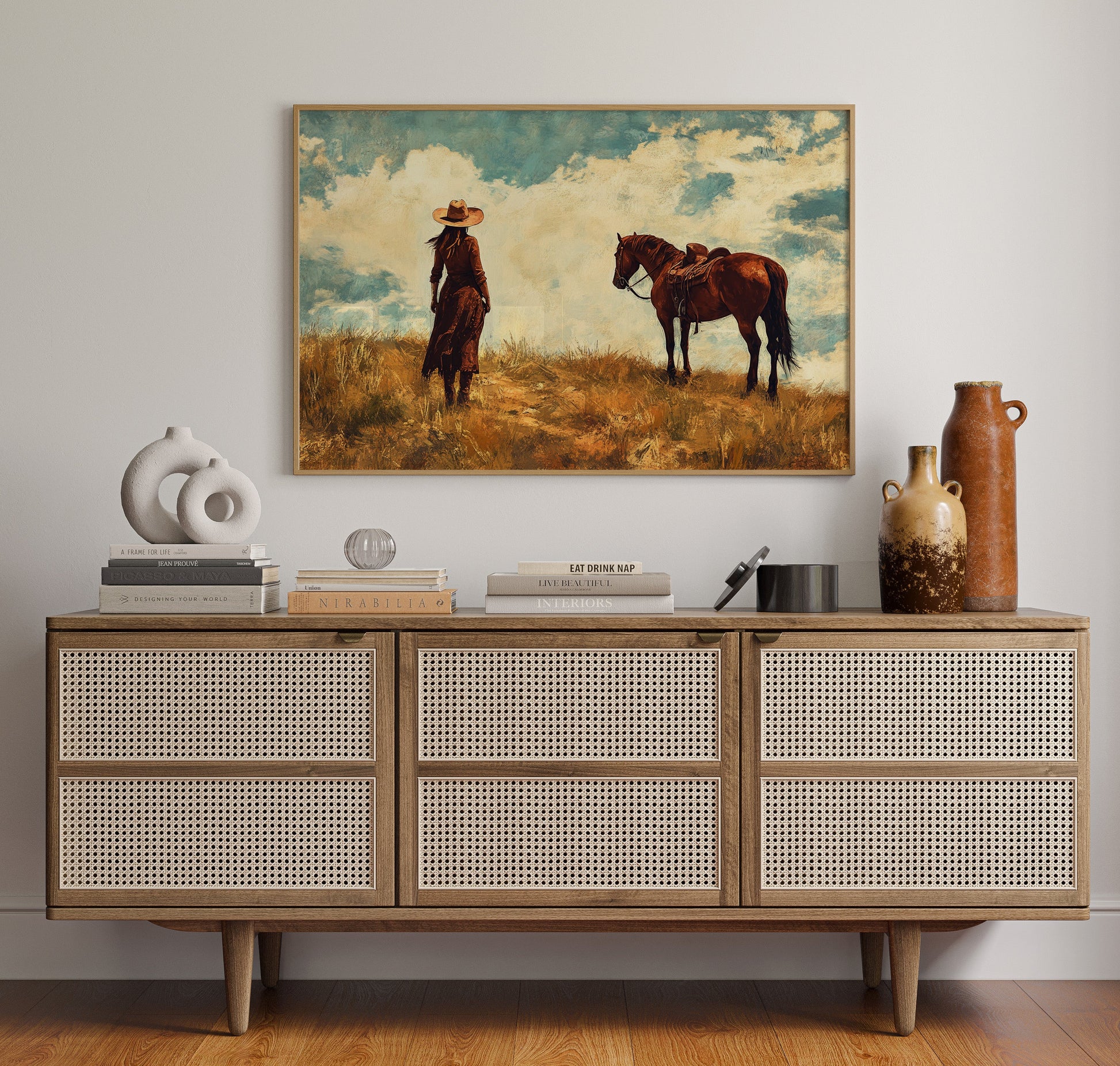 Cowgirl and Horse Under Big Sky