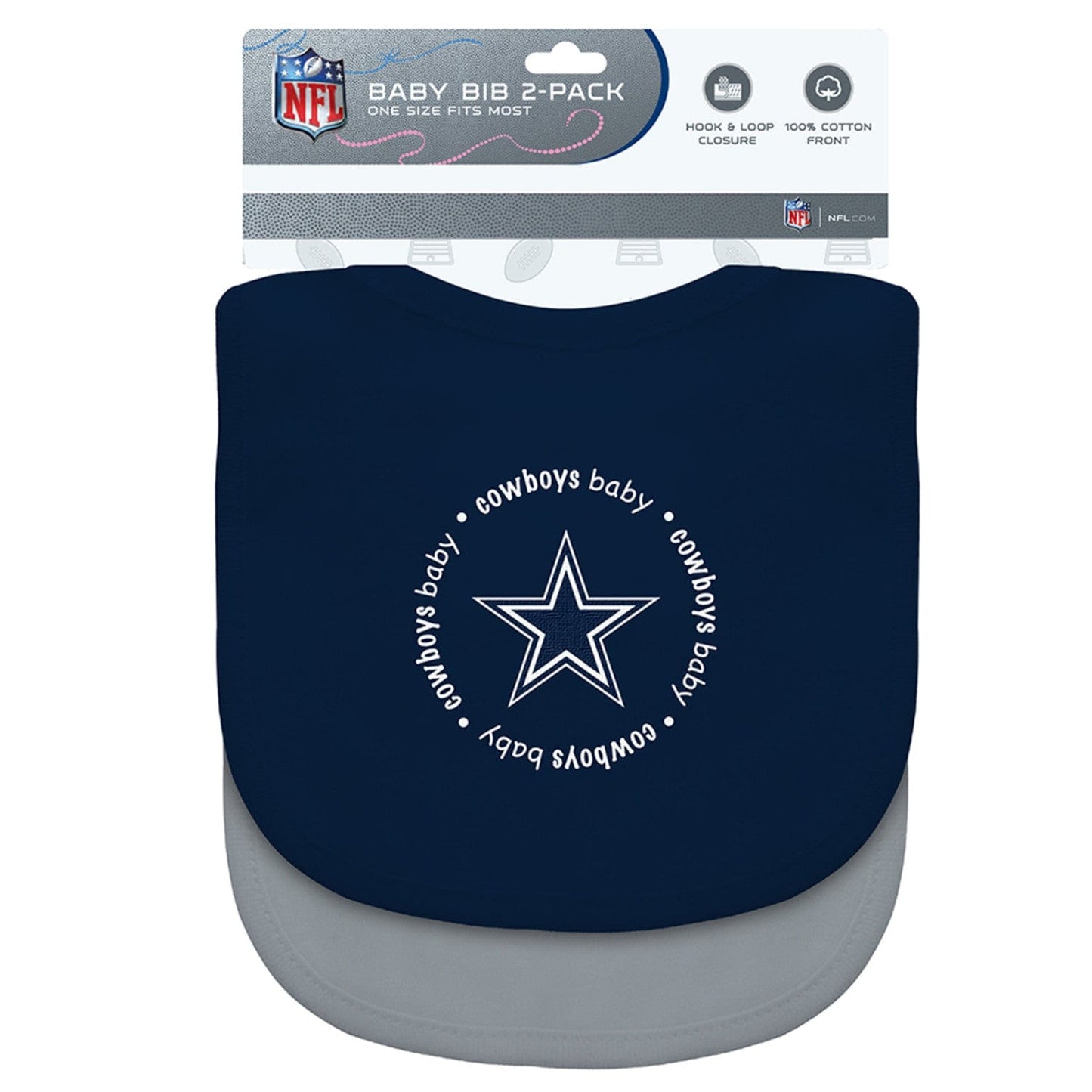 This MasterPieces Dallas Cowboys NFL BabyFanatic Unisex Bibs 2-Pack in Navy & Grey is a must-have for every parent. These officially licensed bibs feature a 100% cotton front adorned with a beautifully embroidered team logo, showcasing your baby's team spirit from an early age. The polyester back ensures that spills and stains stay away from your child's adorable outfit. With a convenient hook and loop closure, these bibs are easy to put on and take off. Cleaning is a breeze as they are machine washable with cold water and like colors. Designed to fit most infants, these bibs grow with your little one throughout their fandom journey.