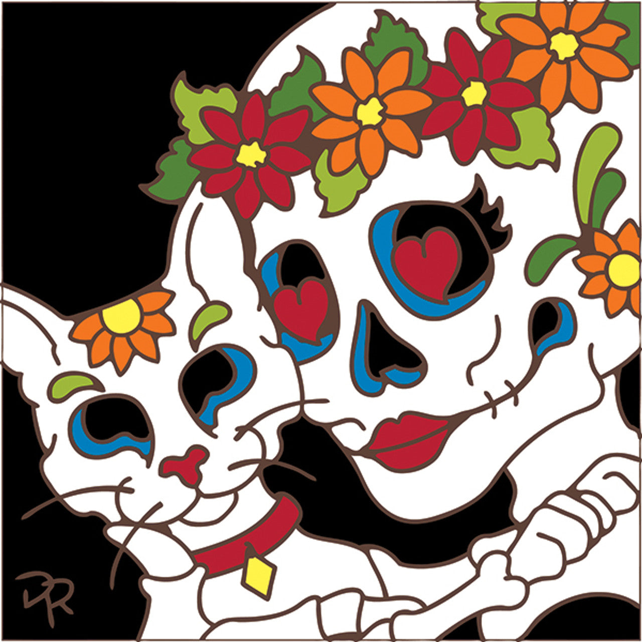 6"x6" hand glazed decorative tile celebrating the Dia de los Muertos tradition and feline companions. This Day of the Dead tile is a beautiful piece of decor or a pet memorial gift that showcases the love of a human and their pet cat.