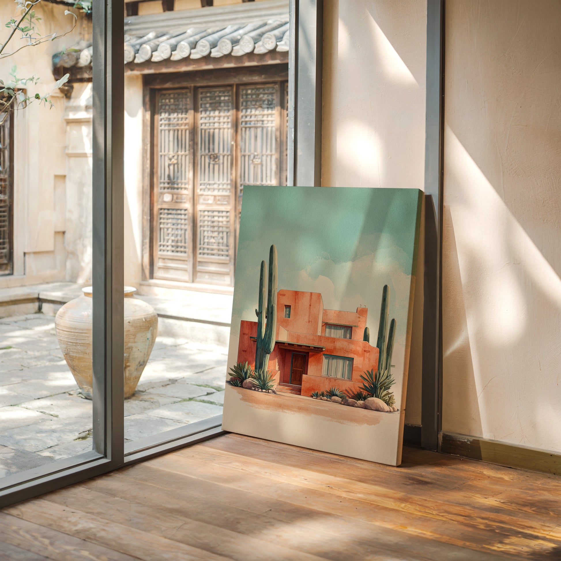 Inspired by the tranquil elegance of Southwestern architecture, this artwork captures the essence of a desert oasis. The vivid terracotta hues contrast beautifully with the cool turquoise sky, evoking a sense of peace and solitude.