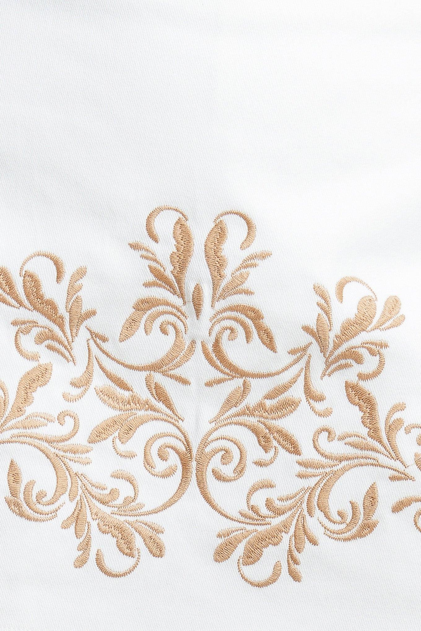 A solid woven skort featuring stud embellishment with embroidery and side zipper closure.