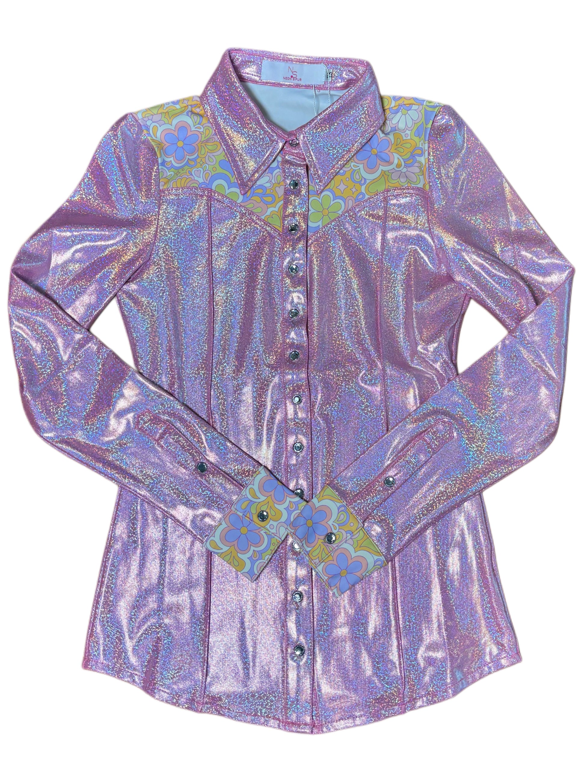 Rhinestone pearl snaps add that extra dazzle, while the active snap cuff closure keeps sleeves secure during every twirl, trot, or tumble. The yoke and cuffs are trimmed in a sweet pastel heart-and-flower ‘60s motif for a pop of retro charm, and the silver NS Classic logo on the back of the neck gives it that signature Neon Spur finish.
