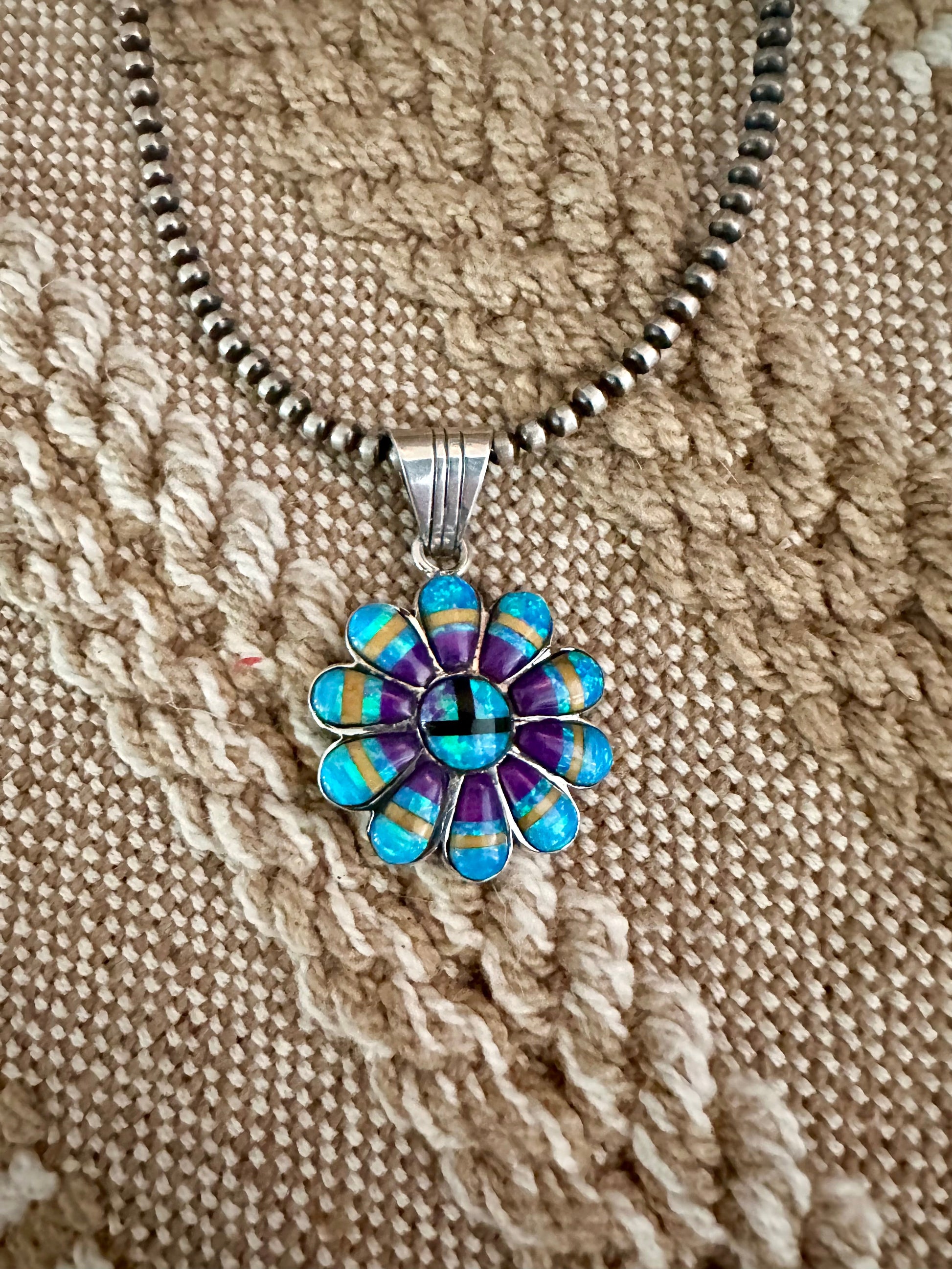 Beautiful Handmade Multi Stone and Sterling Silver Inlay Pendant. Such gorgeous craftsmanship! This awesome pendant measures 1 5/8 inches long and 1 inch wide. Bale measures 1/4 of an inch across. Stamped Sterling & Signed Nizhoni.