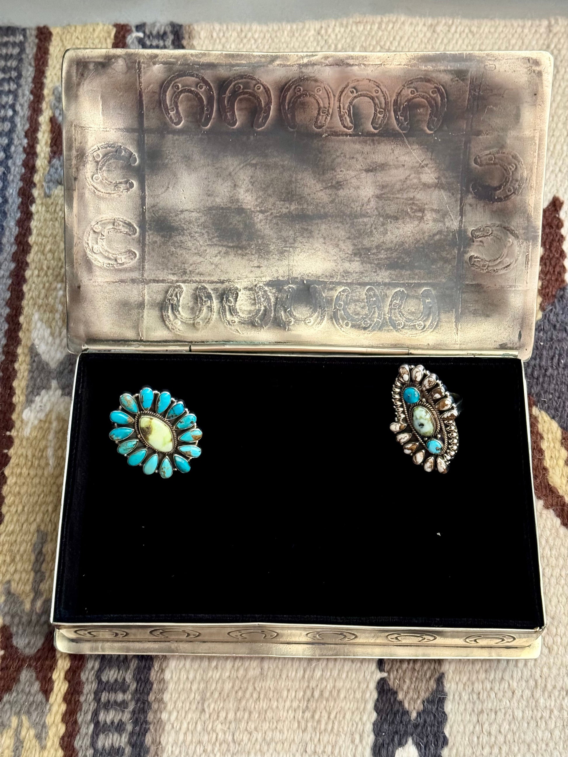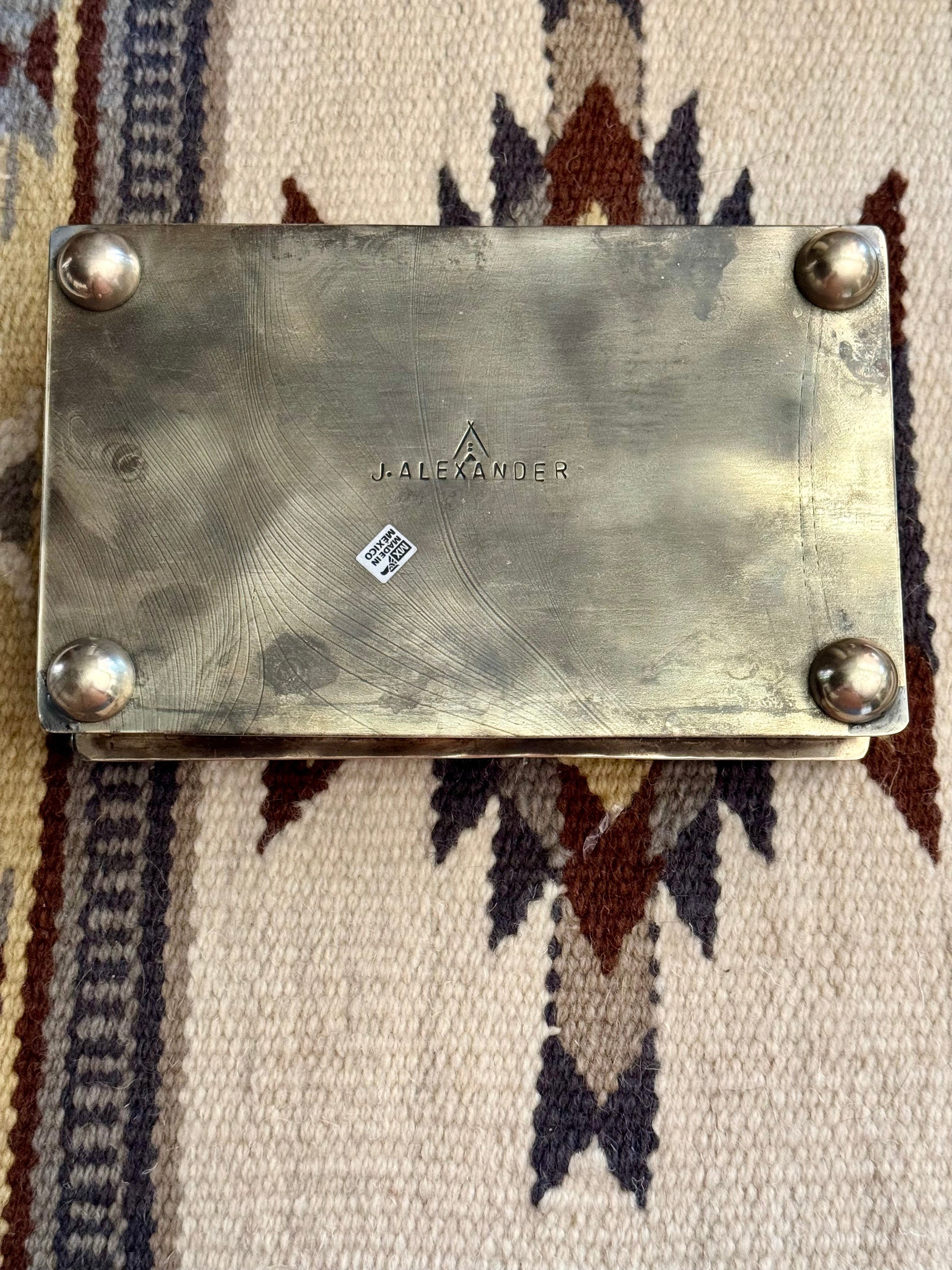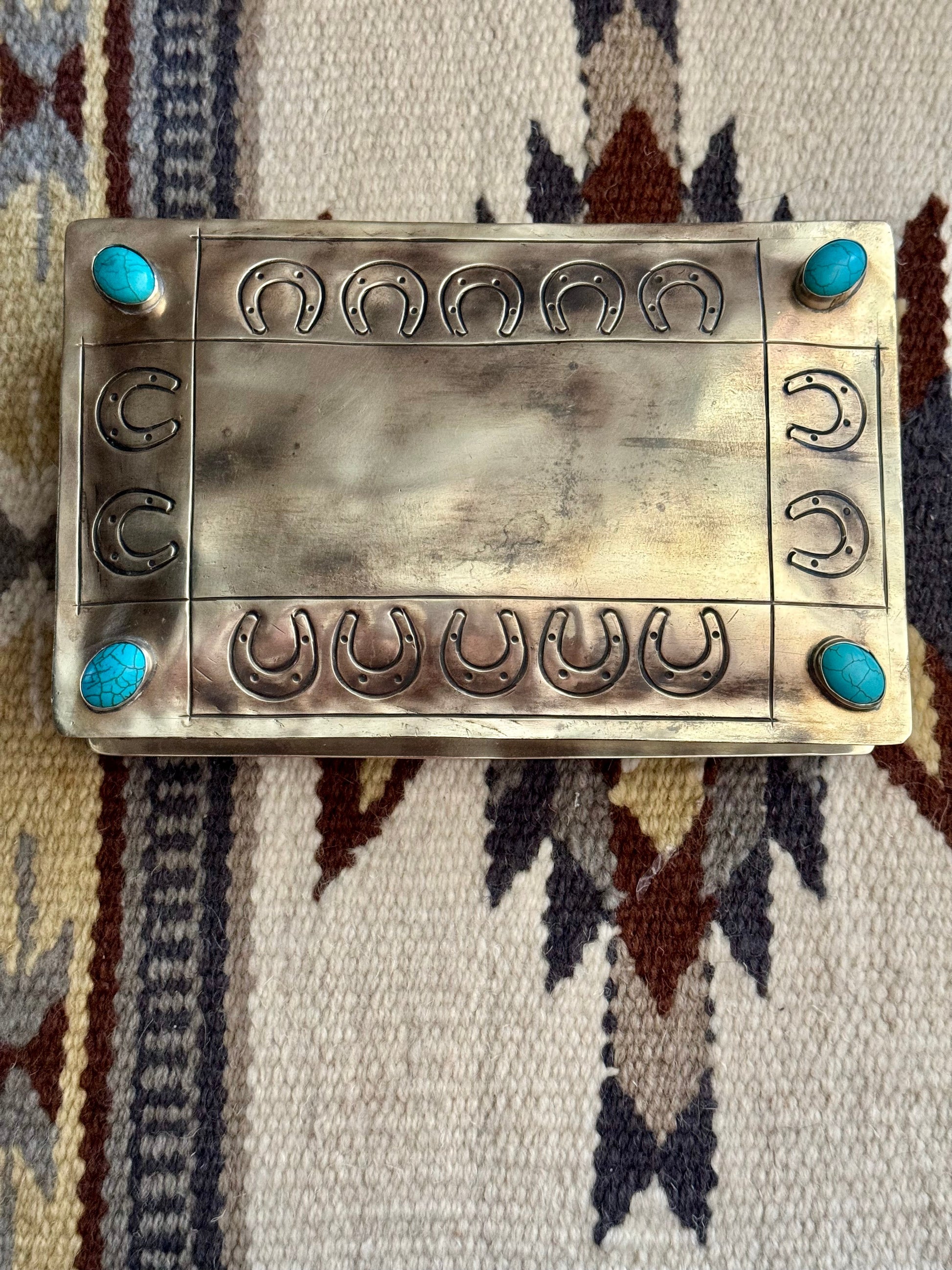 This beautiful piece is designed by Jason Lenox and made in the Central Highlands of Mexico. Handmade and hand crafted German Silver box. Lined with beautiful black velvet. Topped with Turquoise stones. 8 in long. Width of5 in. 1 1/2 in height.