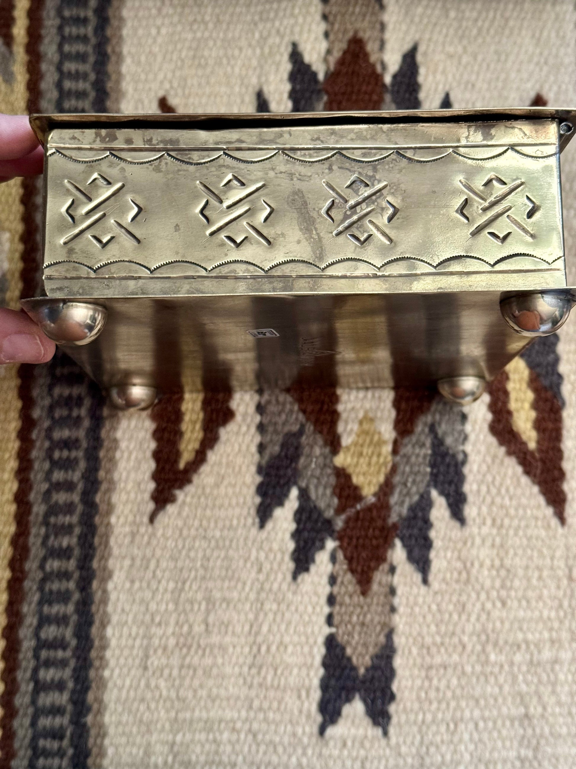 This beautiful piece is designed by Jason Lenox and made in the Central Highlands of Mexico. Handmade and hand crafted German Silver box. Lined with beautiful black velvet. Topped with Turquoise stones. 6 1/2 in long. Width of 6 1/2 in. 2 1/4 in height.