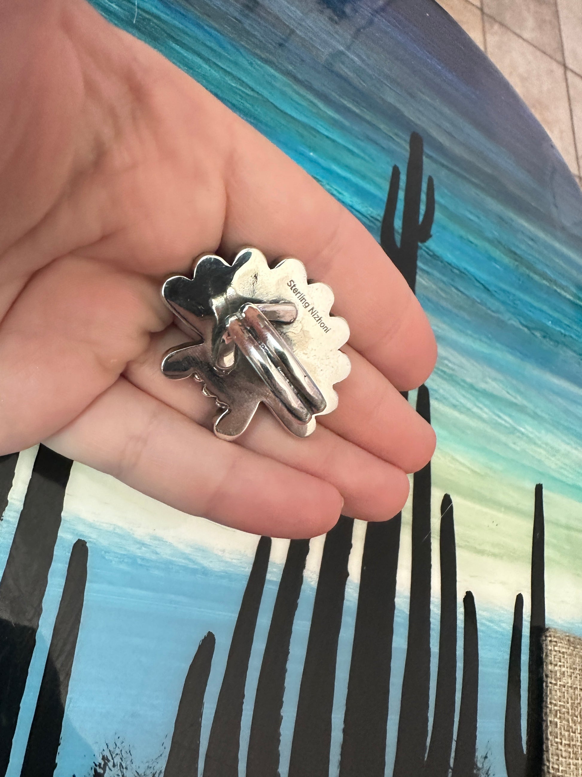 Adjustable in size to wear on any finger. Beautiful stones. Beautiful details. Really great Ring. Measuring 1 3/4 inches long and 1.5 inch wide . Signed Nizhoni and stamped Sterling.