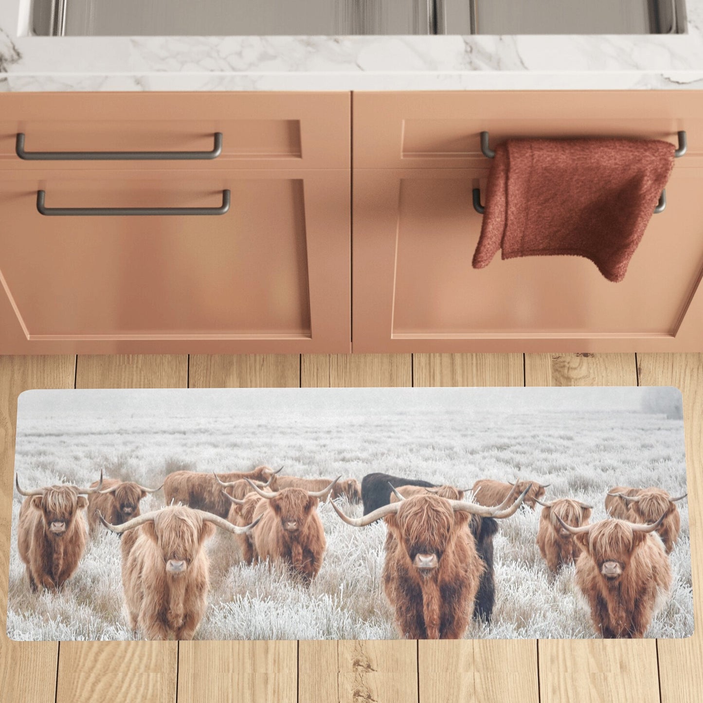 Round up your homestead with this Highland Cow Herd Long Kitchen Mat! This ranch-ready, Western-style mat puts the “moo” in home décor, adding a touch of rustic charm to your kitchen with a stampede of stylin' steers. Yeehaw!