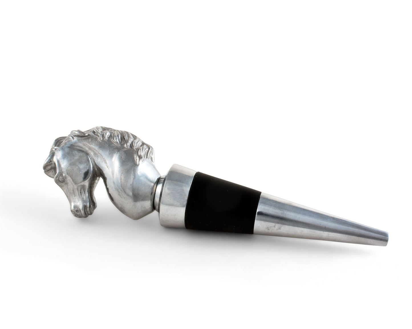 Turn every glass of wine into a special occasion when you stopper your bottles with this dramatic horse bottle stopper from Arthur Court. This elegant statuette comes in a gift box that makes it perfect as a hostess gift or special present for the equestrians and horse lovers in your life, and your friends will appreciate the substantial and high-quality feel when they hold it. Show it off among your crystal decanters and fine wine collection, trusting in the incredibly tight fit of the rubber gasket to protect your wine. The nobly shaped head of this stallion and its flowing, graceful mane are handcrafted in sand-cast aluminum, all the better to show off the realistic detailing of the design. Care for this handsome bottle stopper is easy, requiring only hand-washing and immediate drying.