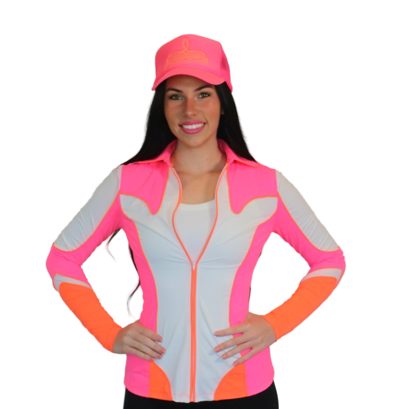 Featuring a sleek zip closure and inactive cuffs for a polished finish, it’s detailed with neon pink, neon orange, and crisp white piping and panel accents that strike like lightning. Pink and orange contrast stitching electrify the look, while HOWDY makes a statement across the back in bold contrast thread.