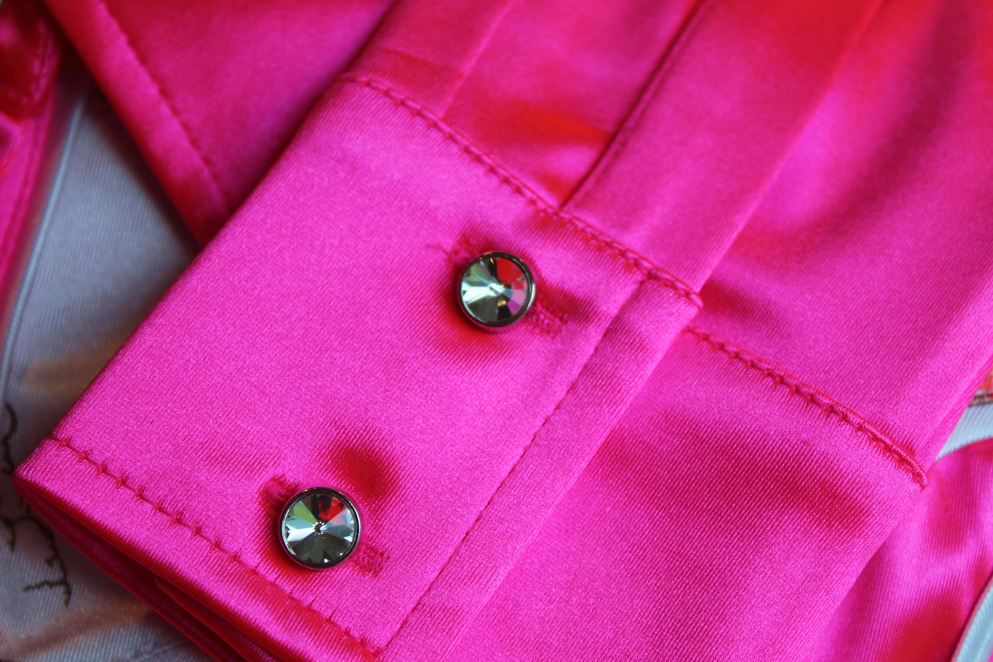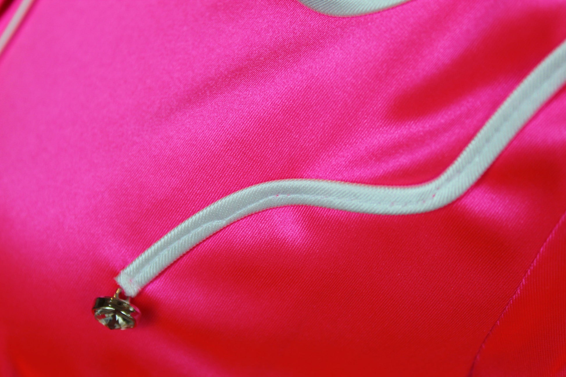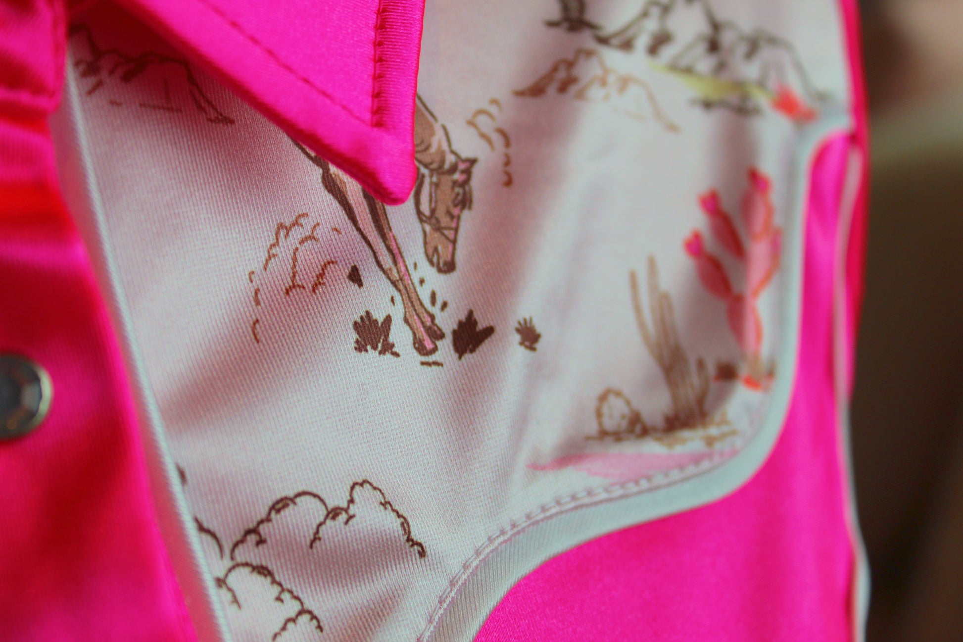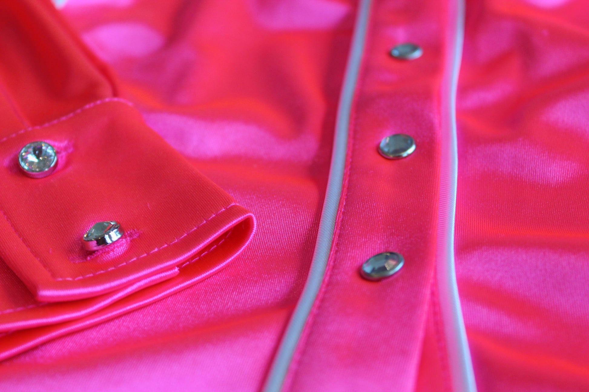 Get ready to command the spotlight in the Let 'Er Buck Luxury Rodeo Shirt, a dazzling blend of classic Western charm and high-end modern style. Crafted from premium Italian fabric, this piece is designed in vibrant neon pink stretch satin that moves with you, offering comfort and durability. Luxe touches like premium rhinestone buttons and snaps add that extra touch of sparkle, while white piping on the waist, yoke and chest defines its sharp, Western lines.