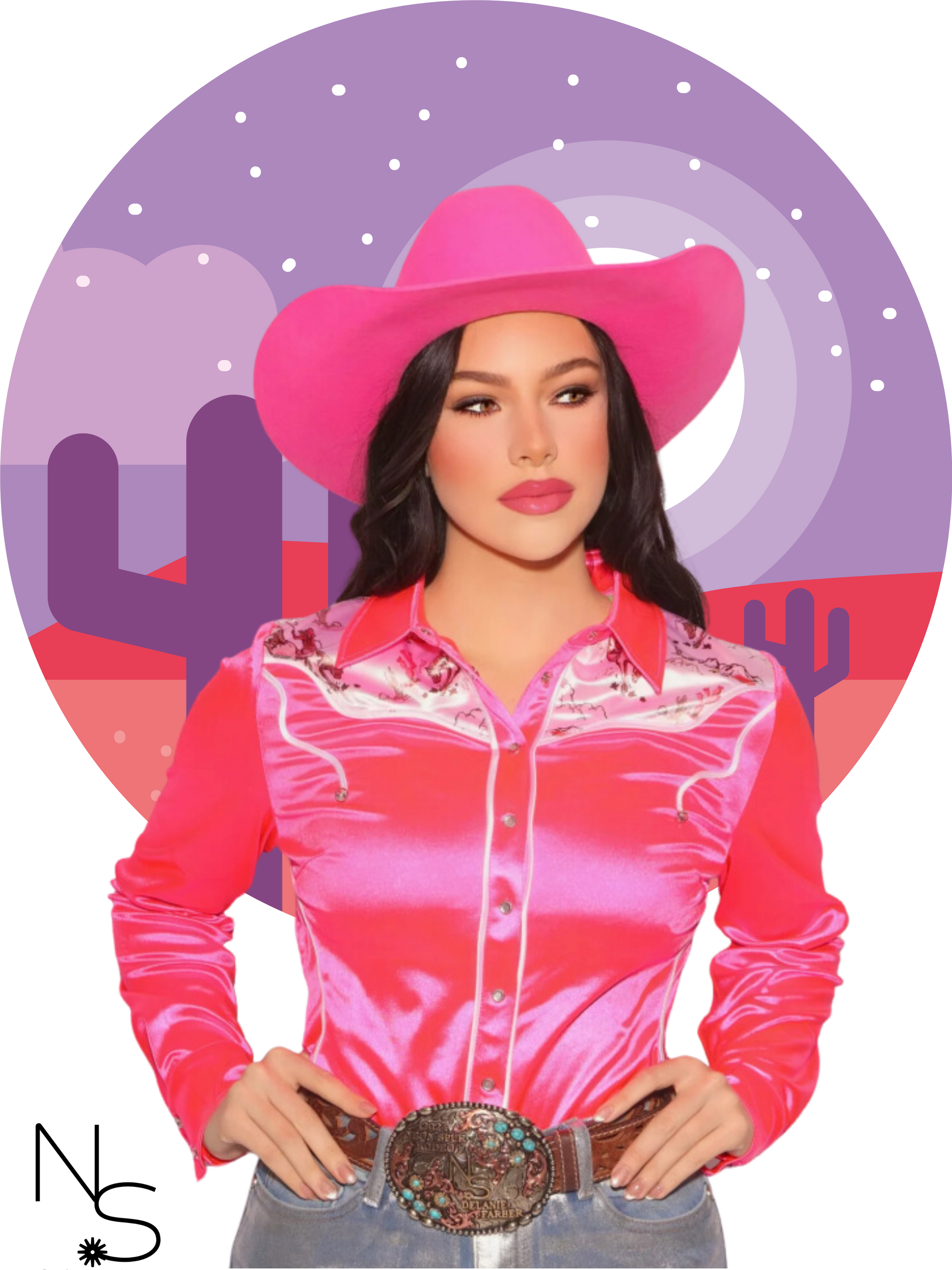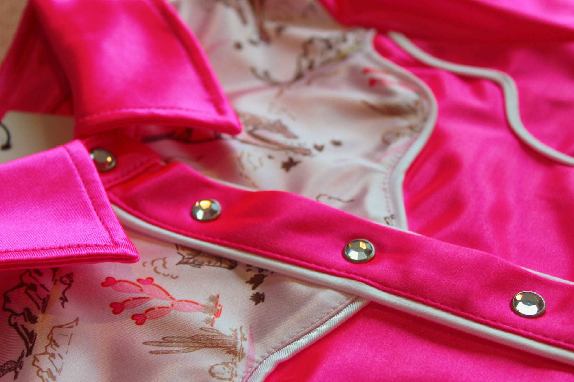 Get ready to command the spotlight in the Let 'Er Buck Luxury Rodeo Shirt, a dazzling blend of classic Western charm and high-end modern style. Crafted from premium Italian fabric, this piece is designed in vibrant neon pink stretch satin that moves with you, offering comfort and durability. Luxe touches like premium rhinestone buttons and snaps add that extra touch of sparkle, while white piping on the waist, yoke and chest defines its sharp, Western lines.