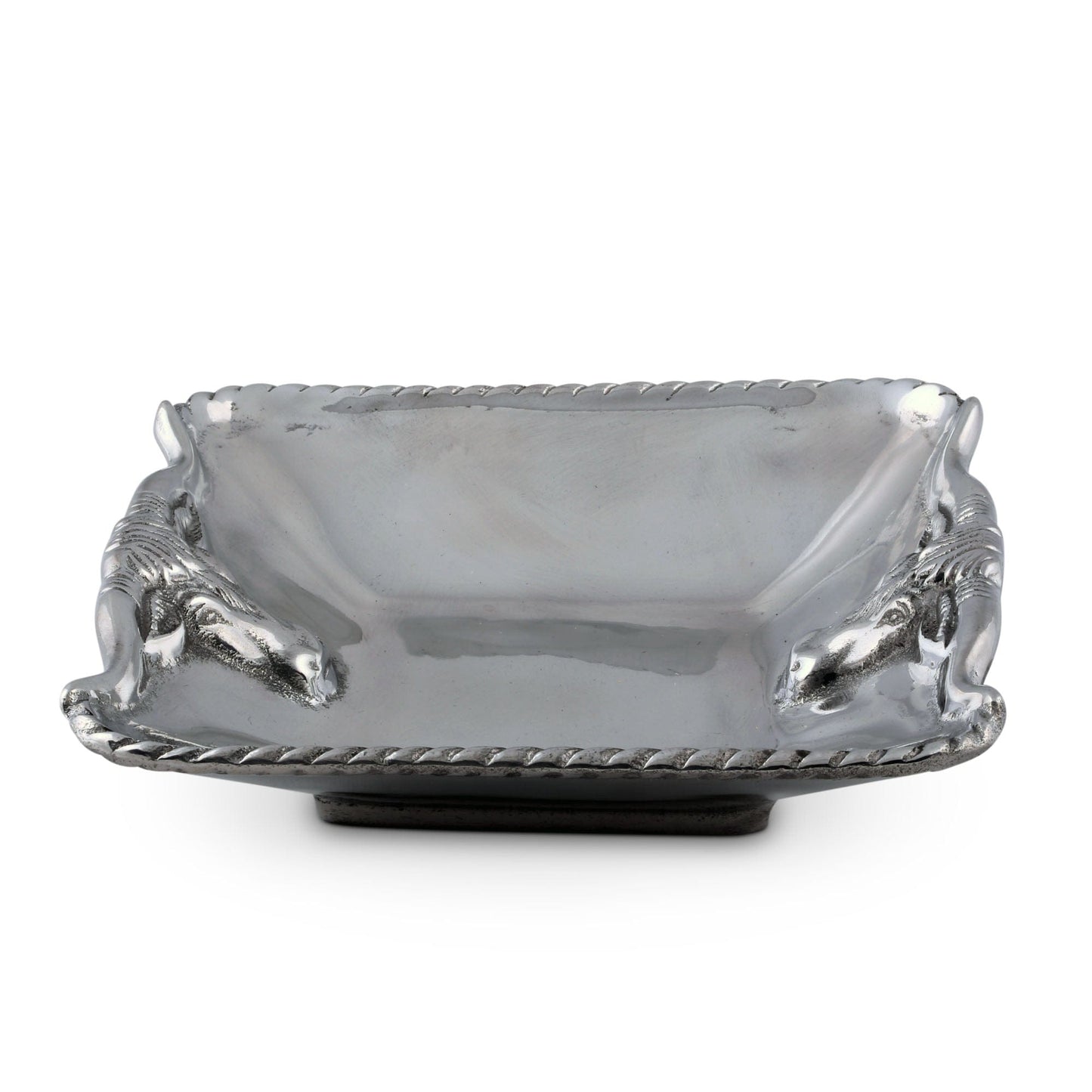 Intense steers face each other as two sides of this sand-cast piece take on the form of their horns. The extended U-shape of these features interrupts the ropy pattern that borders the edge of this handmade, aluminum bowl.
