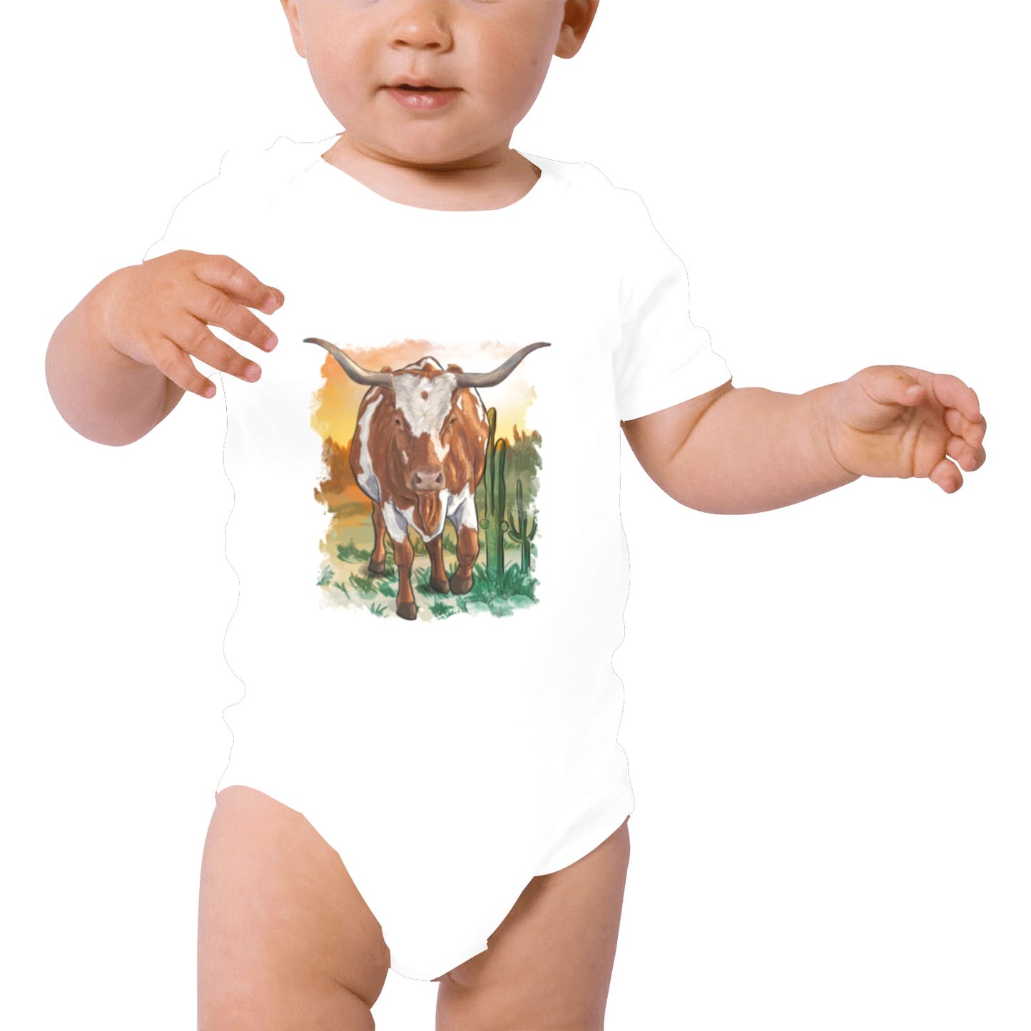 Welcome your littlest one to the world with this Longhorn Little Bitty Organic Baby Onesie! So fun and organic, this baby bodysuit is all-natural and comes with a cute message on the back, guaranteed to make you smile. Put this one on for a memorable, extra-adorable debut. Yee-haw!