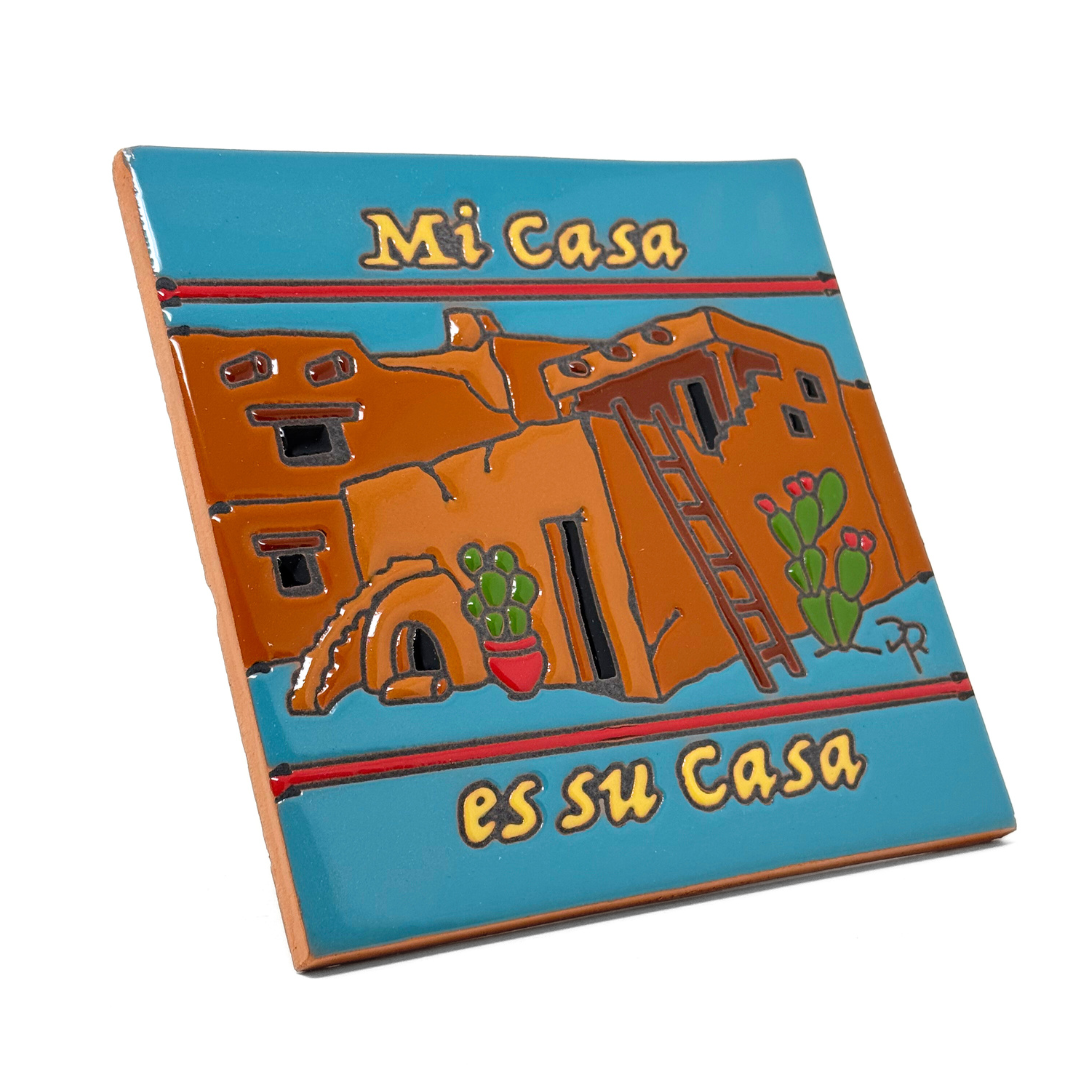 Greet your visitors with a warm message - "Mi casa es su casa." Add a touch of the Southwest to your home with this 6"x6" hand glazed decorative tile, available with a turquoise or terra cotta background.