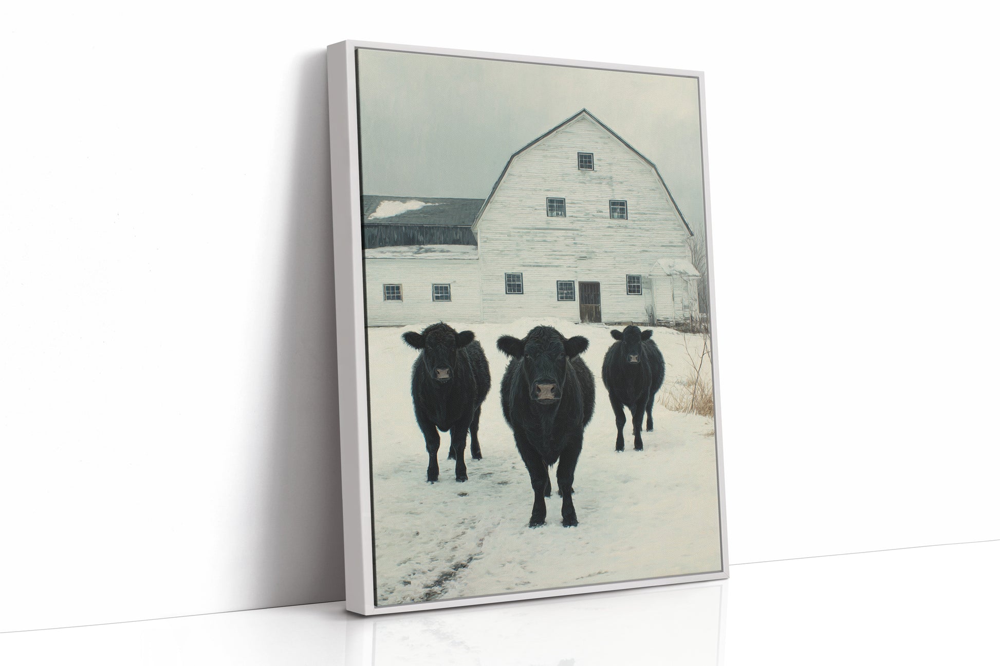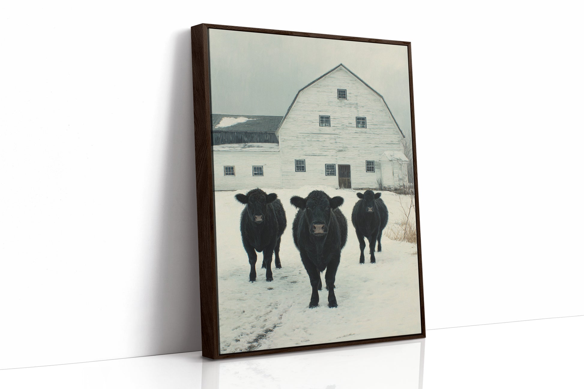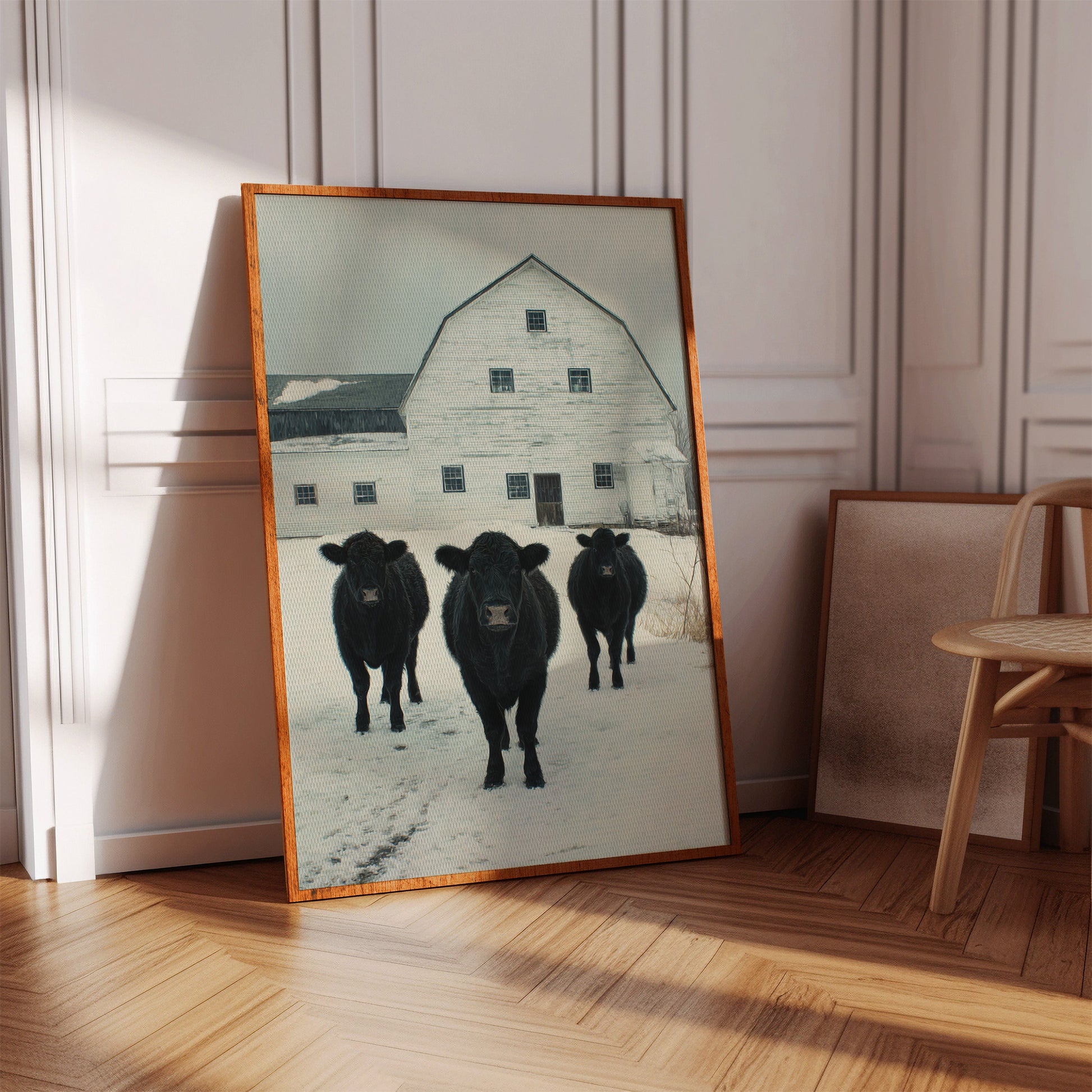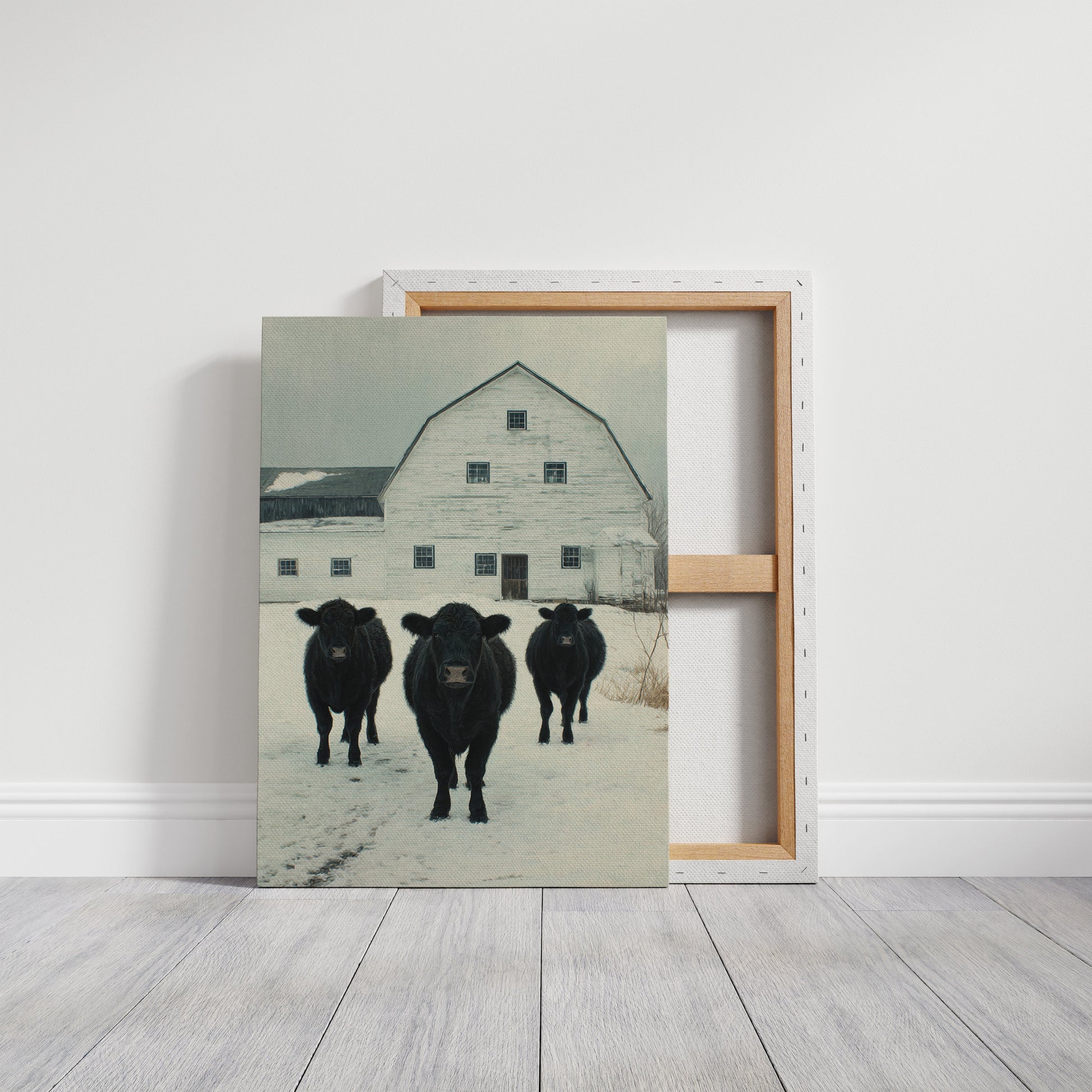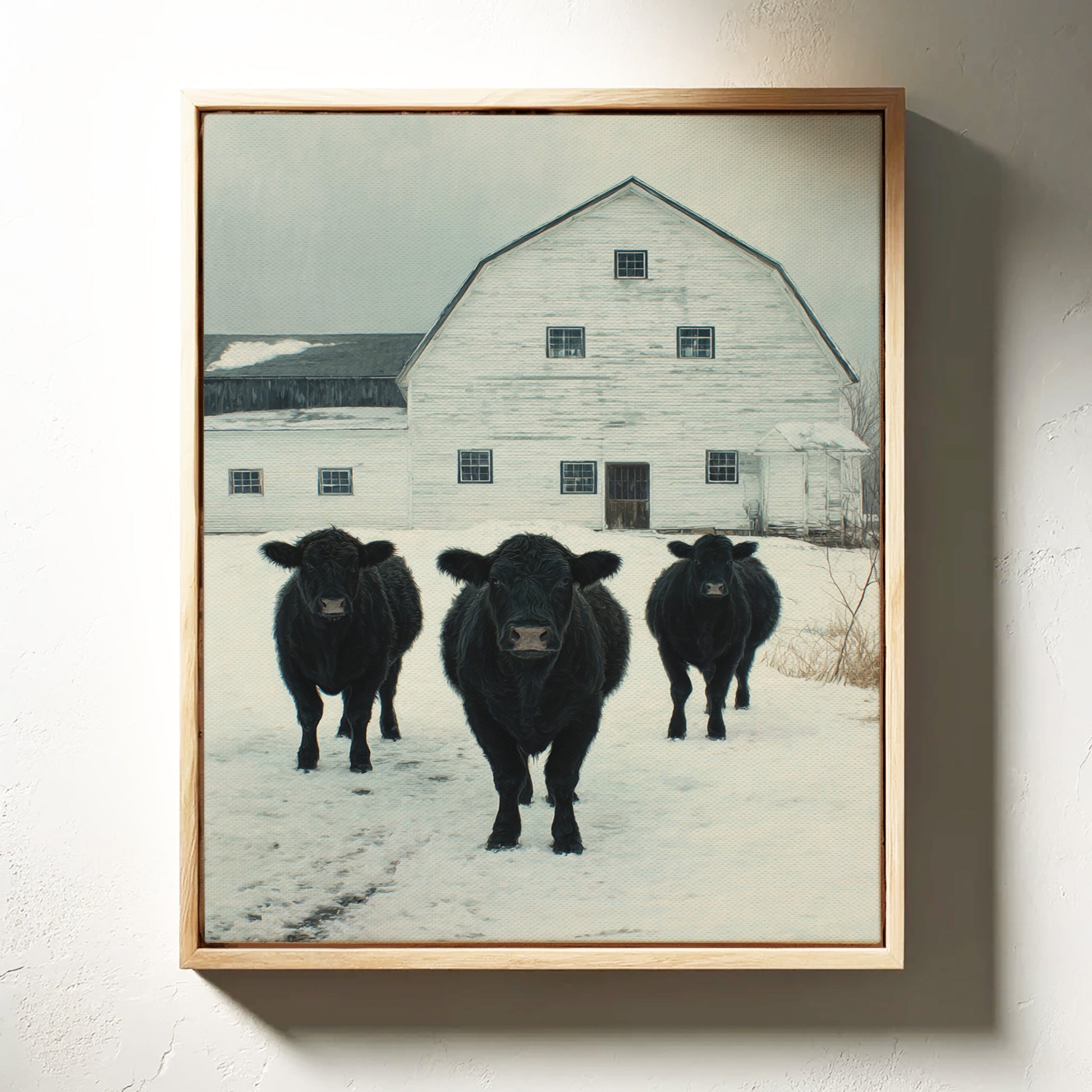 Part of our Rural Heritage collection, this tranquil scene captures the enduring beauty of American farm life in its most honest moment. The three cattle standing patiently in the snow represent generations of farming families who have found meaning in the simple act of stewardship, while the weathered barn behind them tells stories of seasons weathered and harvests gathered. The soft winter palette creates a sense of peace and continuity that speaks to our deep longing for connection to the land and simpler ways of life.