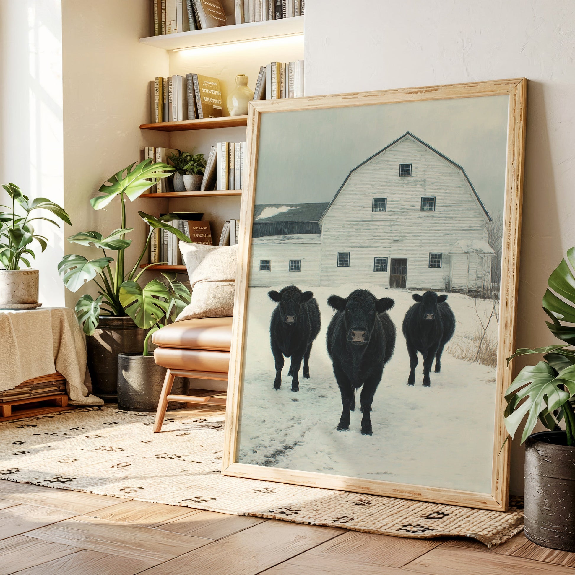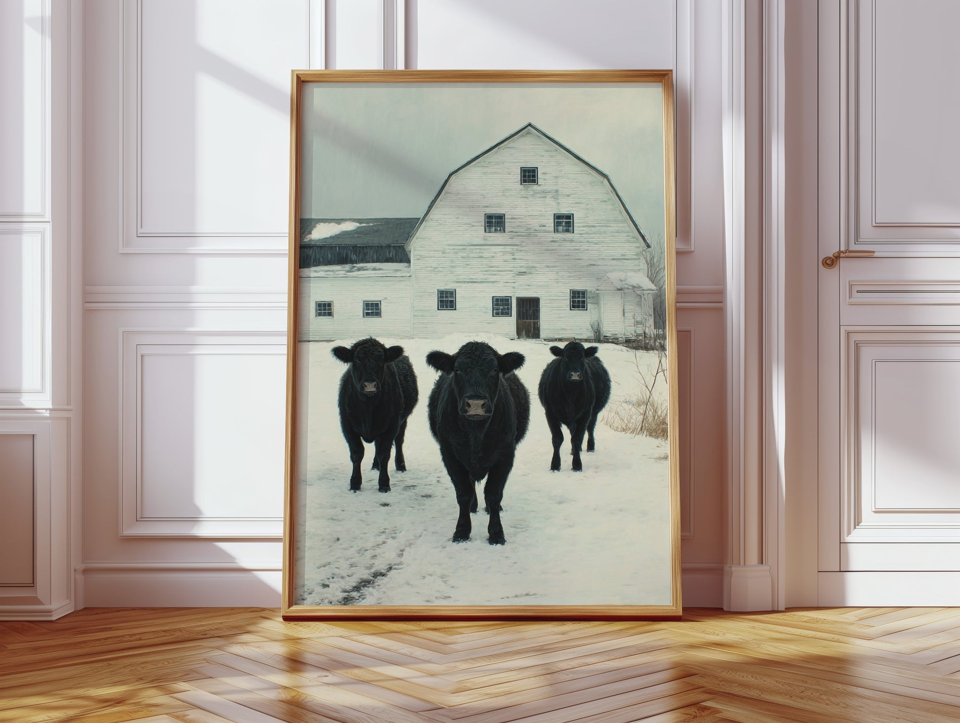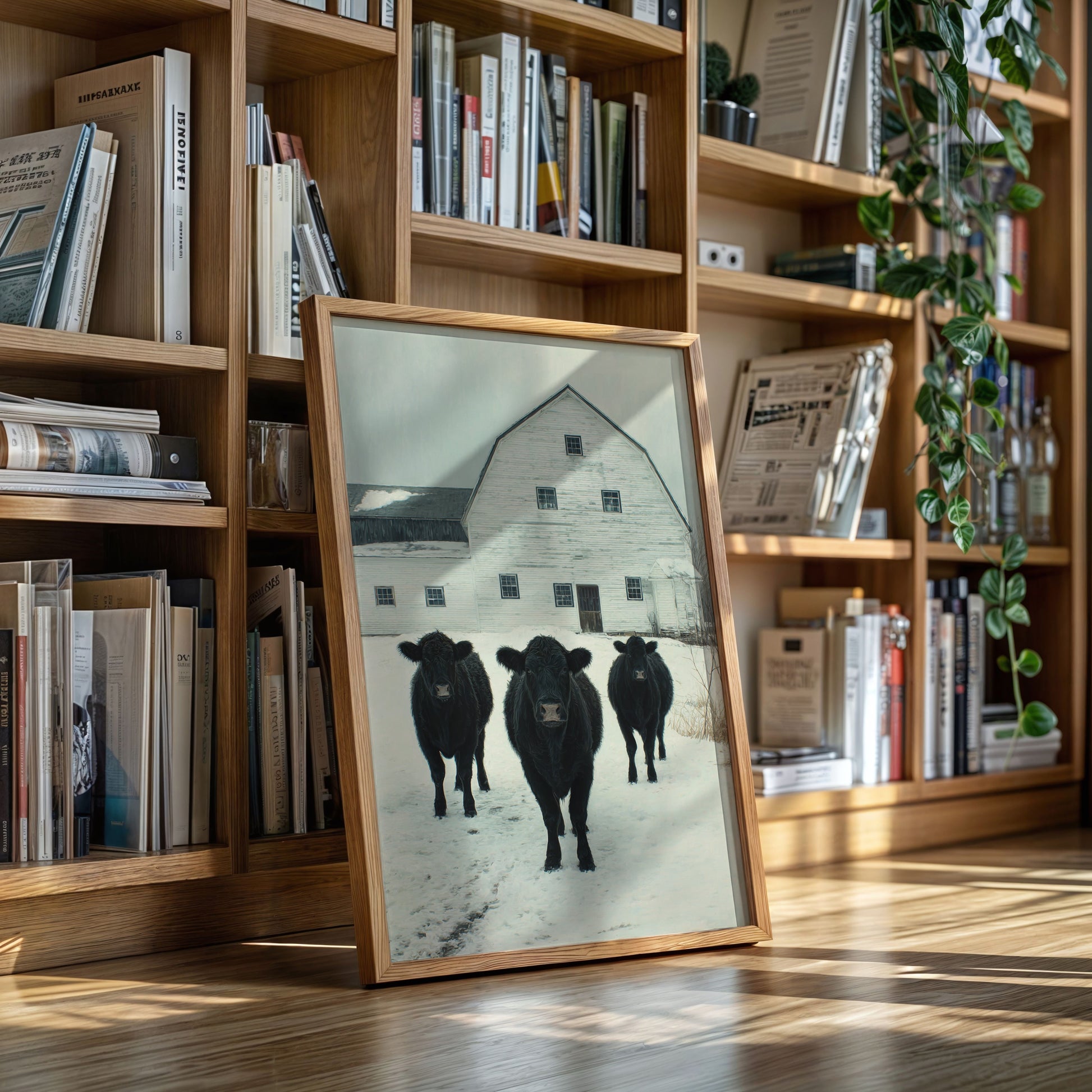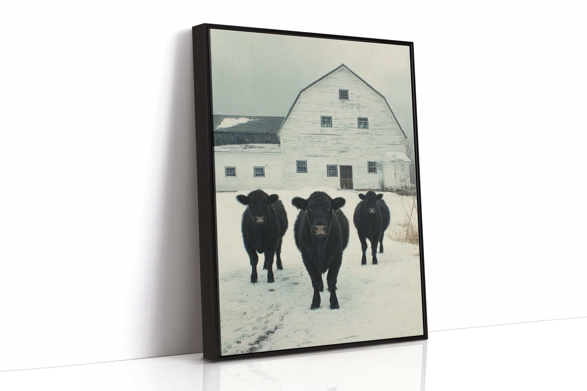 Part of our Rural Heritage collection, this tranquil scene captures the enduring beauty of American farm life in its most honest moment. The three cattle standing patiently in the snow represent generations of farming families who have found meaning in the simple act of stewardship, while the weathered barn behind them tells stories of seasons weathered and harvests gathered. The soft winter palette creates a sense of peace and continuity that speaks to our deep longing for connection to the land and simpler ways of life.