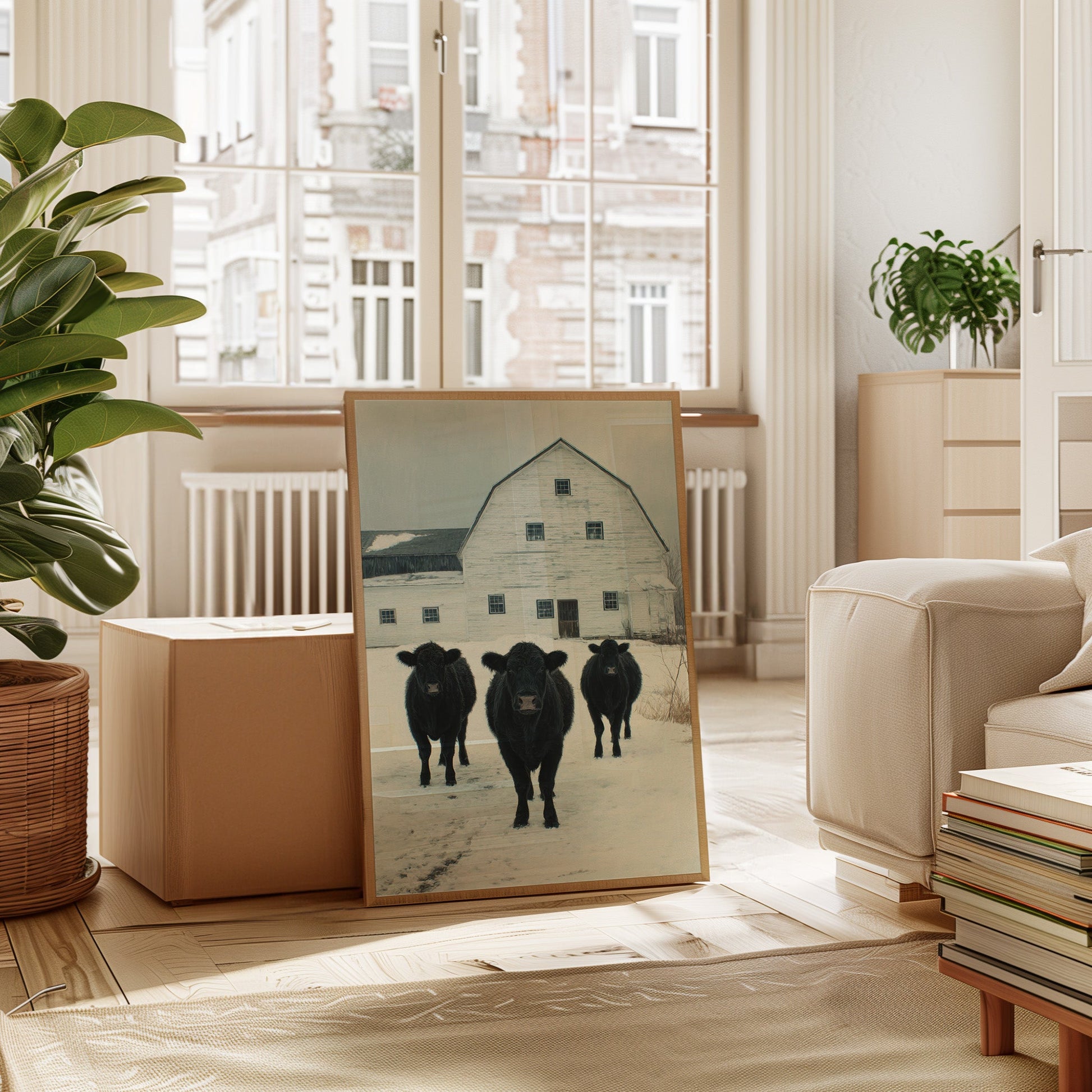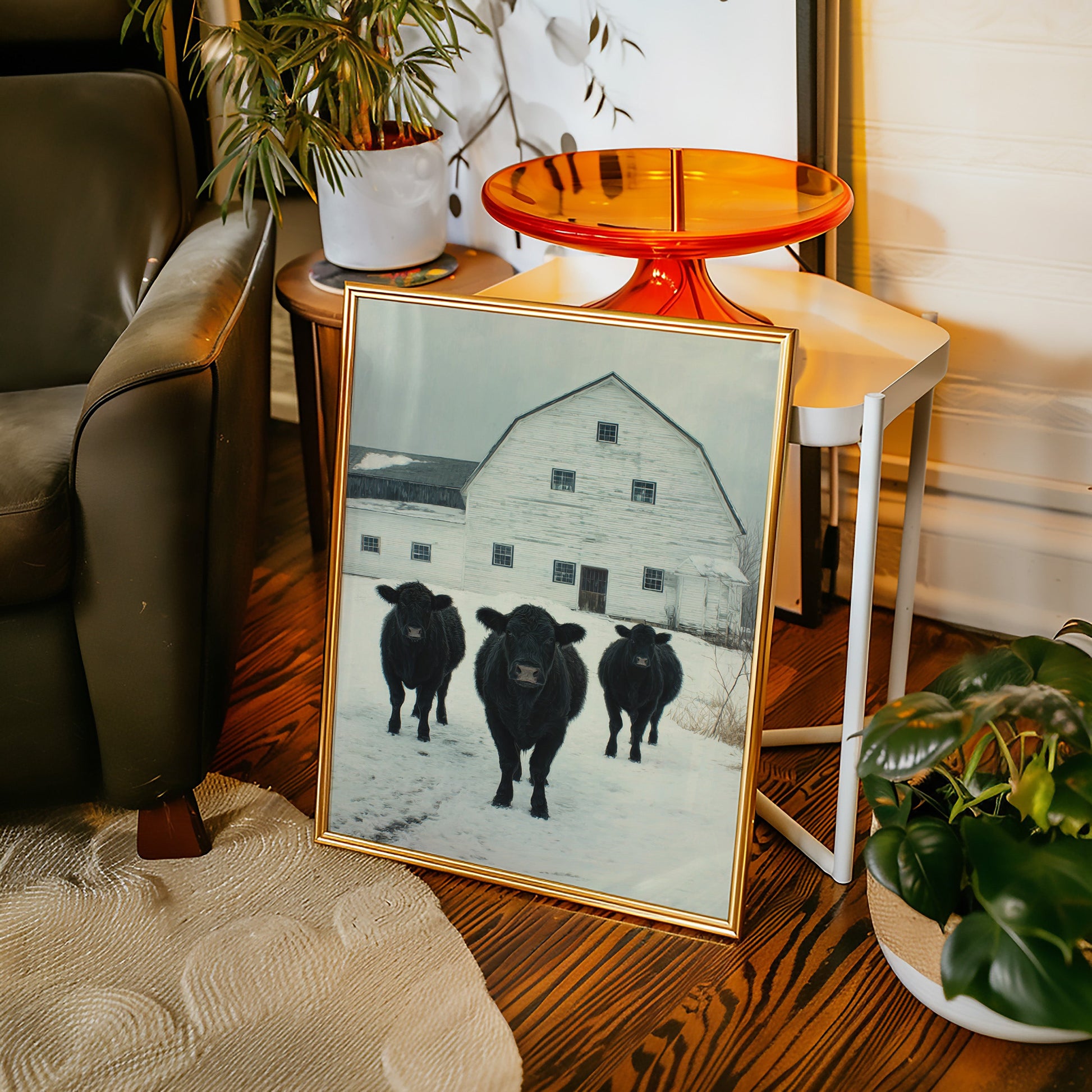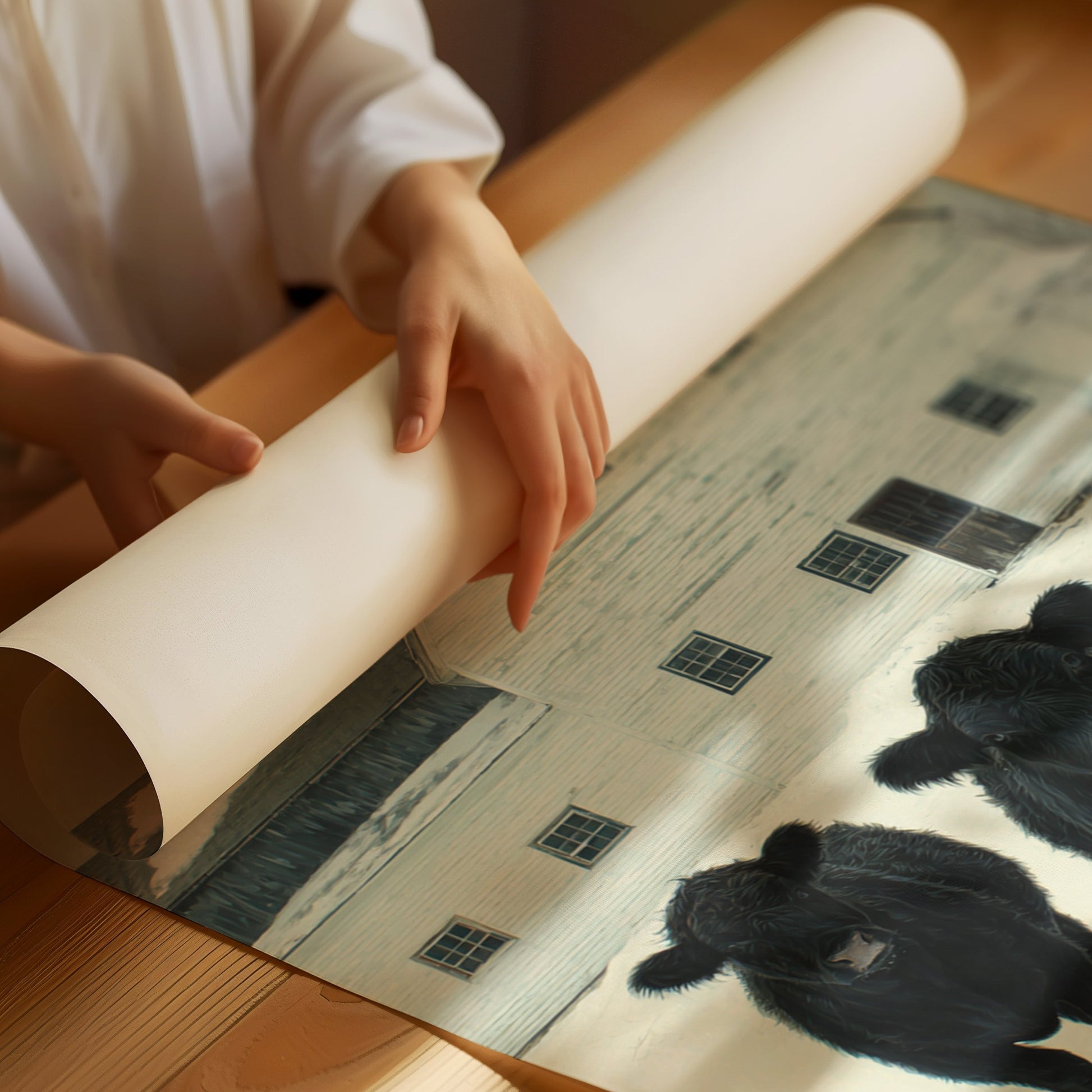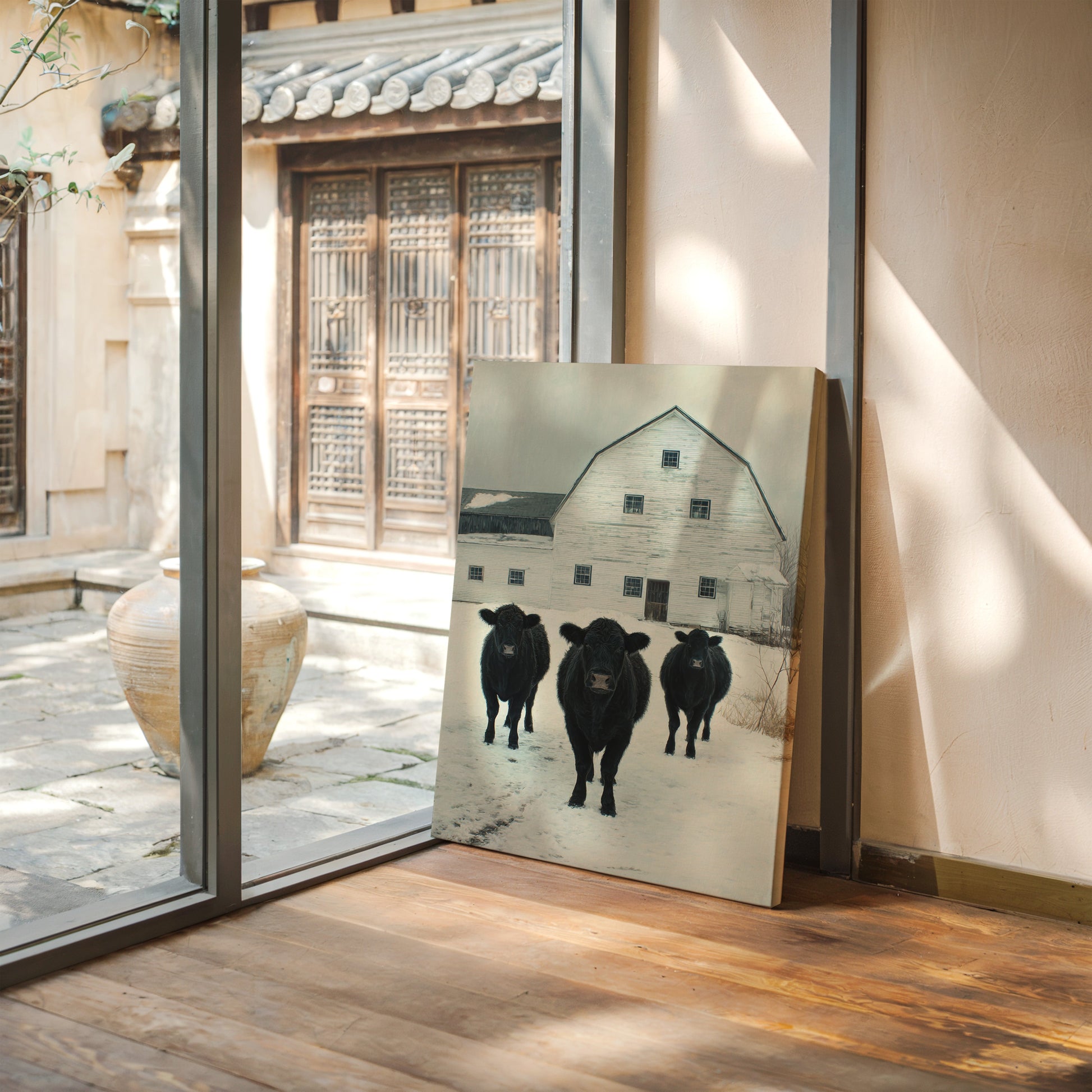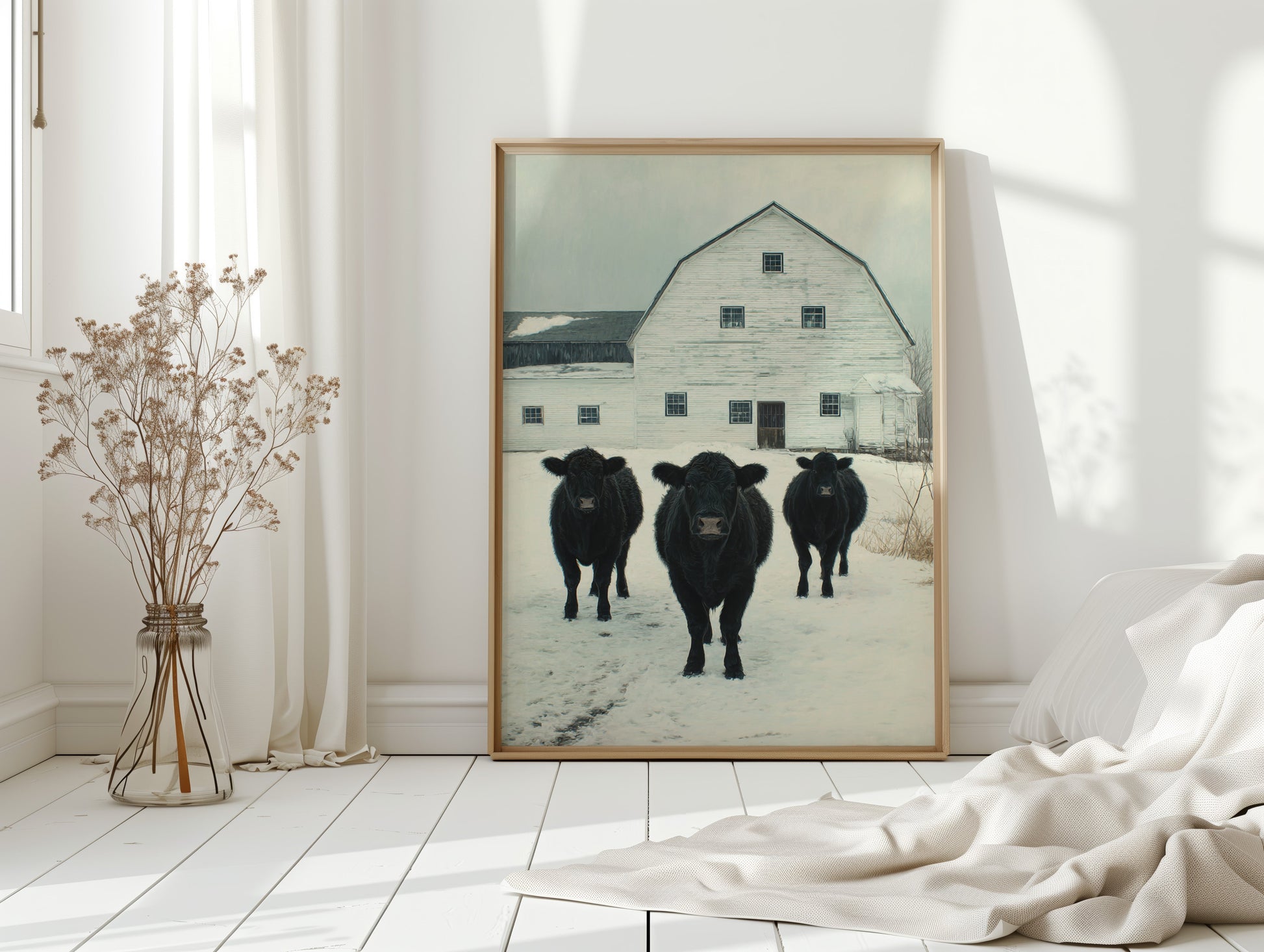 Part of our Rural Heritage collection, this tranquil scene captures the enduring beauty of American farm life in its most honest moment. The three cattle standing patiently in the snow represent generations of farming families who have found meaning in the simple act of stewardship, while the weathered barn behind them tells stories of seasons weathered and harvests gathered. The soft winter palette creates a sense of peace and continuity that speaks to our deep longing for connection to the land and simpler ways of life.