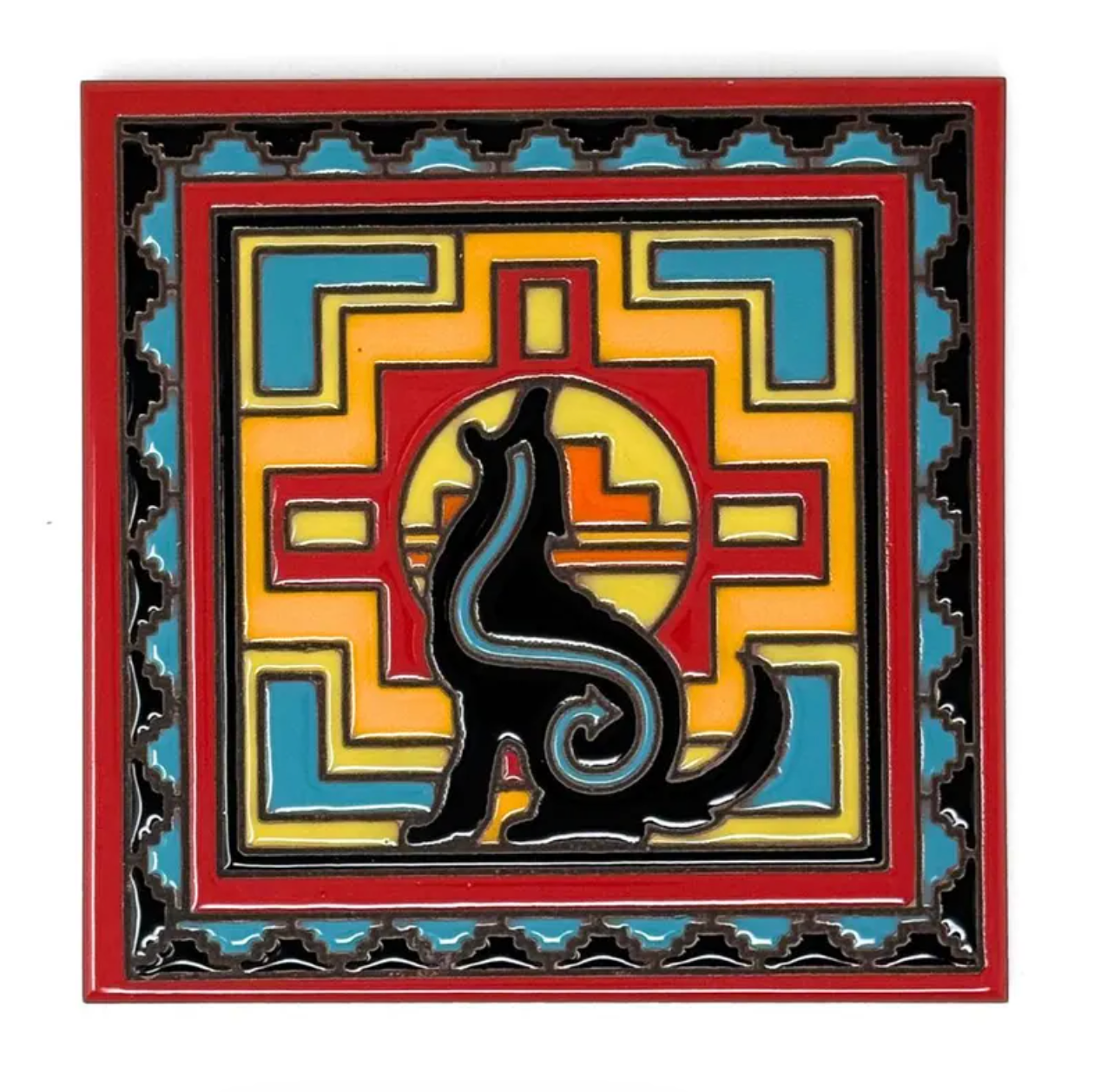 6"x6" hand glazed decorative tile with Native American Coyote design - a bold piece with red, black, yellow and turquoise in a Southwest motif.