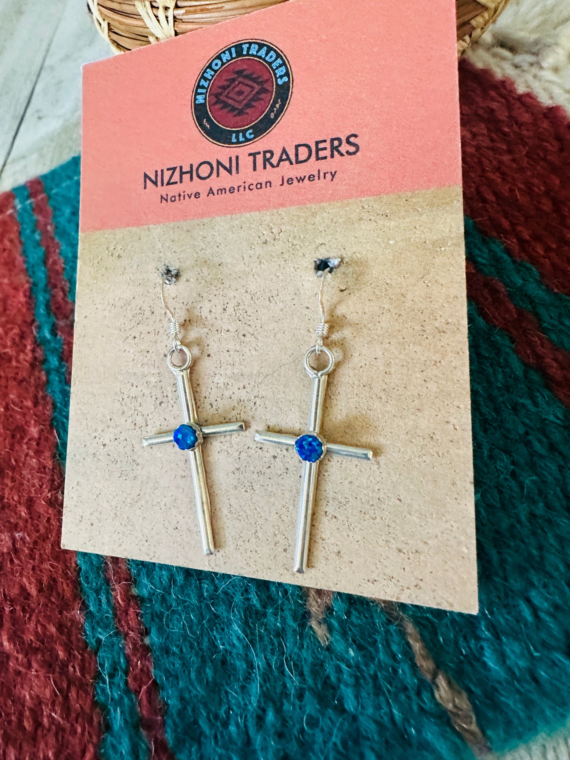 Navajo Sterling Silver & Blue Opal Cross Dangle Earrings
