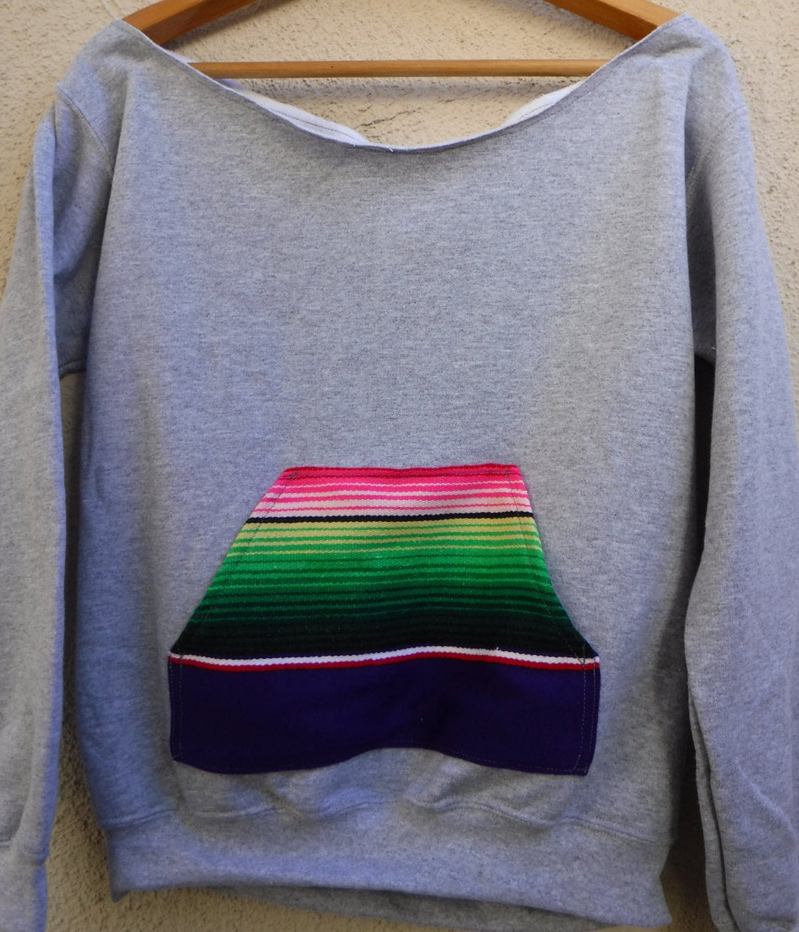 This off-the-shoulder sweatshirt has been beautifully modified with authentic serape material, to give the kangaroo pocket an ultra touchable pop of color! The neck line has been hand cut and sewn, to expose the shoulder. This is the best sweater to feel cozy and a little sexy at the same time!