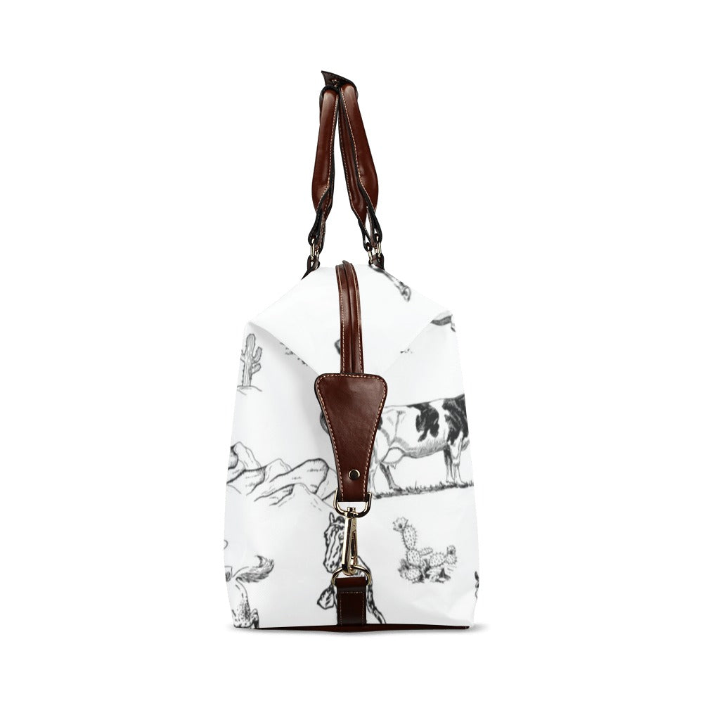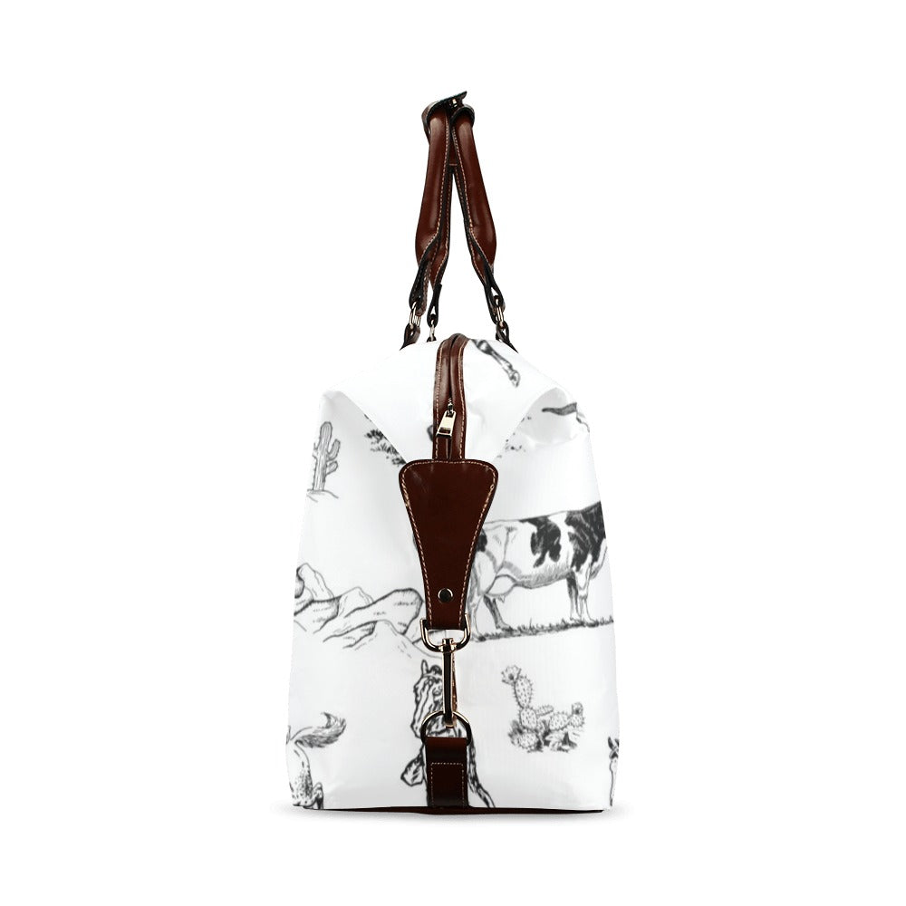Made from high-grade waterproof fabric, durable, water-resistant. without shoulder strap. One main compartment, big enough to pack your clothes, cosmetics, books and etc. This is a printed design.