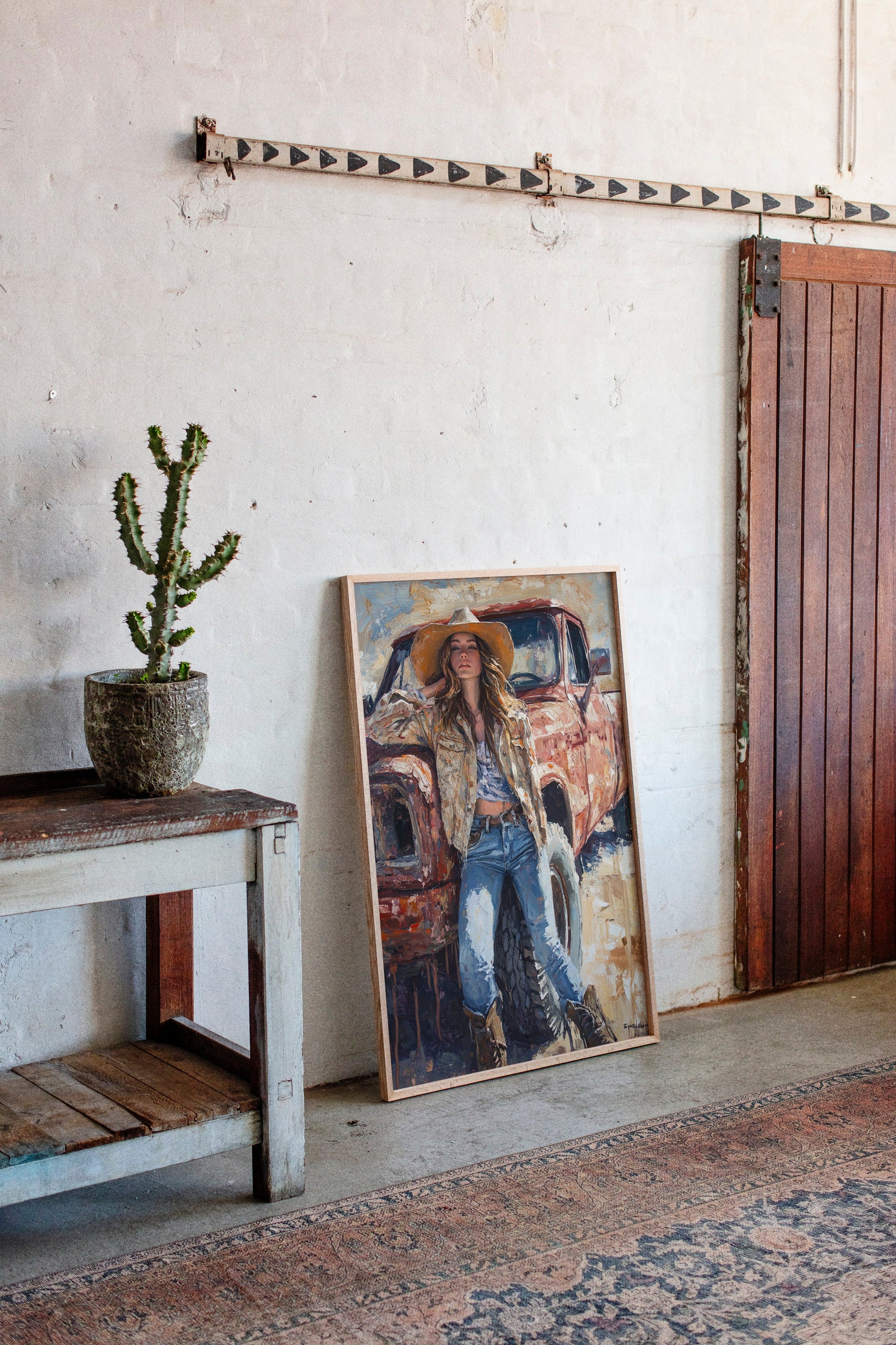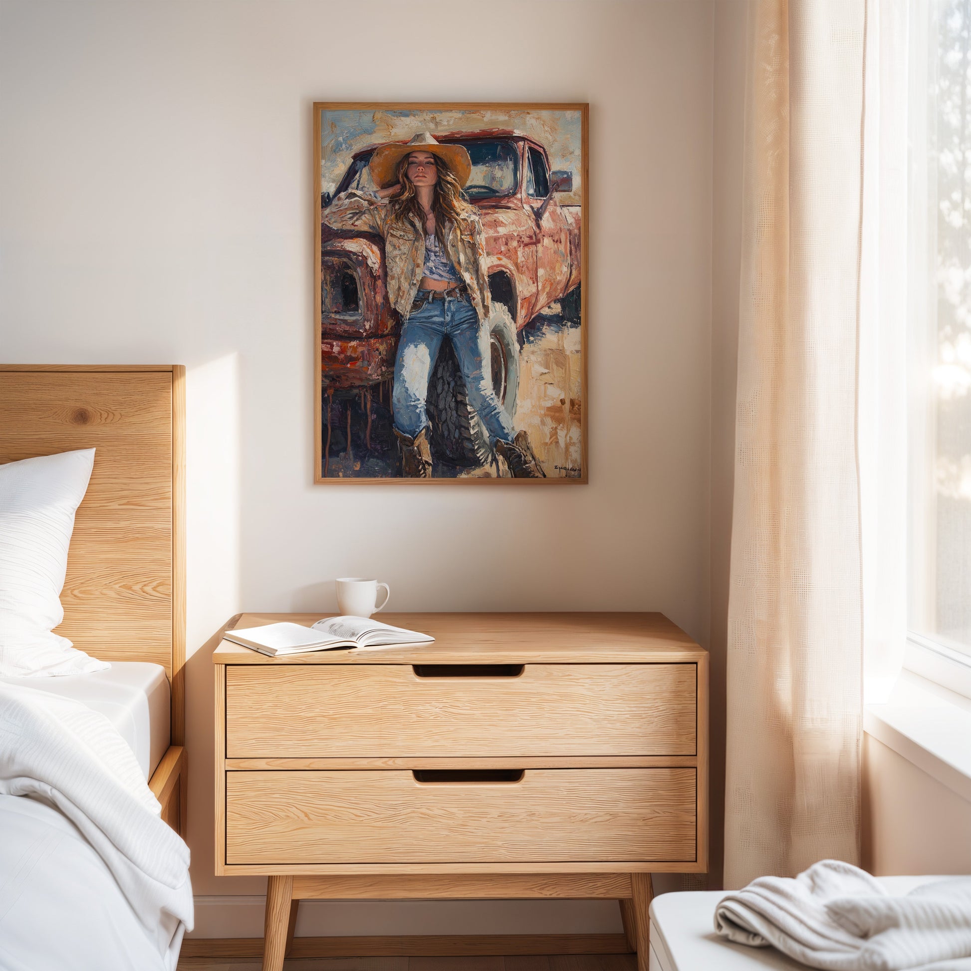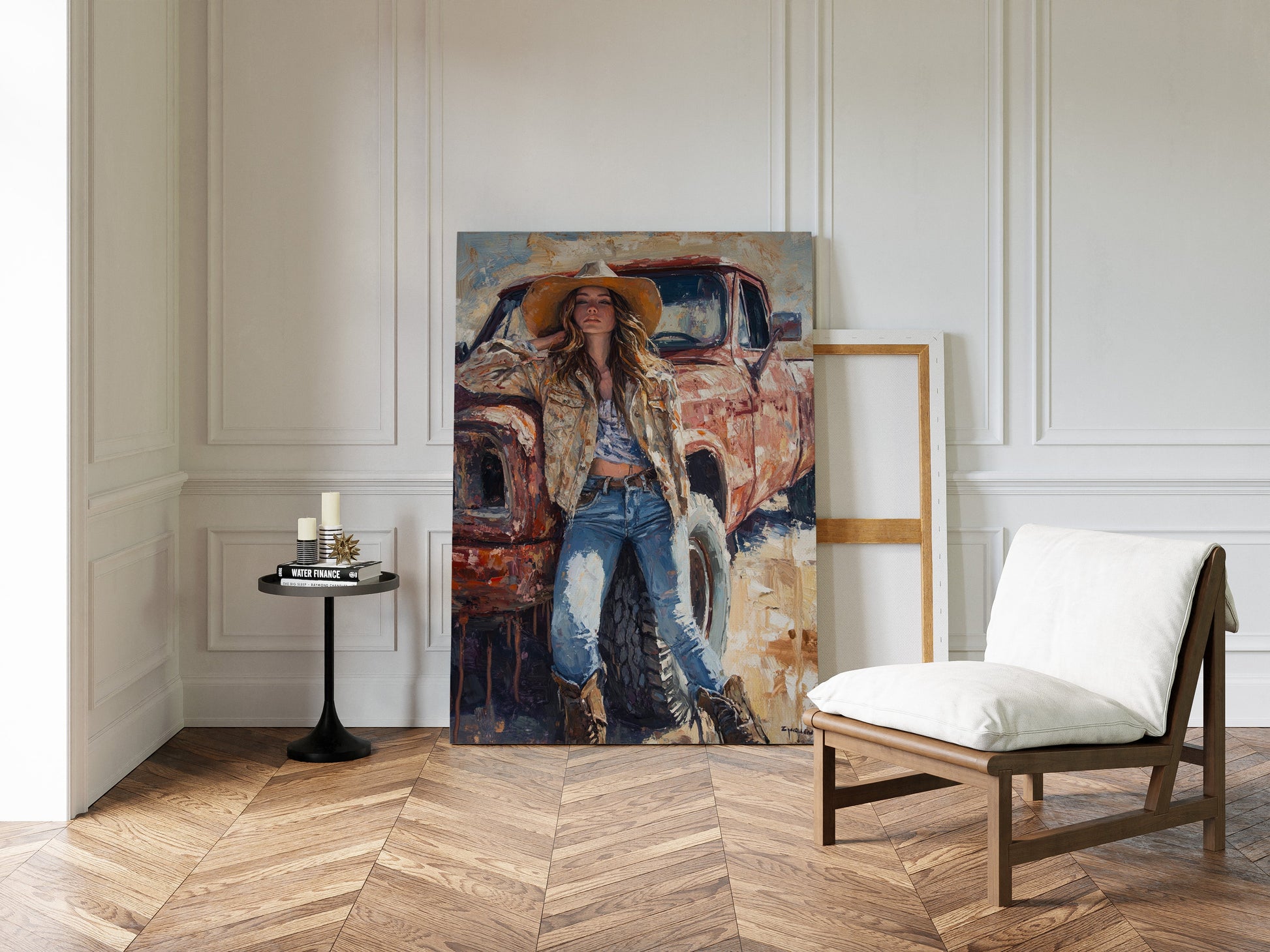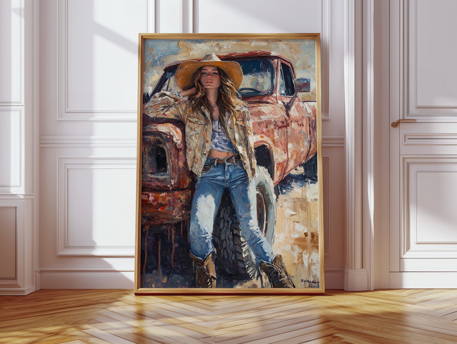 Sunlight, steel, and swagger—this textured oil painting captures a fierce cowgirl leaning against a weathered truck. Denim, dust, and attitude blaze through every stroke.