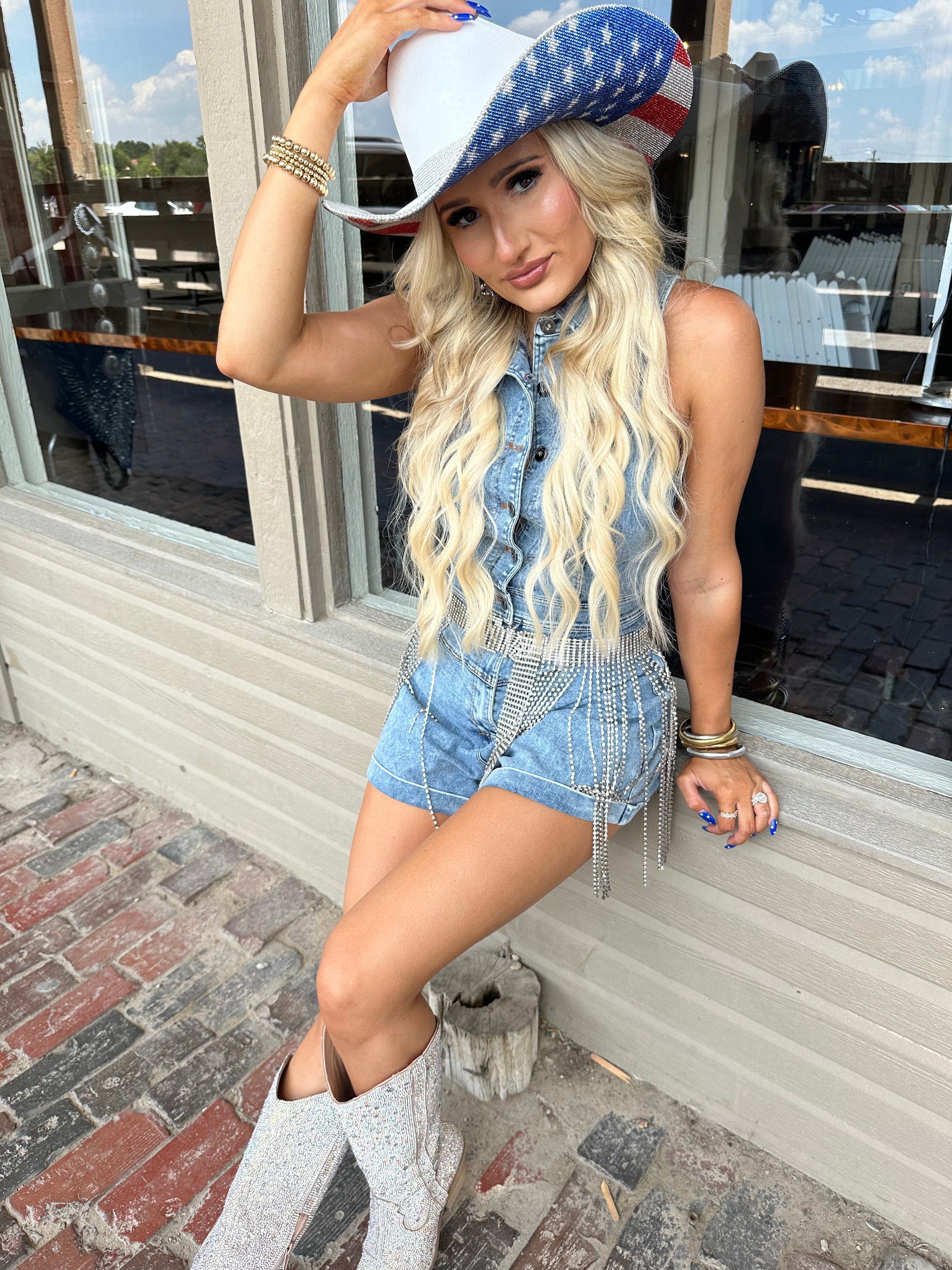 The “America” hat is perfect for your summer on the lake, BBQs, Labor day weekend, rodeos, and any events you may be attending! This hat will feature the American Flag print on the bottom. Choose whether you want crystal rhinestones on the top brim as well, or leave it plain with the crystal hat band that comes with it!