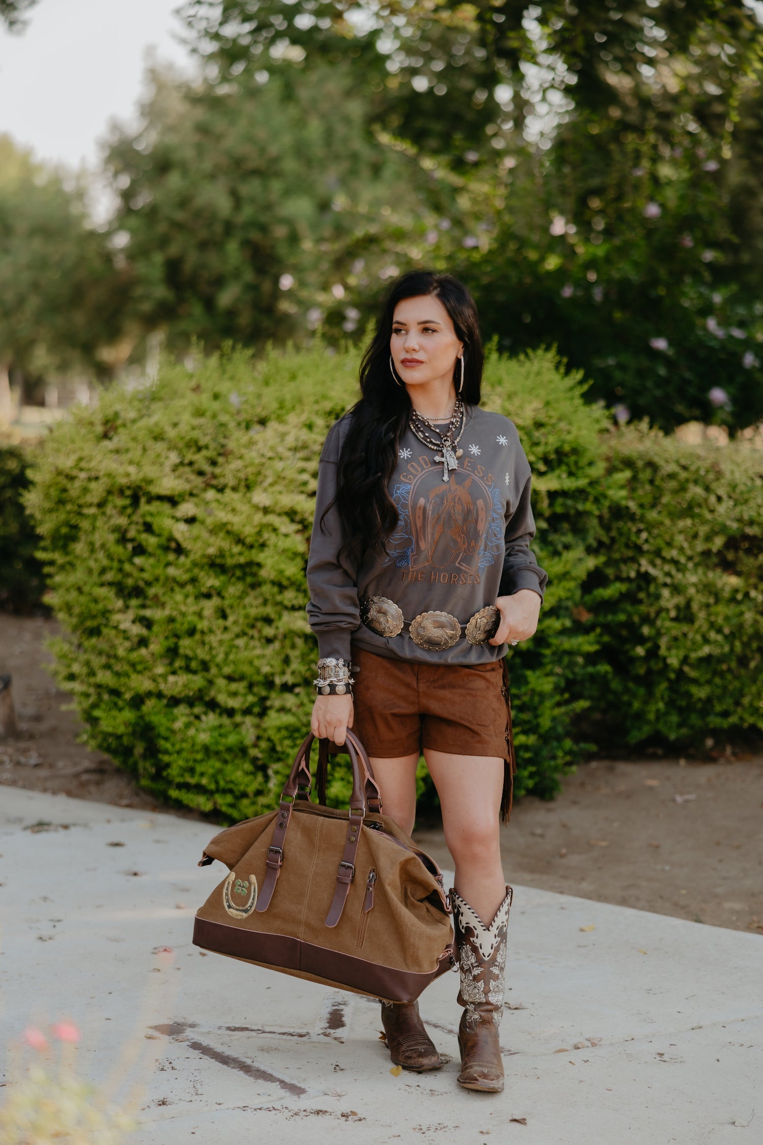 The God Bless Horses Pullover is understated and full of heart. In a deep gray hue, it features an embroidered horse and the simple, powerful words “God Bless Horses.” It’s the kind of piece that feels like a quiet prayer—worn with pride, and meant to last.