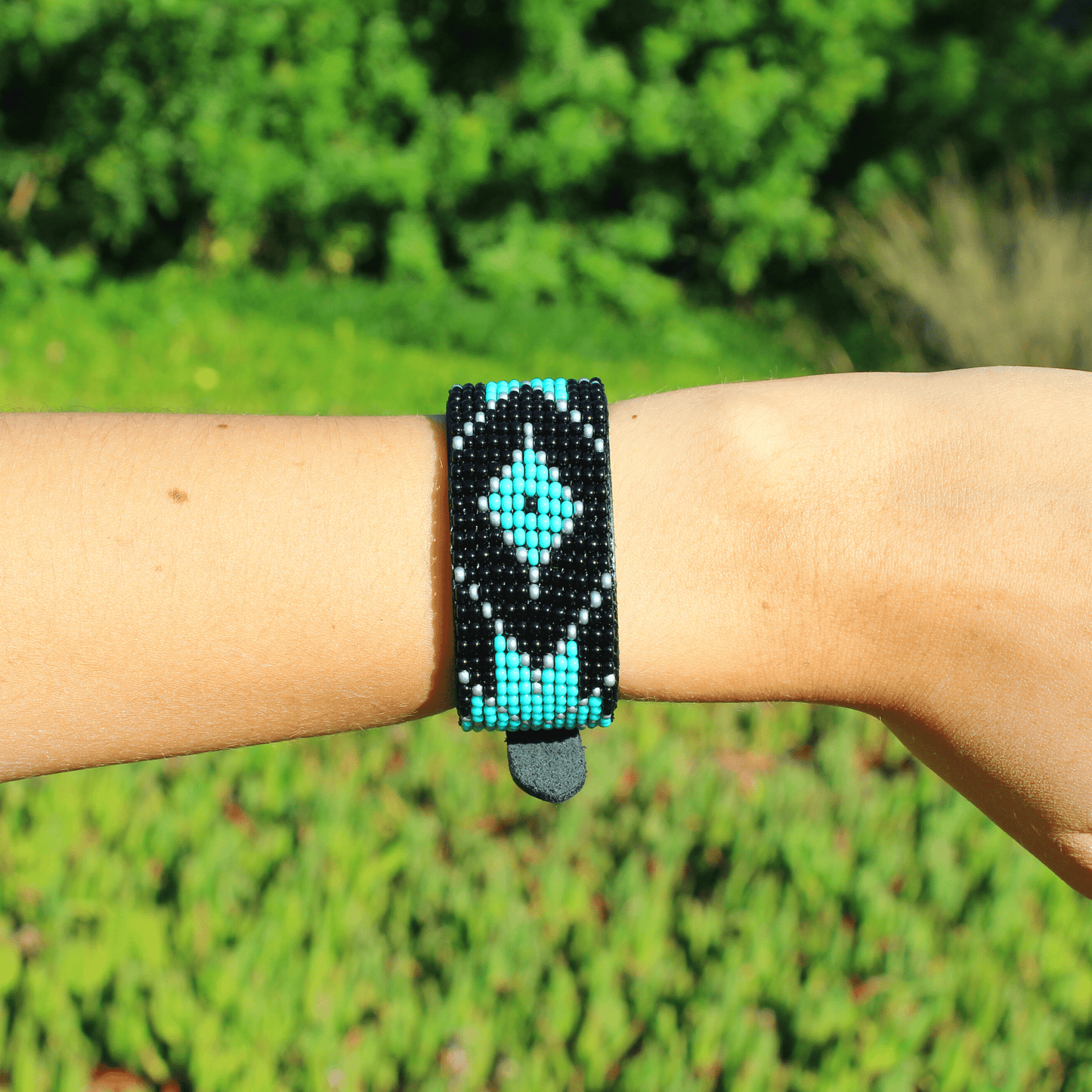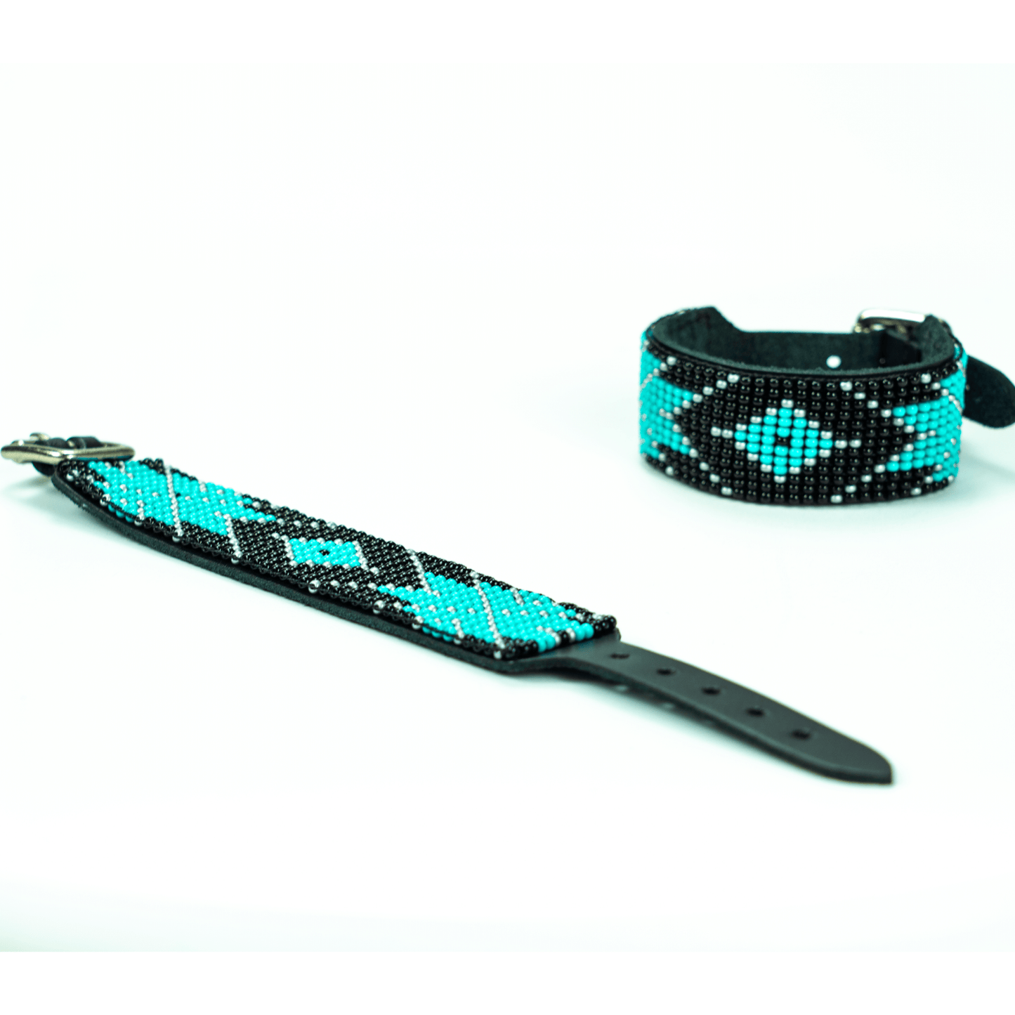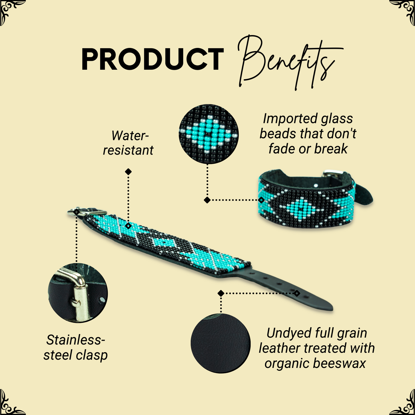 This incredible beaded bracelet from Sambboho is the perfect addition to your jewelry box. Fully handmade by female artists in Brazil. Premium leather bracelet made with world renown Slovakian glass beads. Our leather is un-dyed, full grain, and treated with organic beeswax for water resistance. Western, bohemian and native inspired designs with vibrant colors. Sustainable shopping! Your purchase allows these women to be financially independent and safe. Thank you for making a difference in their lives. This bracelet matches with the dog collar, hatband and belt from the same collection! Hypo allergenic stainless-steel closing. Flexible leather, very comfortable to wear for an extended period of time! As always, your purchase comes with a 30-days return policy and a 1-year warranty. Fast free shipping from the US.