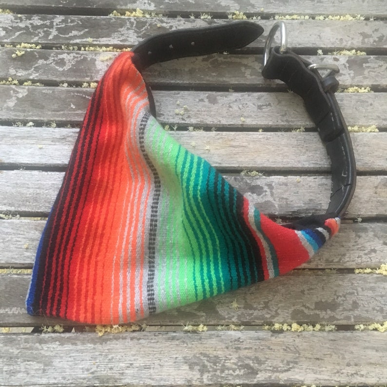This gorgeous serape dog bandana is bound to make your favorite pooch even more adorable! Made with real serape Mexican blanket (and fully backed for support) the colors are vibrant and eye-catching!