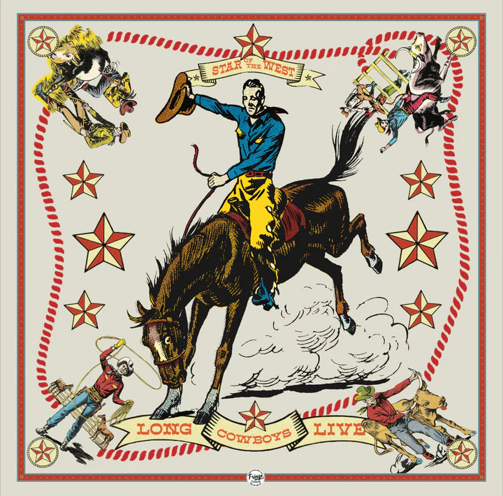 The Star Of The West is a 100% Satin Silk wild rag that has a BIG retro vibe to it! Vintage cowboy graphics with rope border and stars highlighting corners. This is a fun one and will last for years to come!