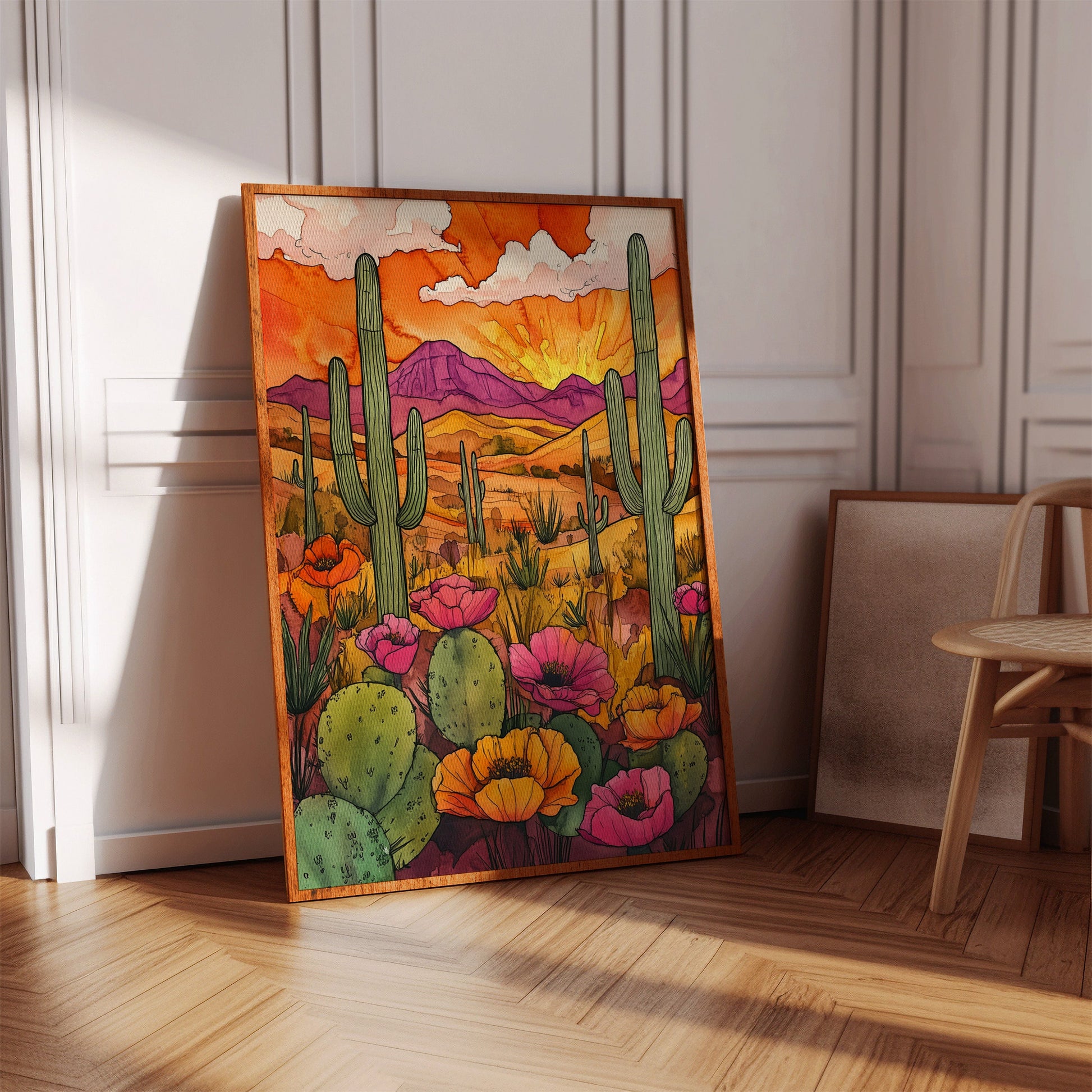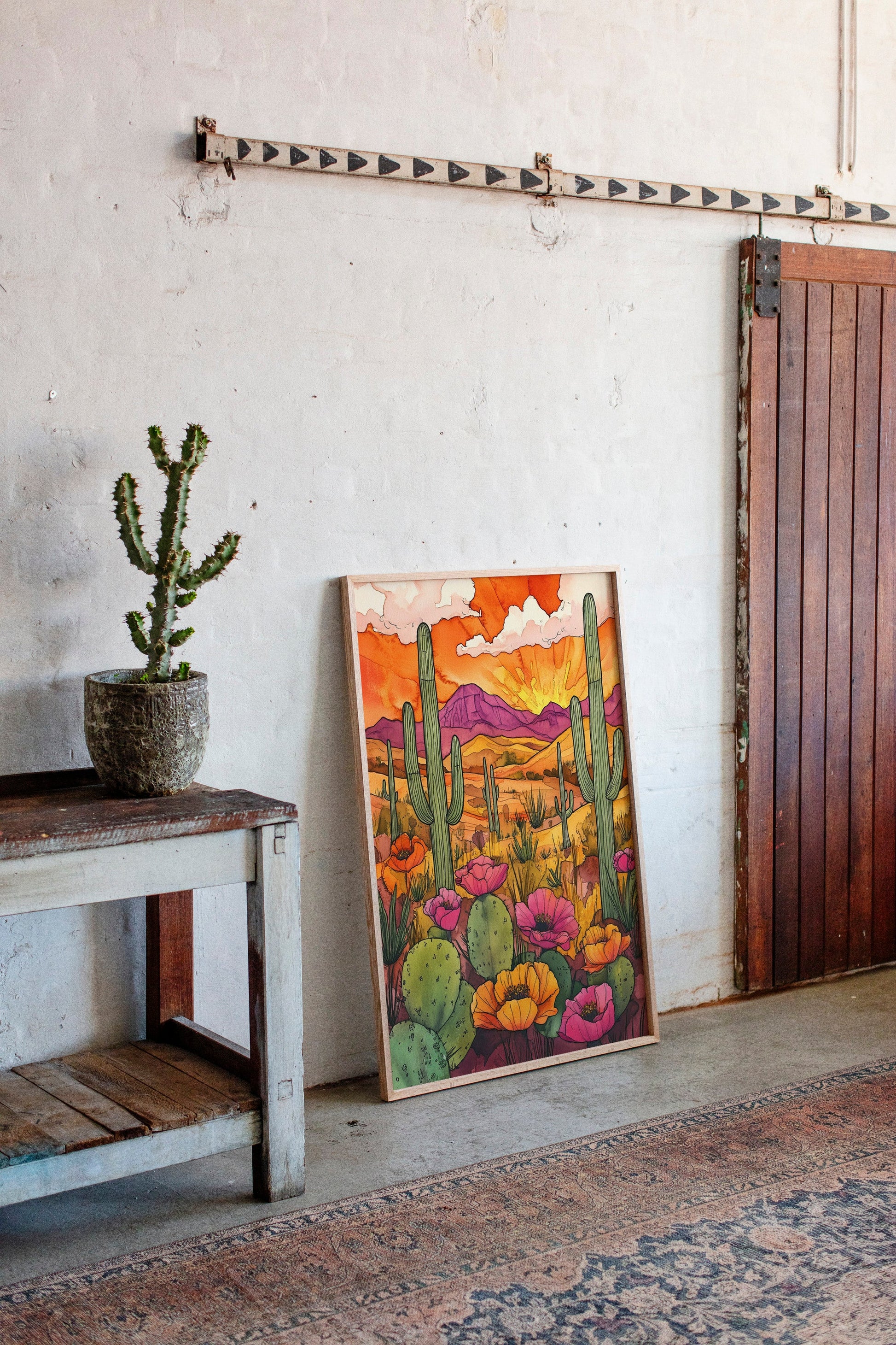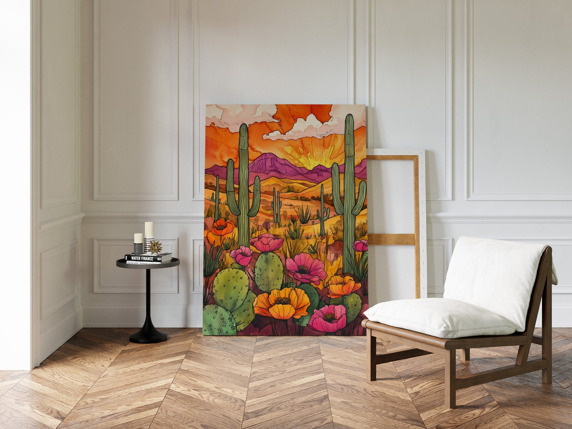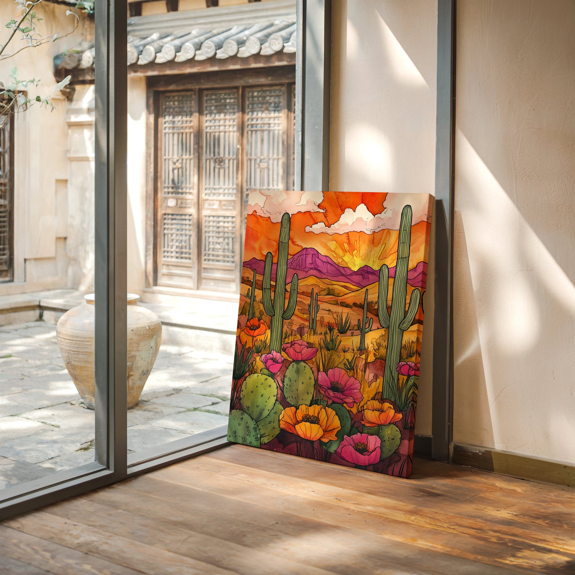 A vibrant sunset casts a warm glow over a desert landscape, where cacti and wildflowers thrive in vivid colors. Part of our Eclectic Bohemian collection, this piece captures the spirit of untamed beauty and adventure. Perfect for brightening up living rooms, study areas, or creative spaces. Each artwork is crafted with meticulous attention to detail, bringing the desert's allure into your home. SKU: AL0778
